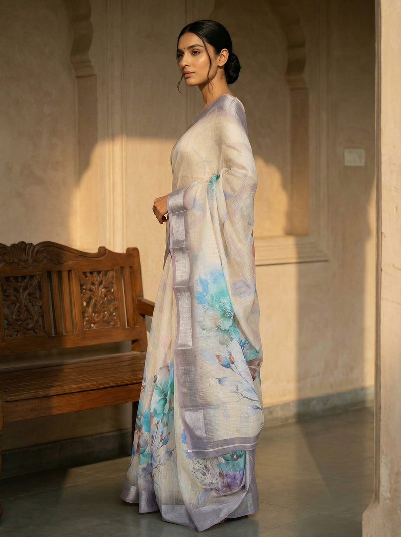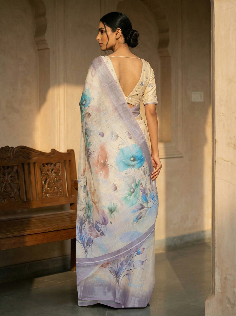 This elegant pastel yellow saree features soft watercolor-inspired floral prints in soothing shades of blue, teal, and peach, creating a graceful and contemporary look. Crafted from lightweight polyester, the fabric offers a smooth texture with a fluid drape that enhances comfort and ease of wear. The subtle lavender-toned border adds a refined contrast, perfectly complementing the delicate floral design. Ideal for daytime occasions, office wear, and casual gatherings, this saree reflects understated elegance with modern charm.
