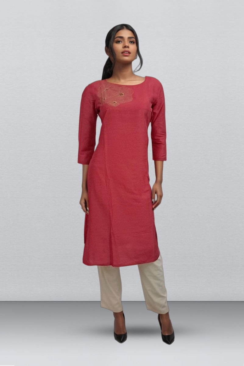 Peach Color Raw Cotton Kurti With Thread & Sequence Work