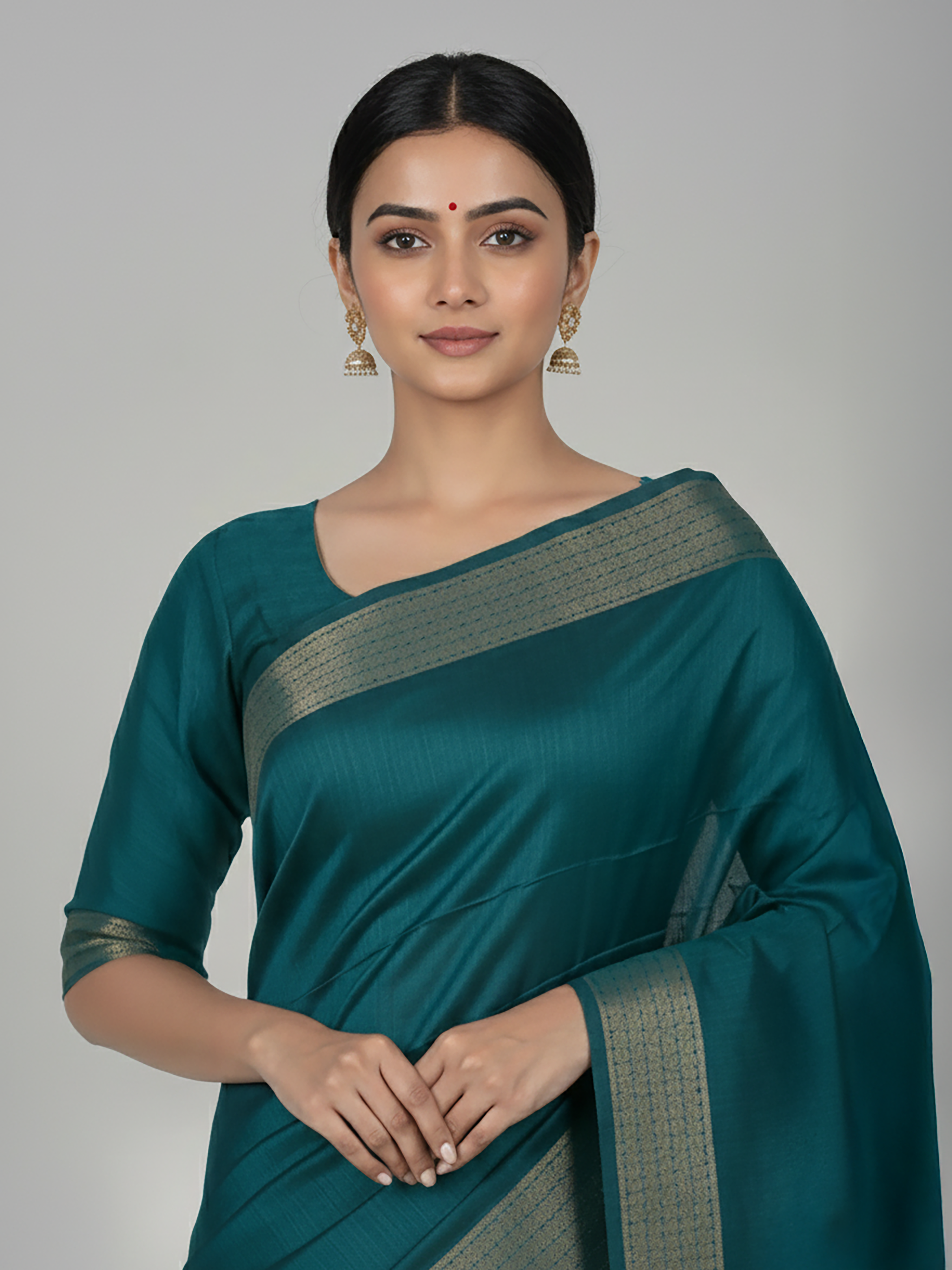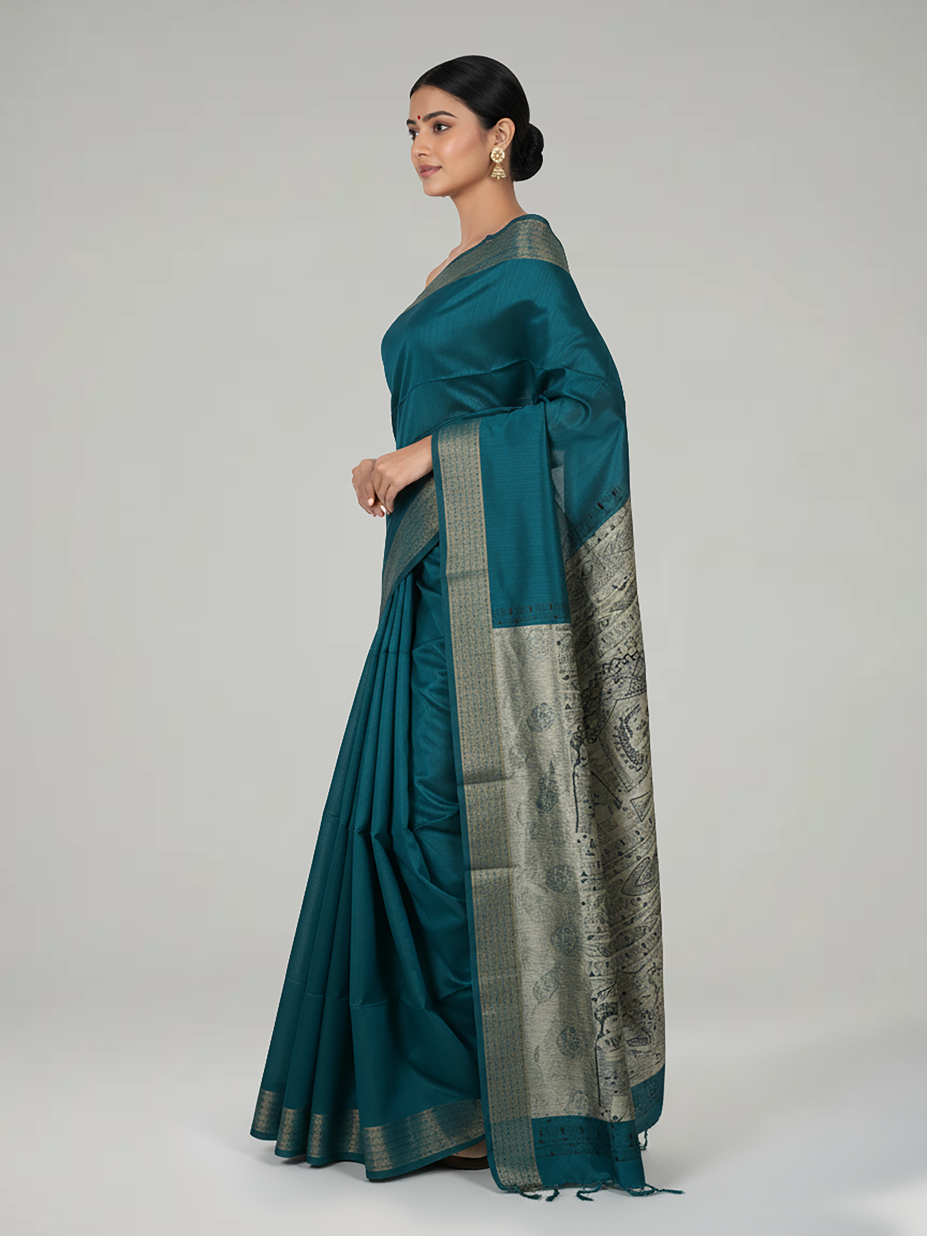 Peacock Blue semi Jute Silk Saree With Contrast printed Pallu