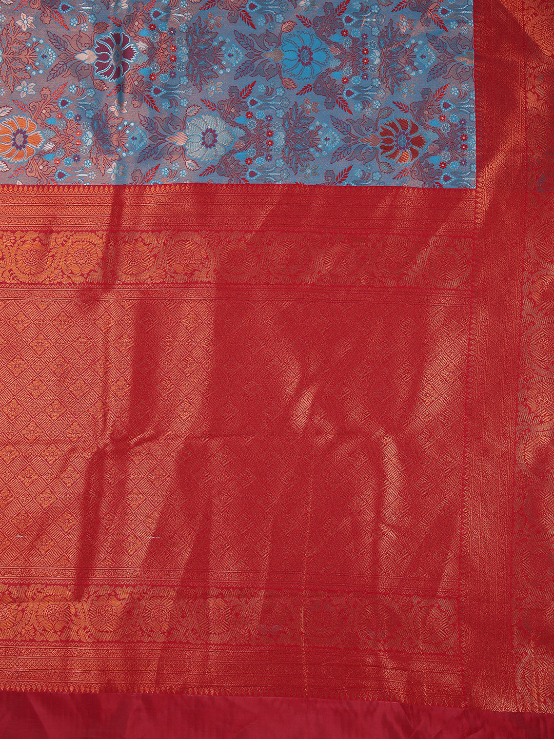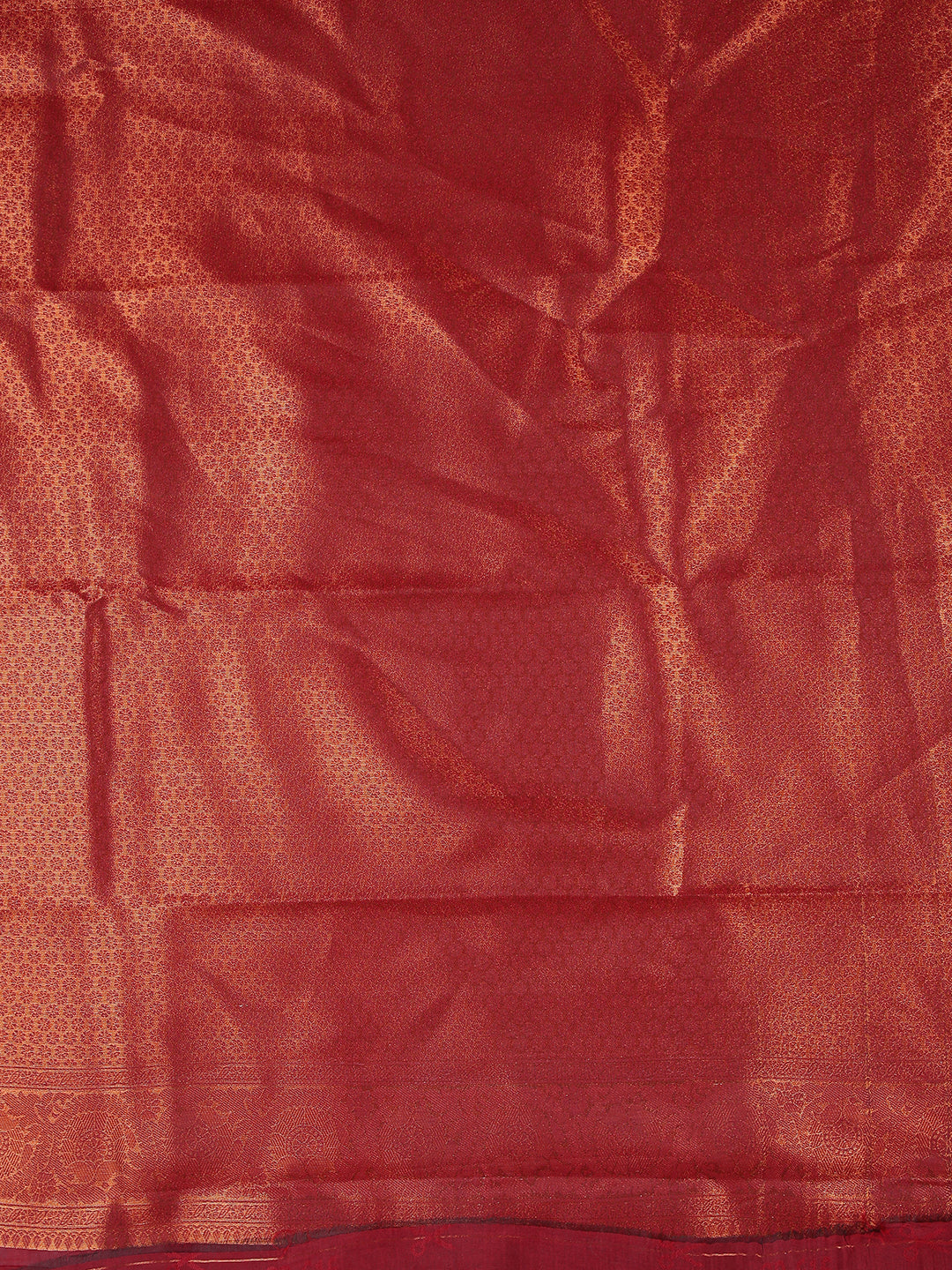 Peacock Blue With Copper Tissue Saree With Floral Design And Dark Red Border