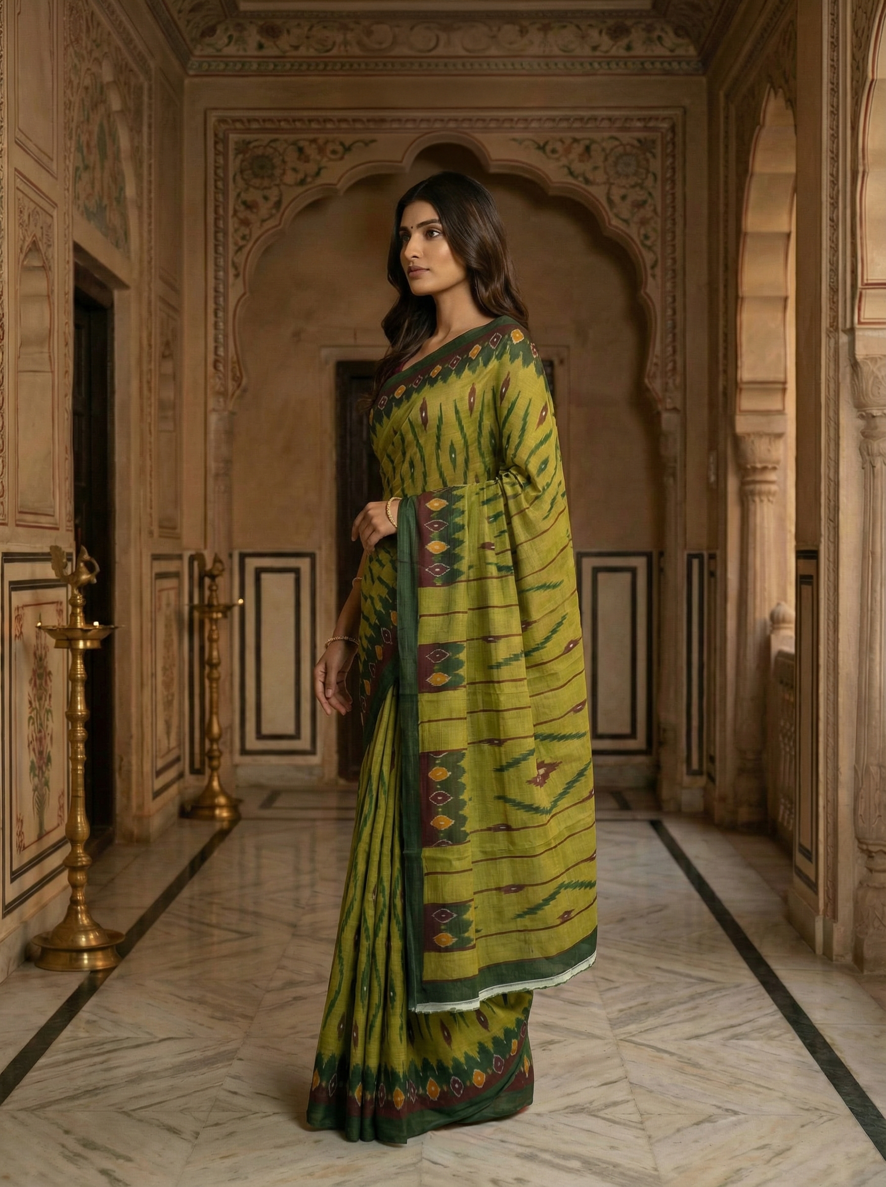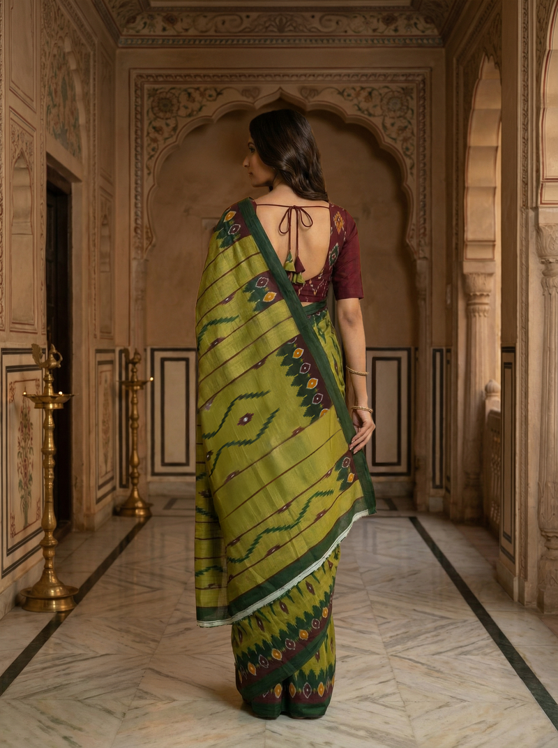 Pear Green Ikat Cotton Saree with Traditional Geometric Motifs