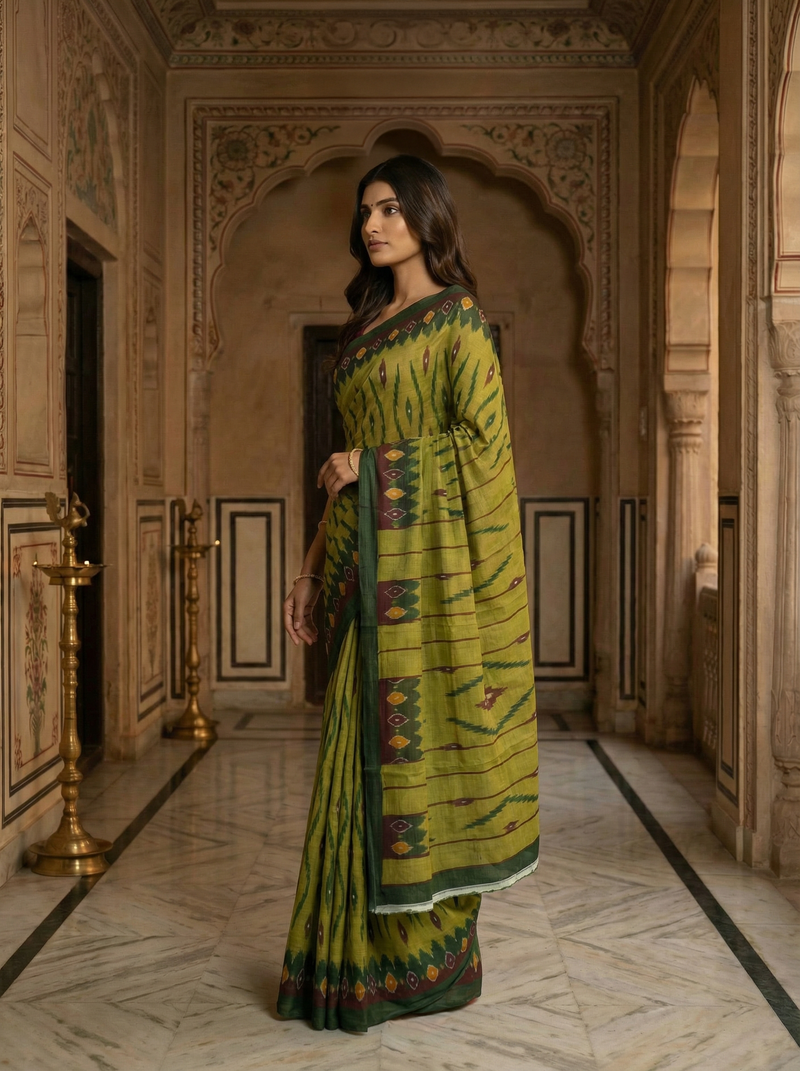 Celebrate timeless handloom artistry with this elegant Mustard Green Ikat Cotton Saree. Crafted in soft, breathable cotton, the saree features classic ikat-inspired geometric and wave motifs across the body, complemented by a contrasting deep green border and pallu. The earthy mustard tone paired with traditional patterns makes it a versatile choice for everyday elegance, office wear, cultural gatherings, and festive occasions. Light in weight and easy to drape, this saree blends comfort with heritage charm.