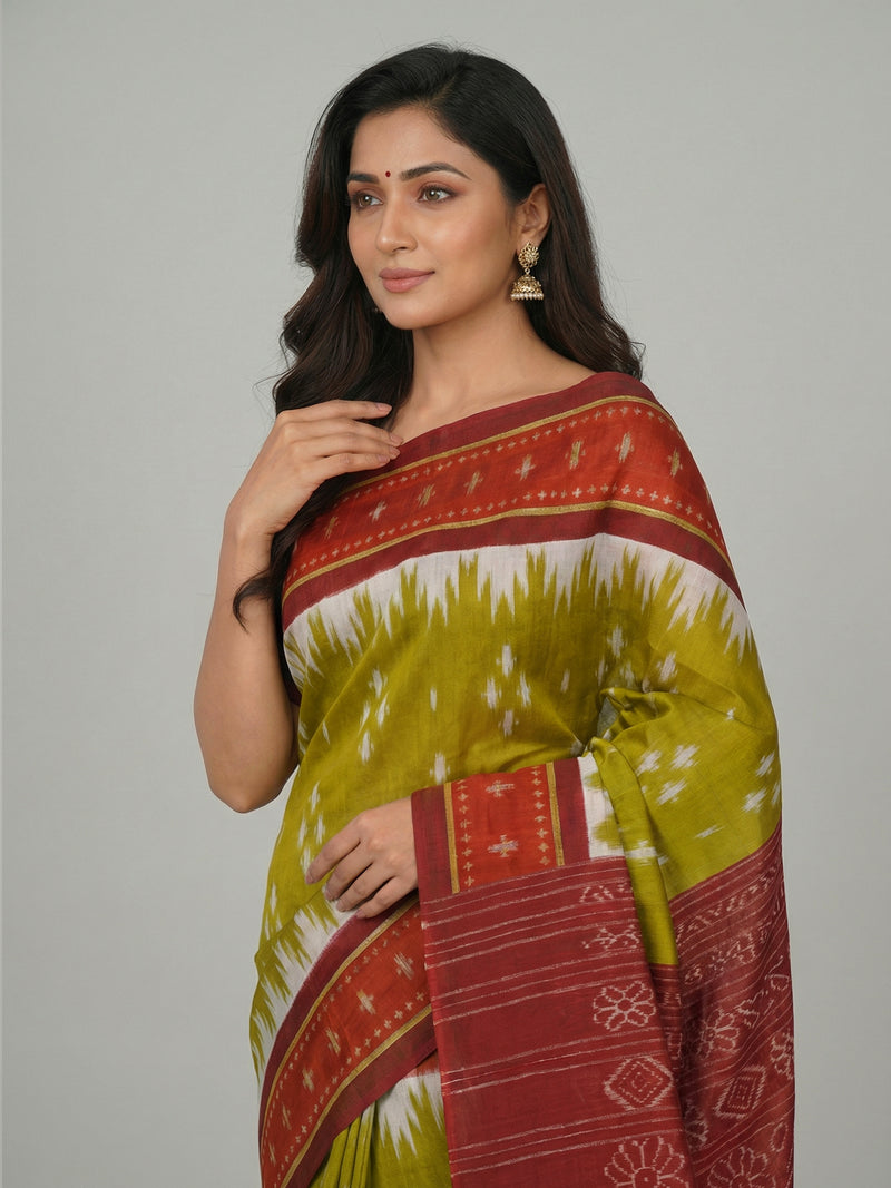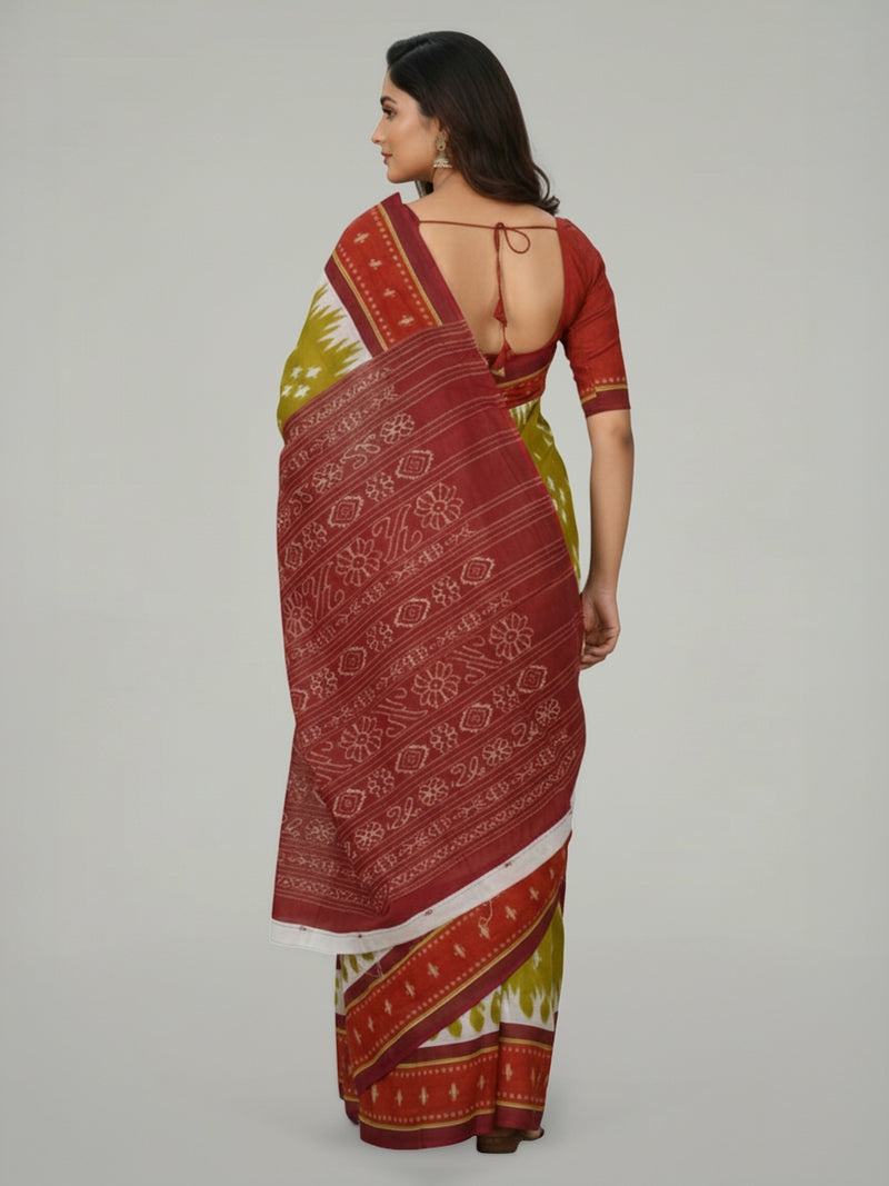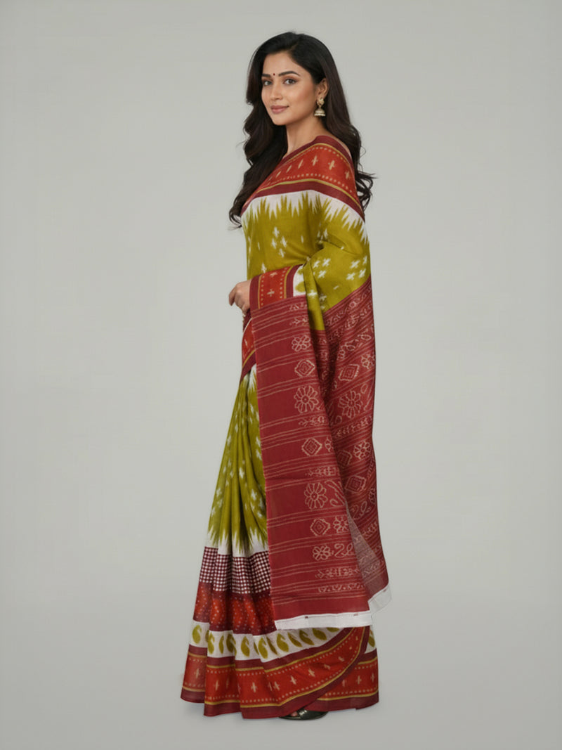 This pear green soft cotton saree presents a calm, composed, and refined aesthetic, perfect for elegant everyday dressing. The body features ikkat-inspired prints that bring artistic texture to the drape, while the contrast maroon printed pallu adds a rich, striking complement. The saree is framed with a contrast border adorned with ikkat patterns, enhancing its visual depth and structure. Paired with a maroon printed blouse, the ensemble achieves a harmonious blend of colour and craftsmanship.