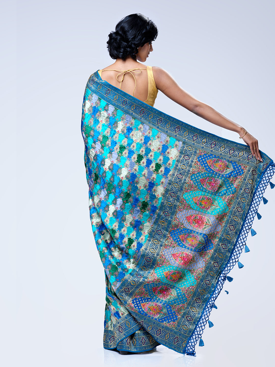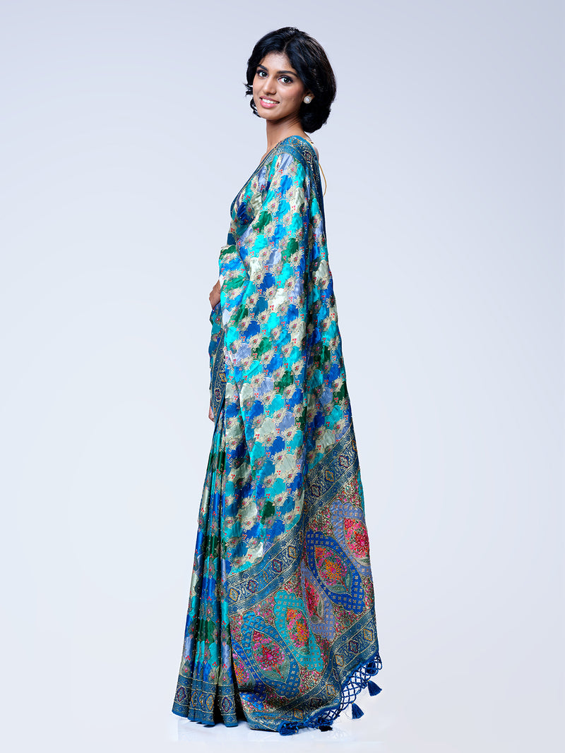 Color :Multi Color ( Outlined In Golden Or Metalic Thread And Filled With Floral Embroidery In Shades Of Pink, Orange & Green)