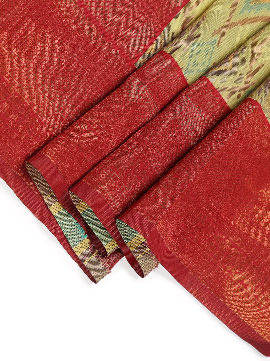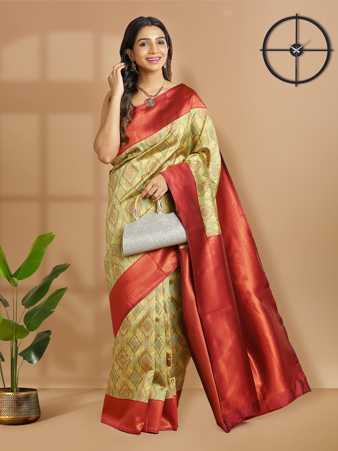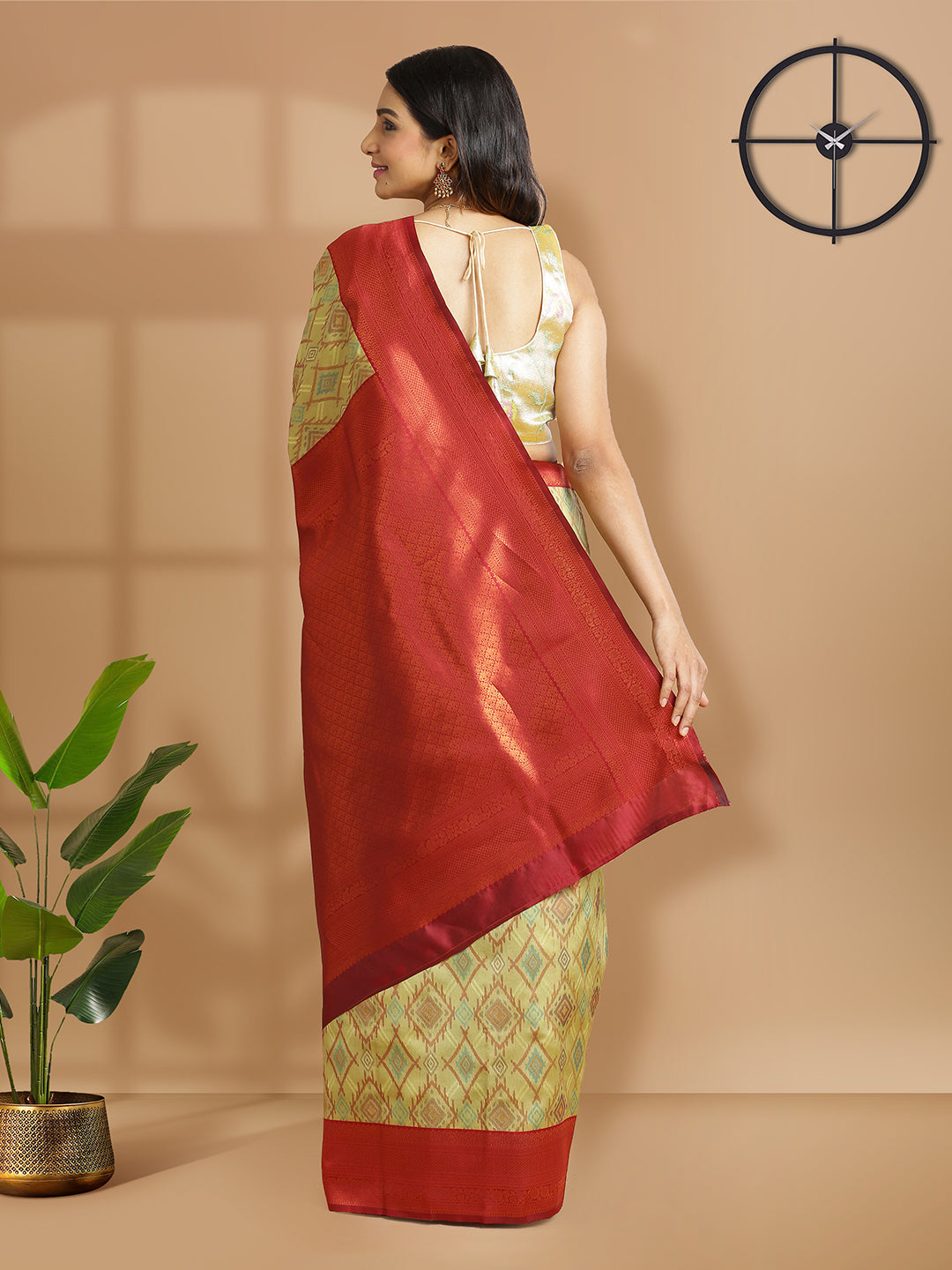 Pista Green Art Silk Saree With Ikat Design Over Body And Maroon Border
