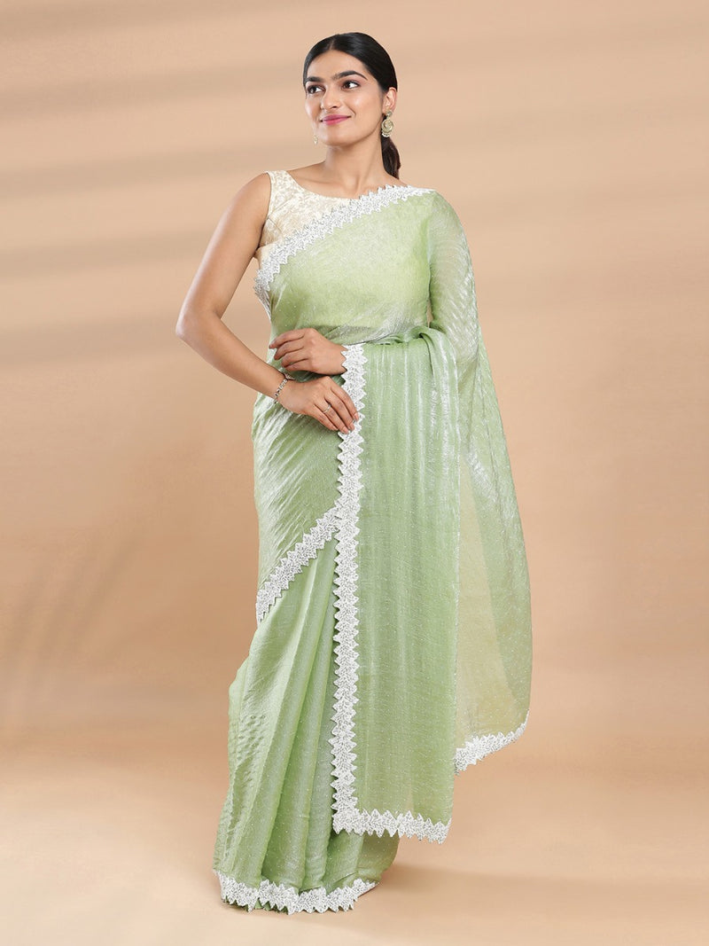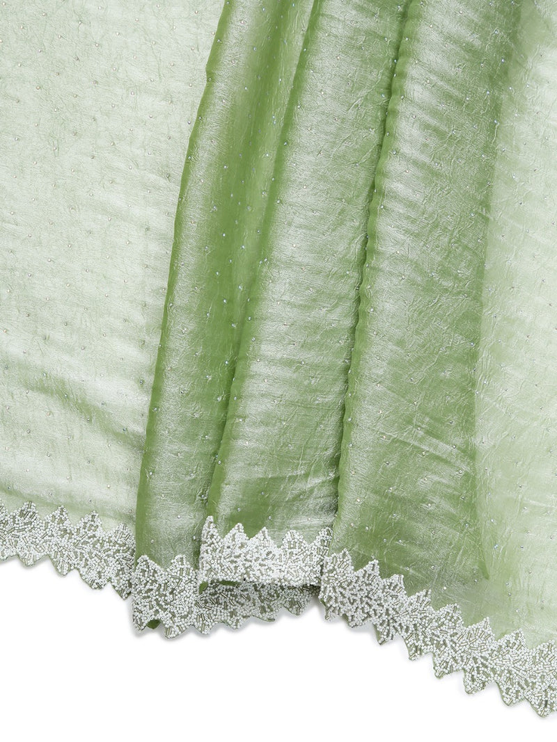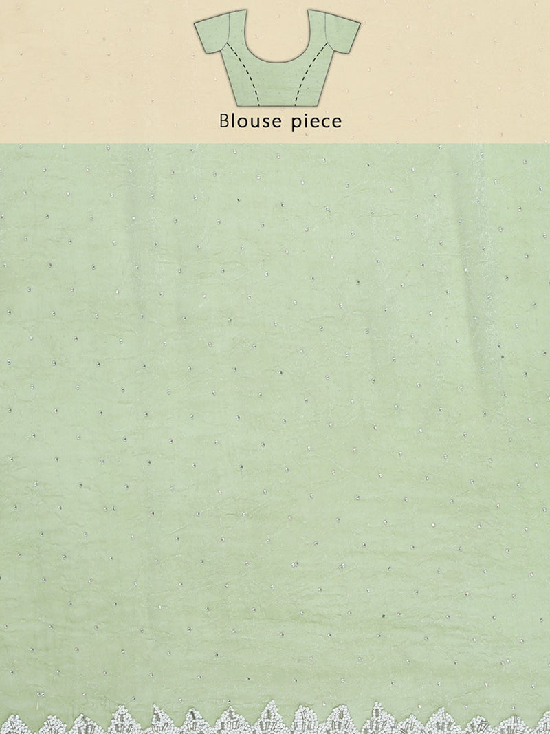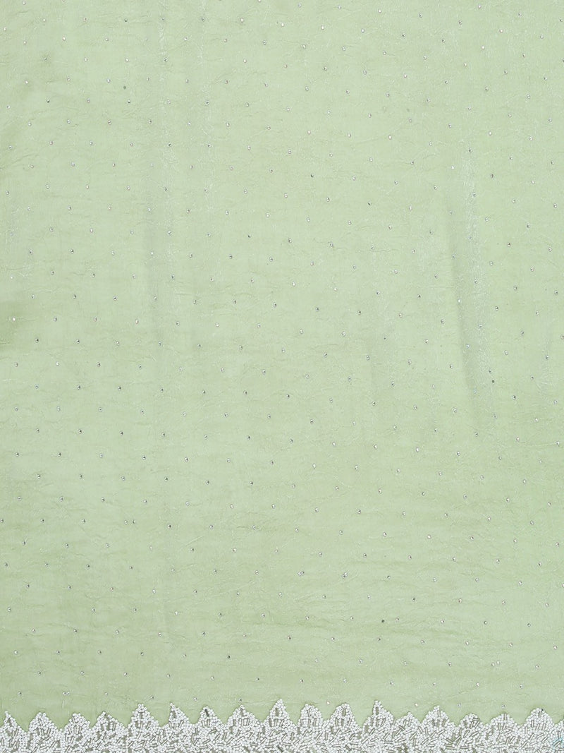 Pista Green Color Crushed Organza Saree With White Sugar Beads & Tube Beads Worked Border