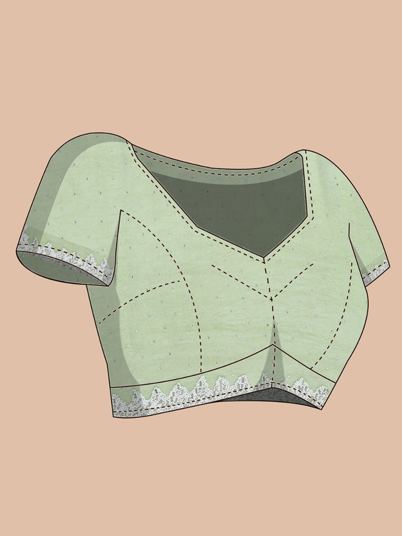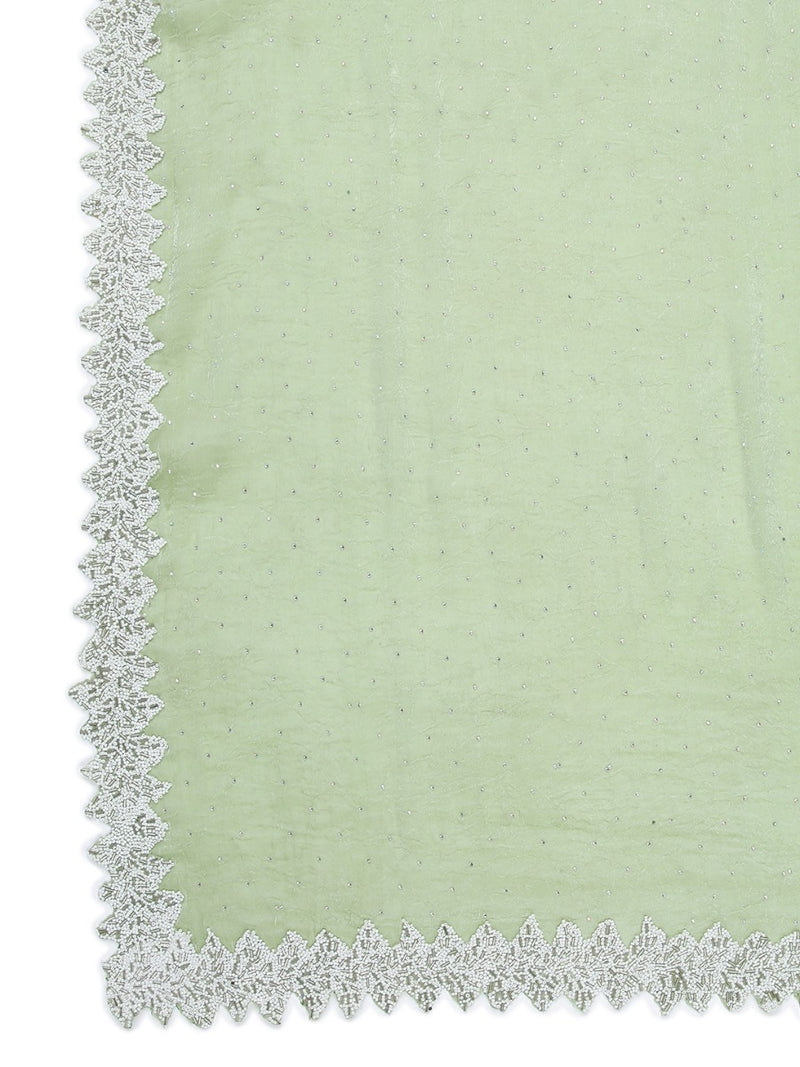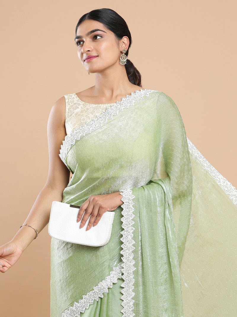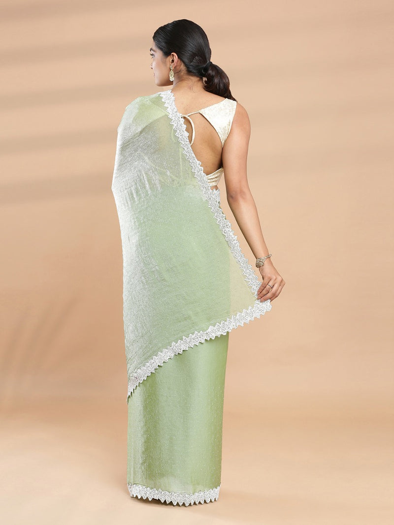 Pista Green Color Crushed Organza Saree With White Sugar Beads & Tube Beads Worked Border