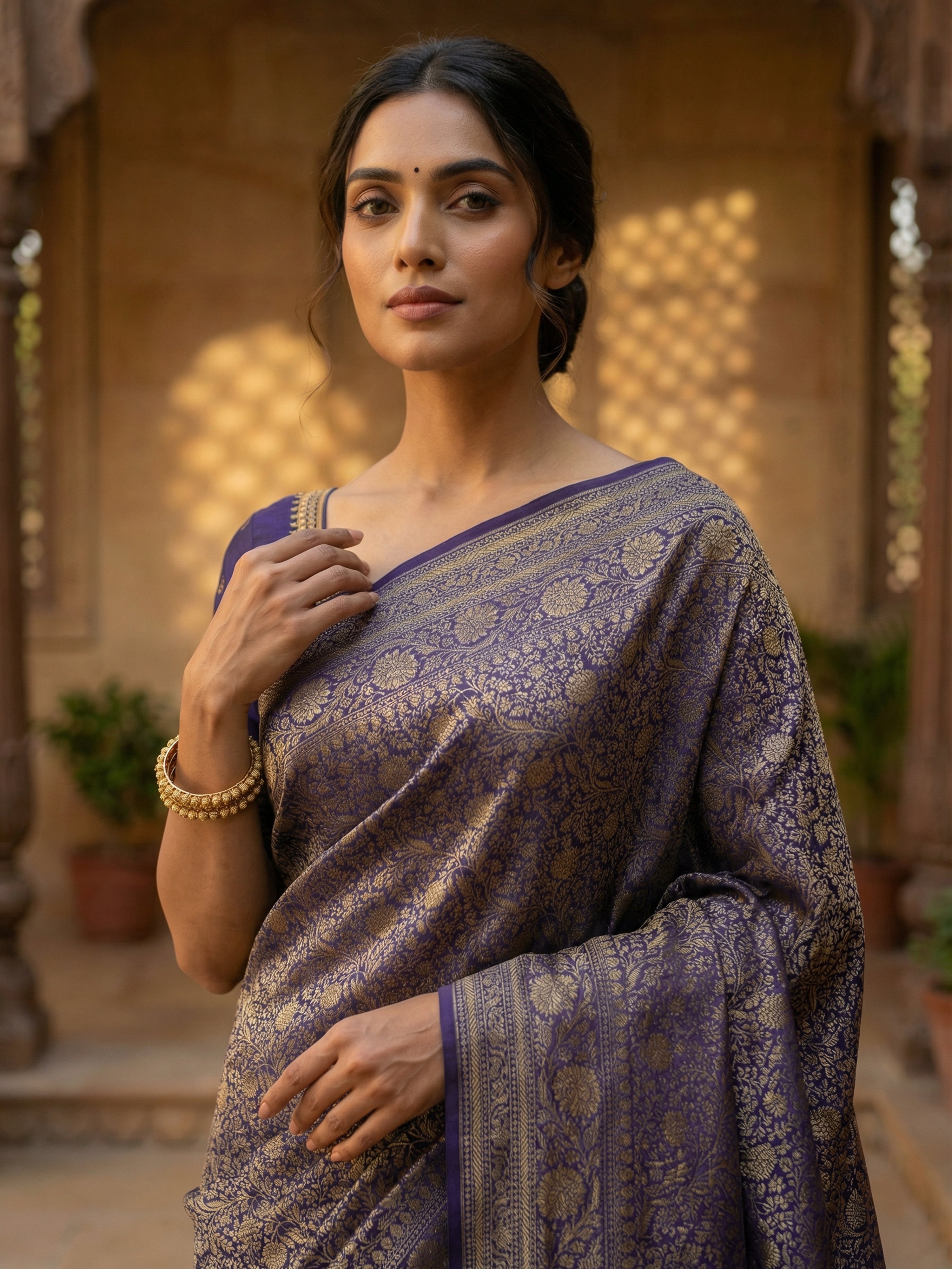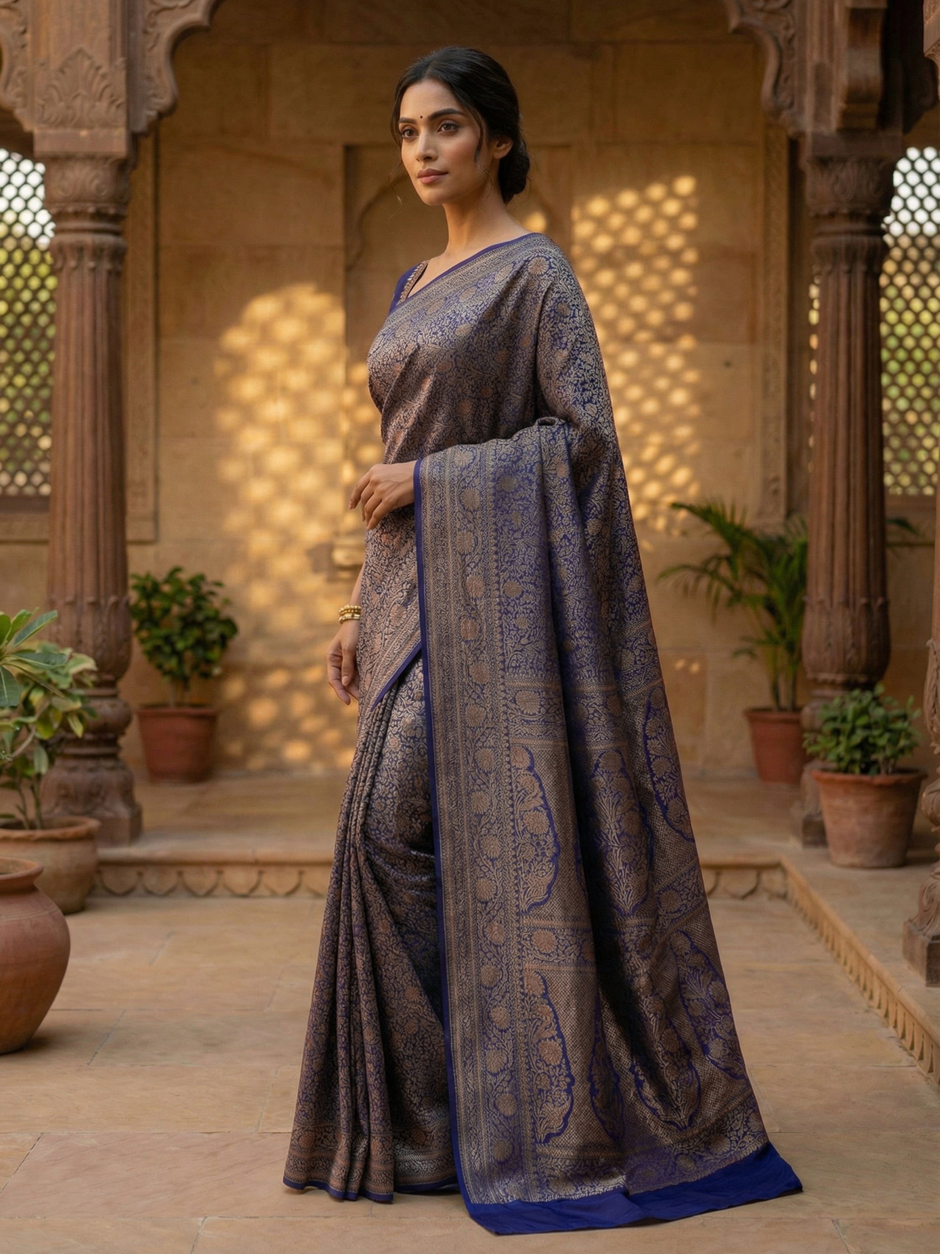 The beautifully woven floral pallu and the refined self Banarasi border add depth and grandeur to the saree. Paired with a plain royal blue blouse that complements the richness of the weave, this saree is ideal for weddings, festive celebrations, temple ceremonies, and grand occasions where you want to leave a lasting impression.
