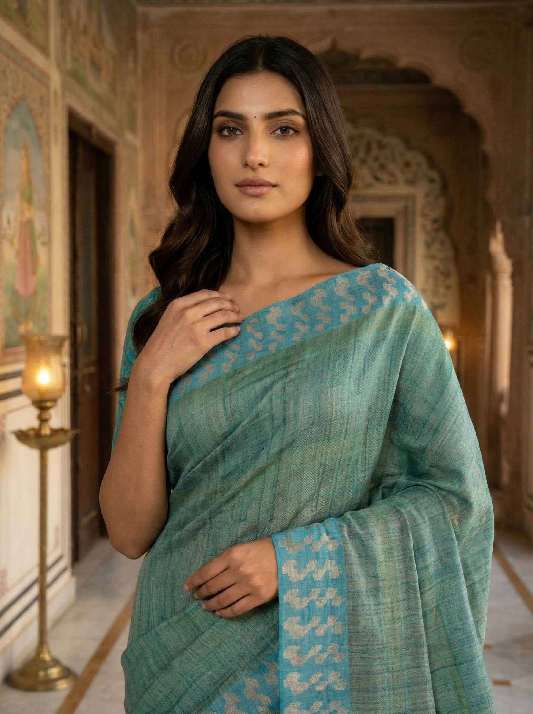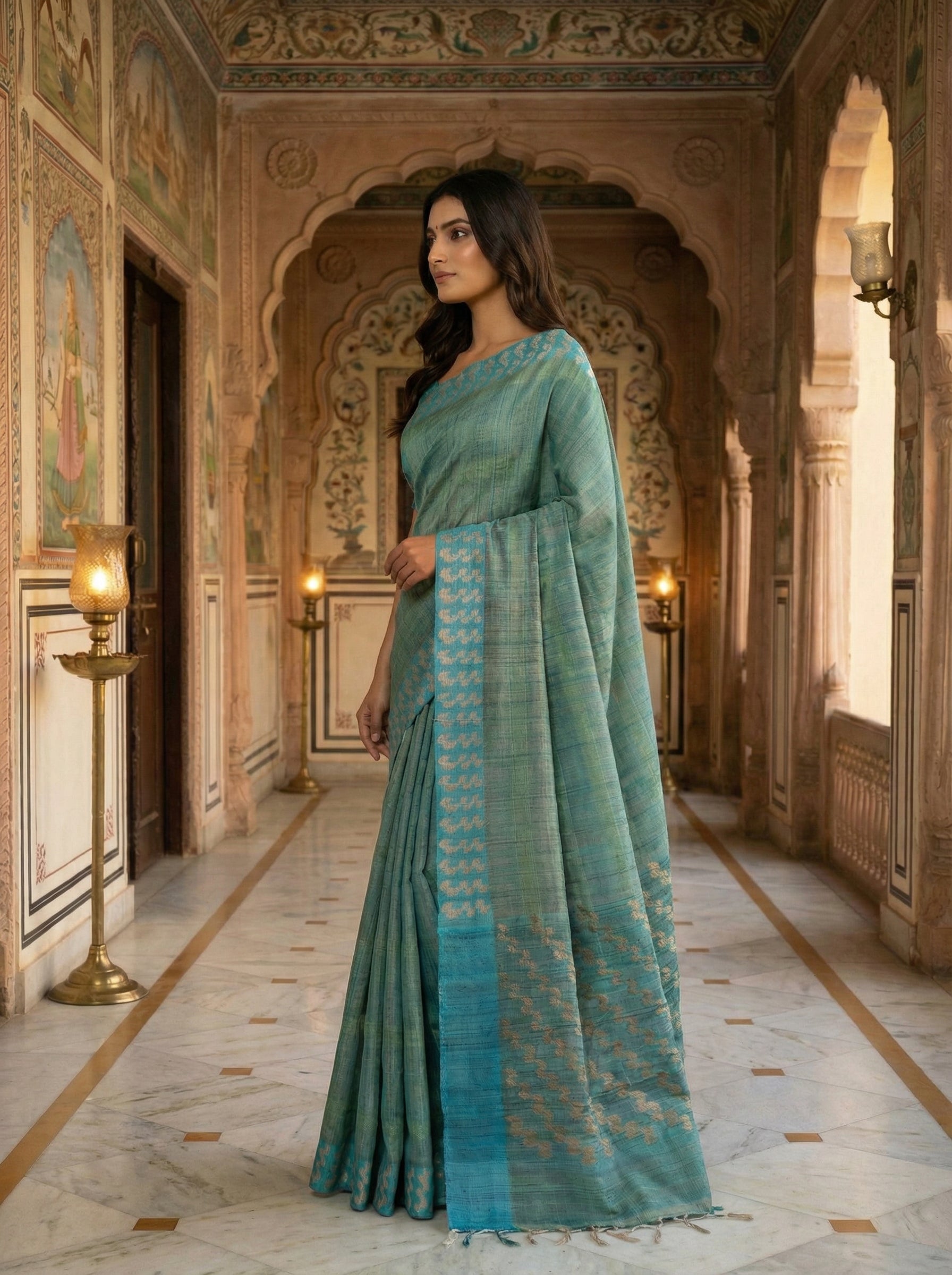 This ensemble is paired with a Plain Sage Green blouse, allowing the saree’s intricate details and colors to stand out beautifully. Lightweight, pure, and naturally textured, Jute Silk makes this saree comfortable and elegant for all-day wear.