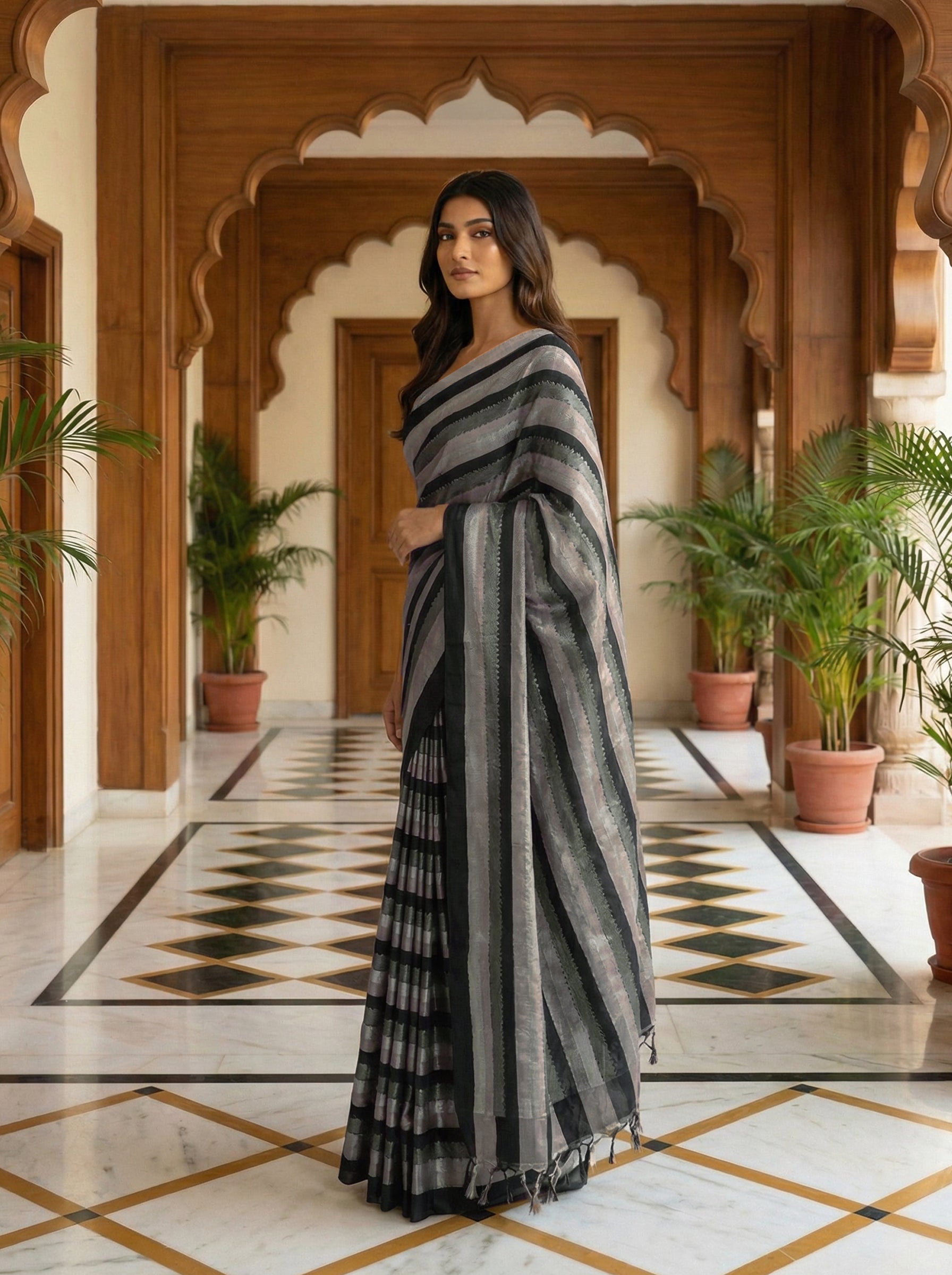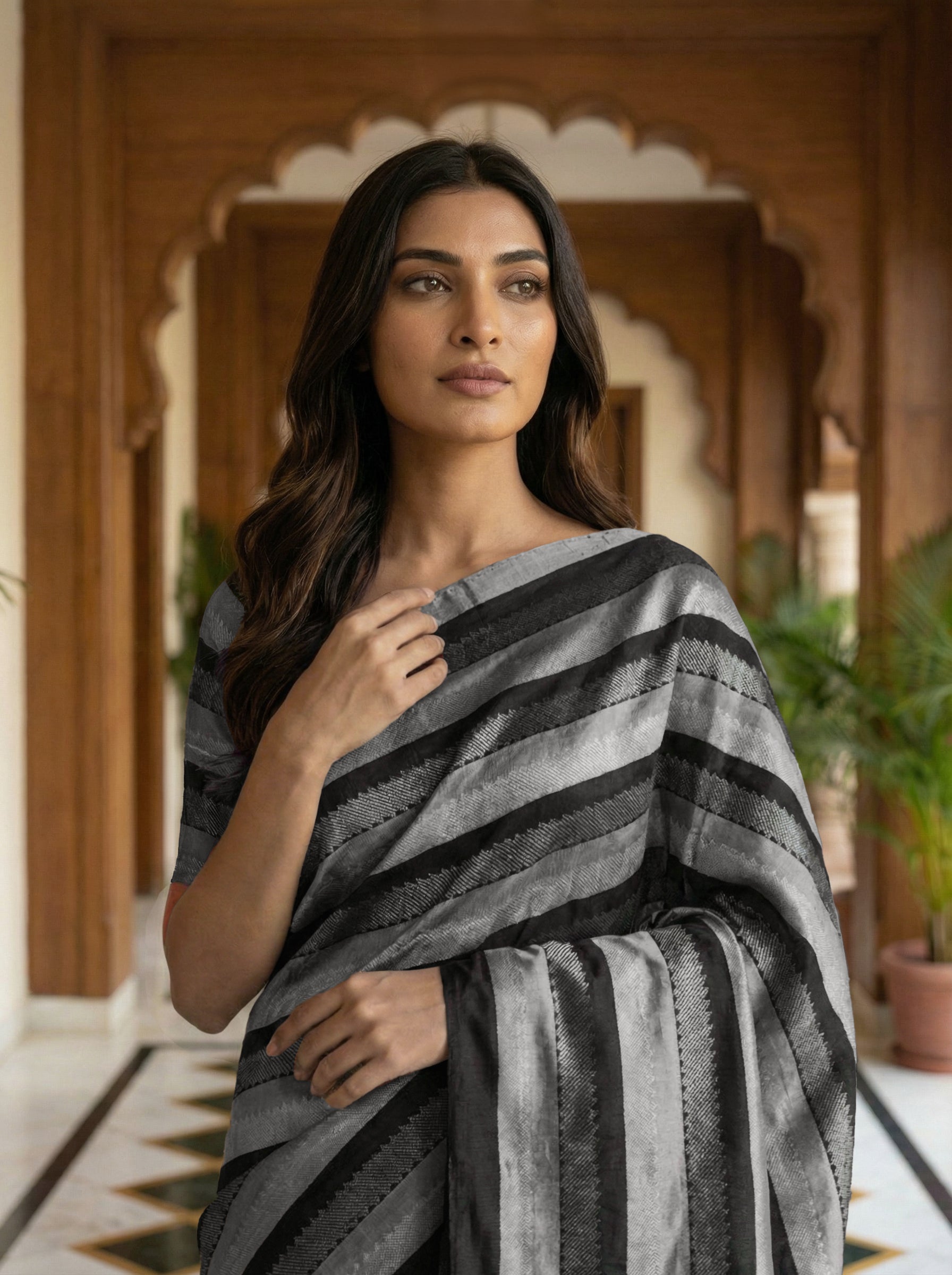 Experience timeless elegance with this exquisitely crafted Pure Kancheepuram Silk Saree in a stunning combination of Ivory Brown and Black. Designed for women who appreciate tradition blended with modern finesse, this saree features a sophisticated striped body and pallu, woven with shimmering Silver Zari that elevates its luxurious appeal.