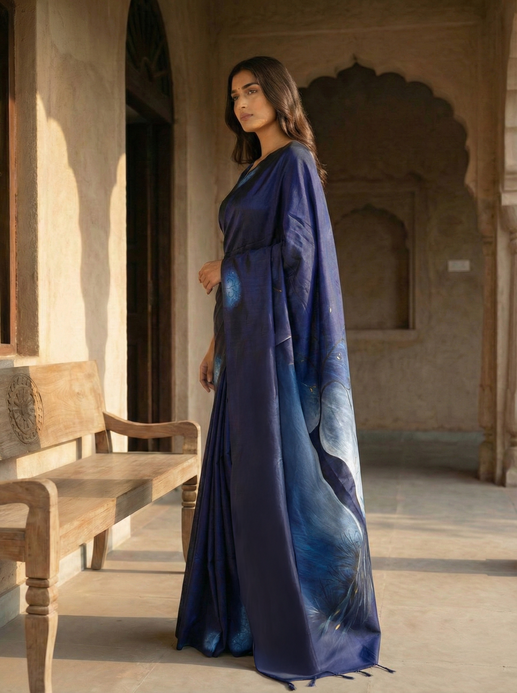 The highlight of this saree is its exquisite Mural Print Pallu, inspired by traditional temple and cultural art forms, adding depth, vibrance, and a storytelling element to the drape. The saree is finished with a Self Border featuring printed detailing, lending a cohesive and modern touch to the overall design.