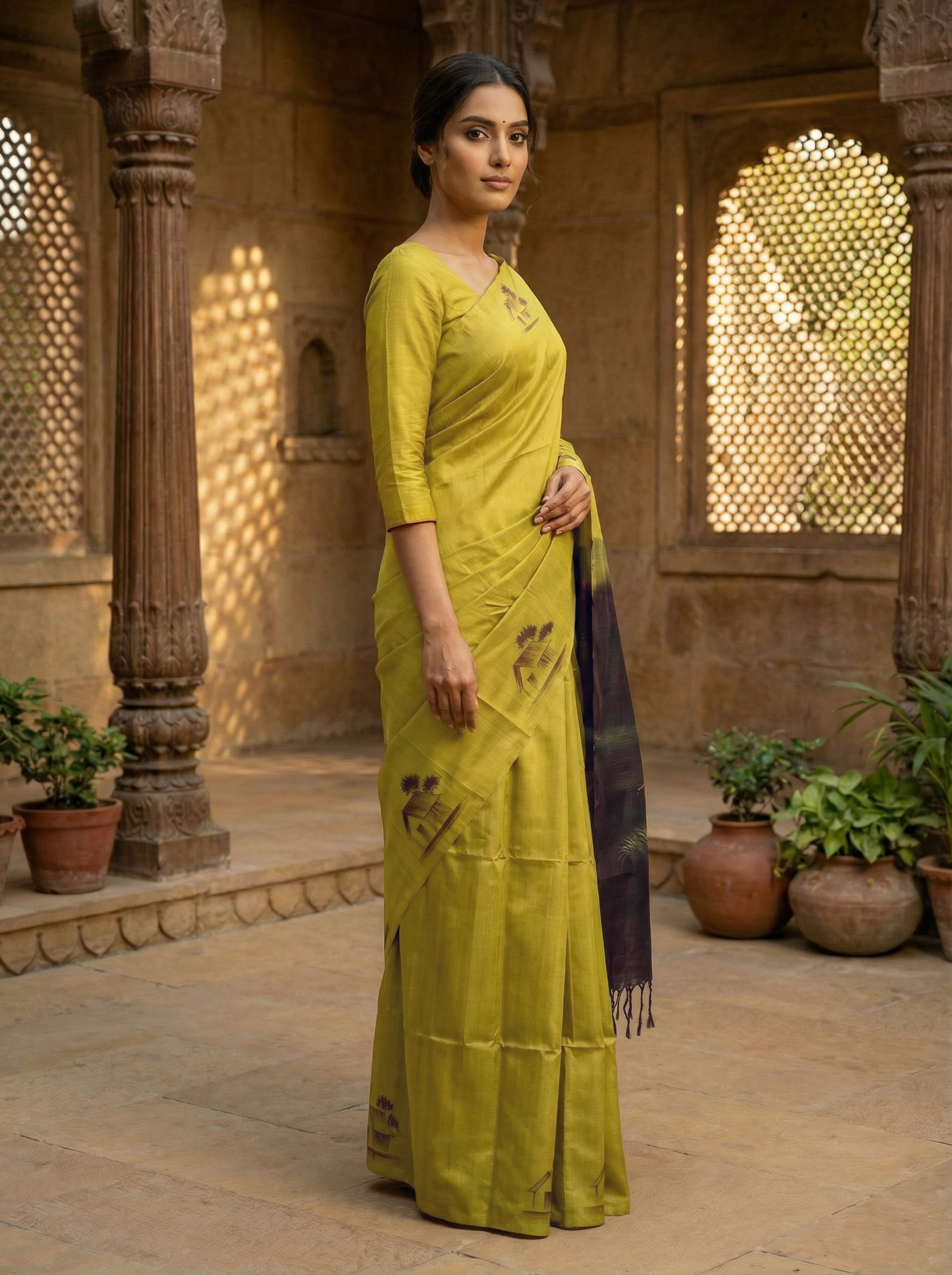 Paired with a Coffee Brown Plain Blouse featuring Printed Accents, the ensemble creates a striking yet elegant contrast. Perfect for festive gatherings, cultural events, celebrations, or sophisticated casual occasions, this saree beautifully blends heritage artistry with modern minimalism.
