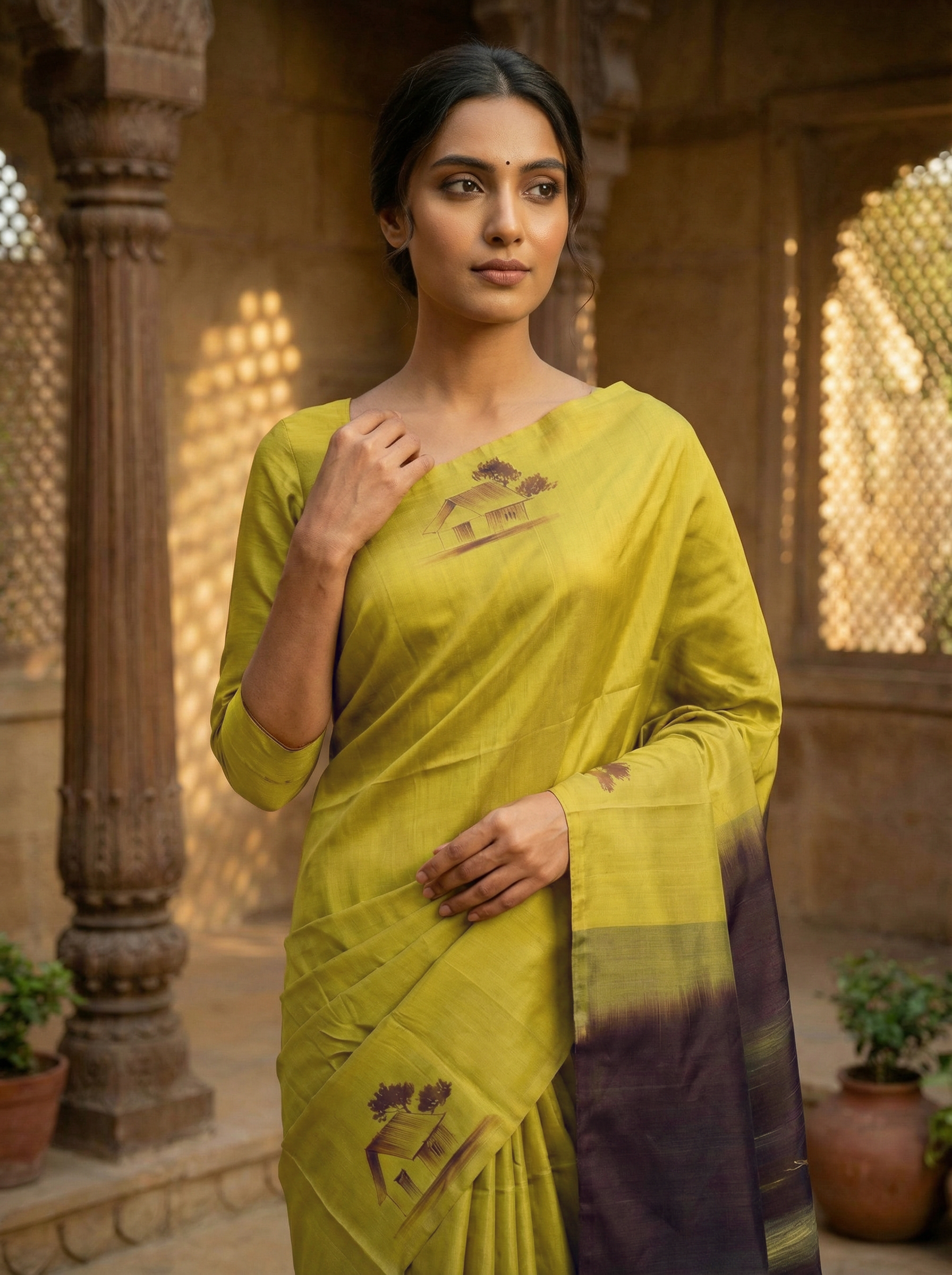 The highlight of this saree is its Contrast Mural Print Pallu, inspired by traditional temple and cultural artwork, adding a touch of visual storytelling and artistic richness. The saree is finished with a subtle Self-Design Printed Border, giving it a harmonious and contemporary appeal.