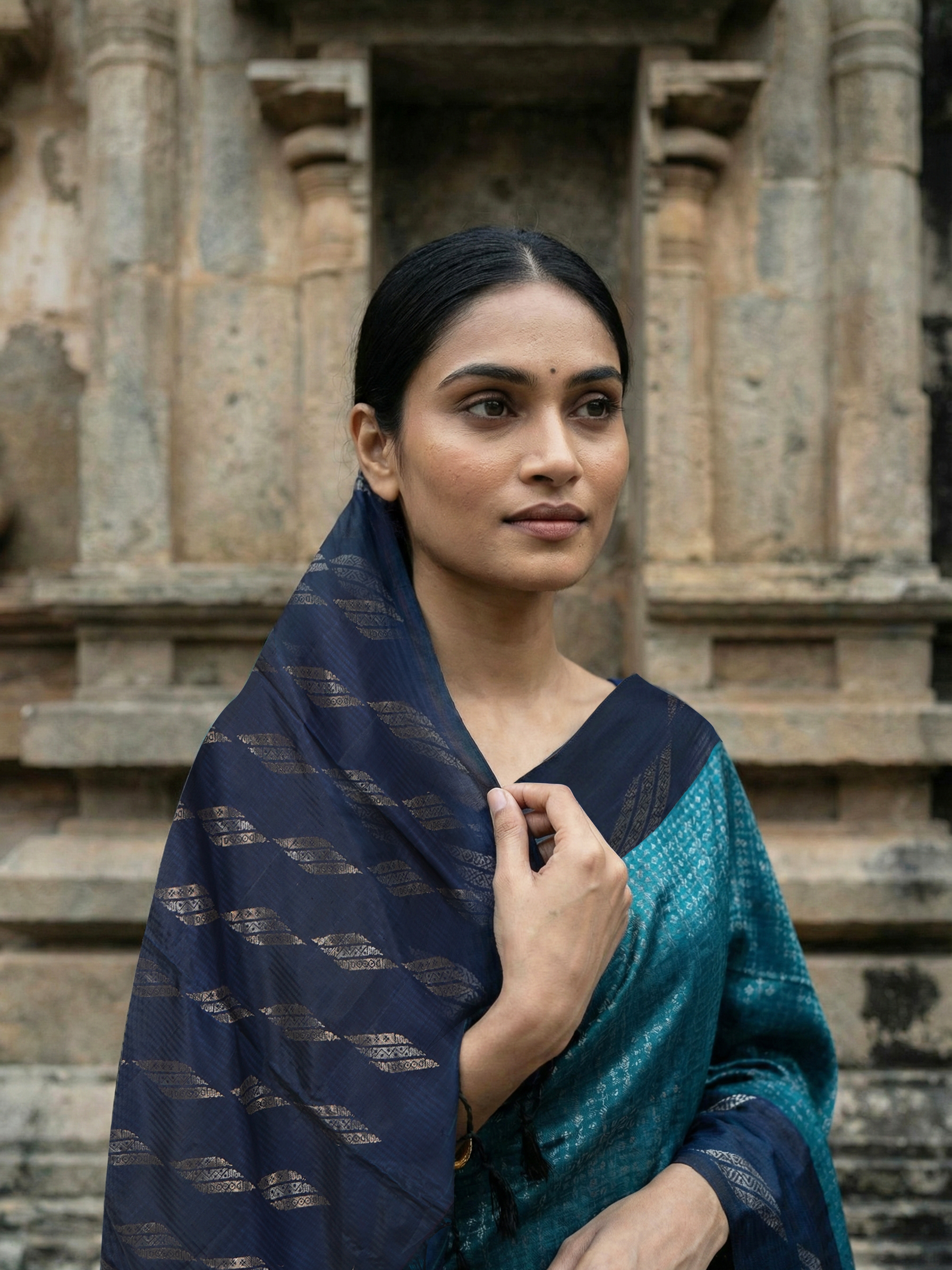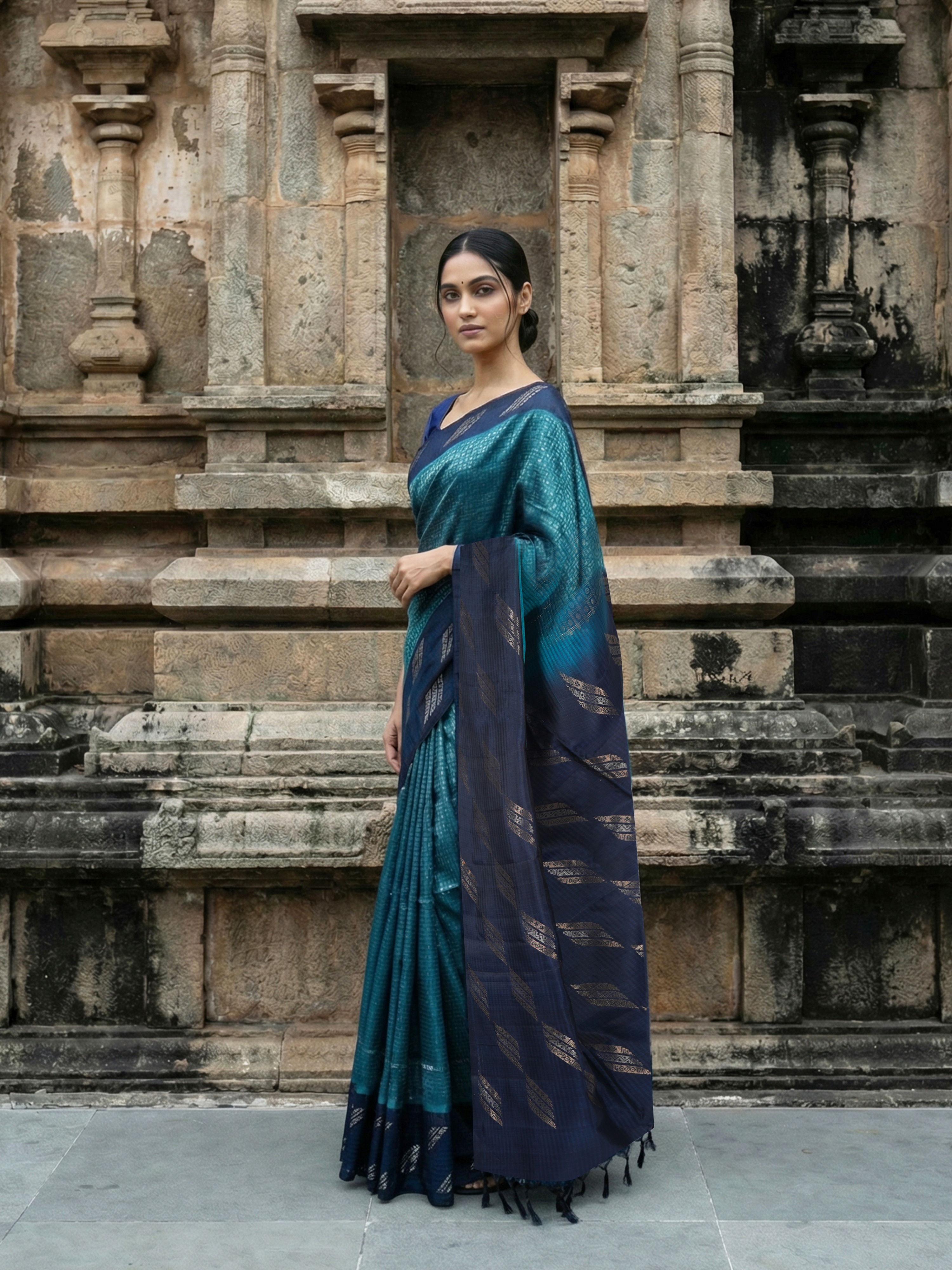 Completing the ensemble is a stylish Contrast Navy Blue Plain Blouse, offering a refined and elegant finish that perfectly complements the saree’s grand craftsmanship.