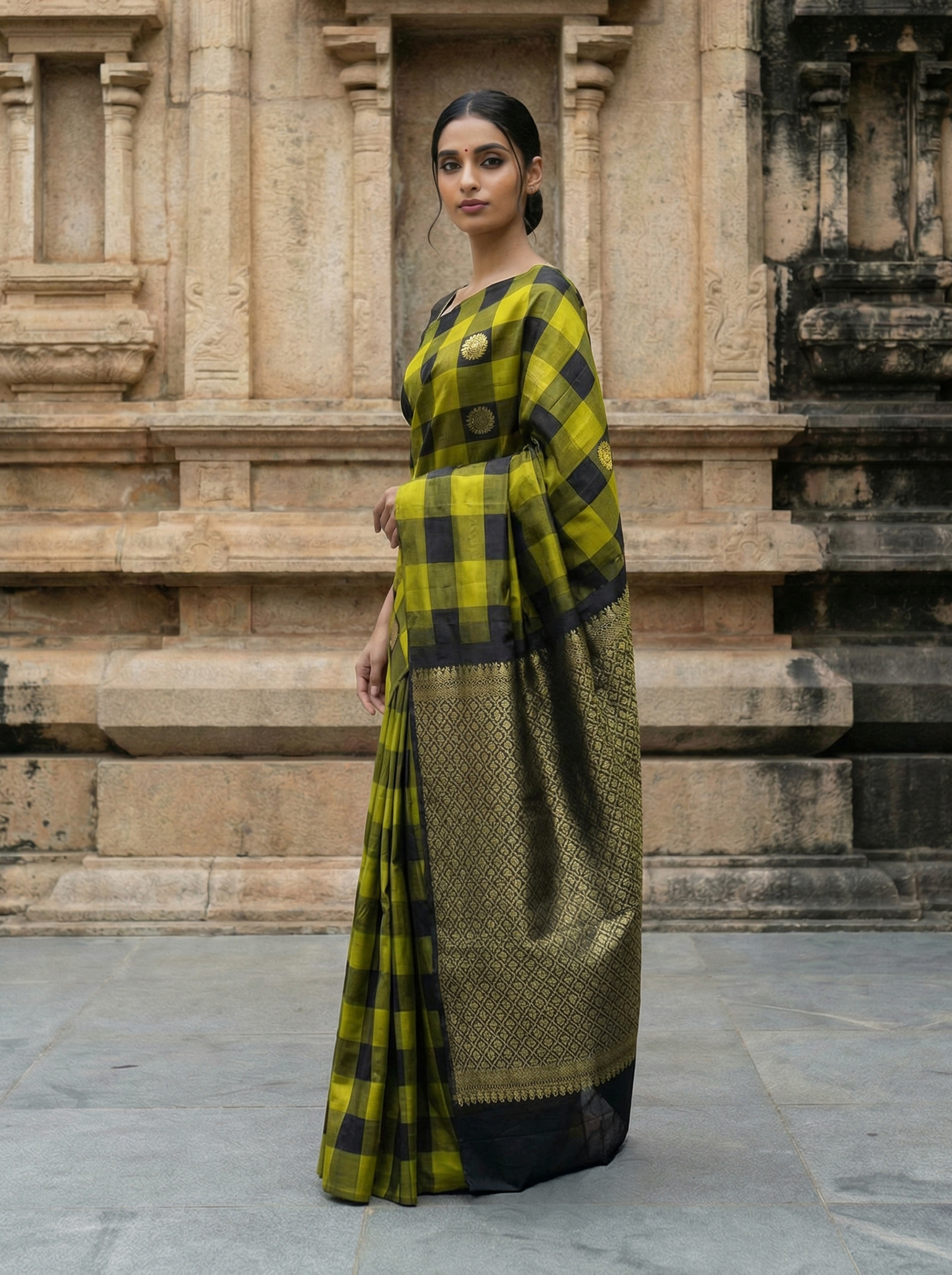 Pure Kancheepuram Silk Saree in Pear Green with Golden Zari – Checked Zari Butta Body