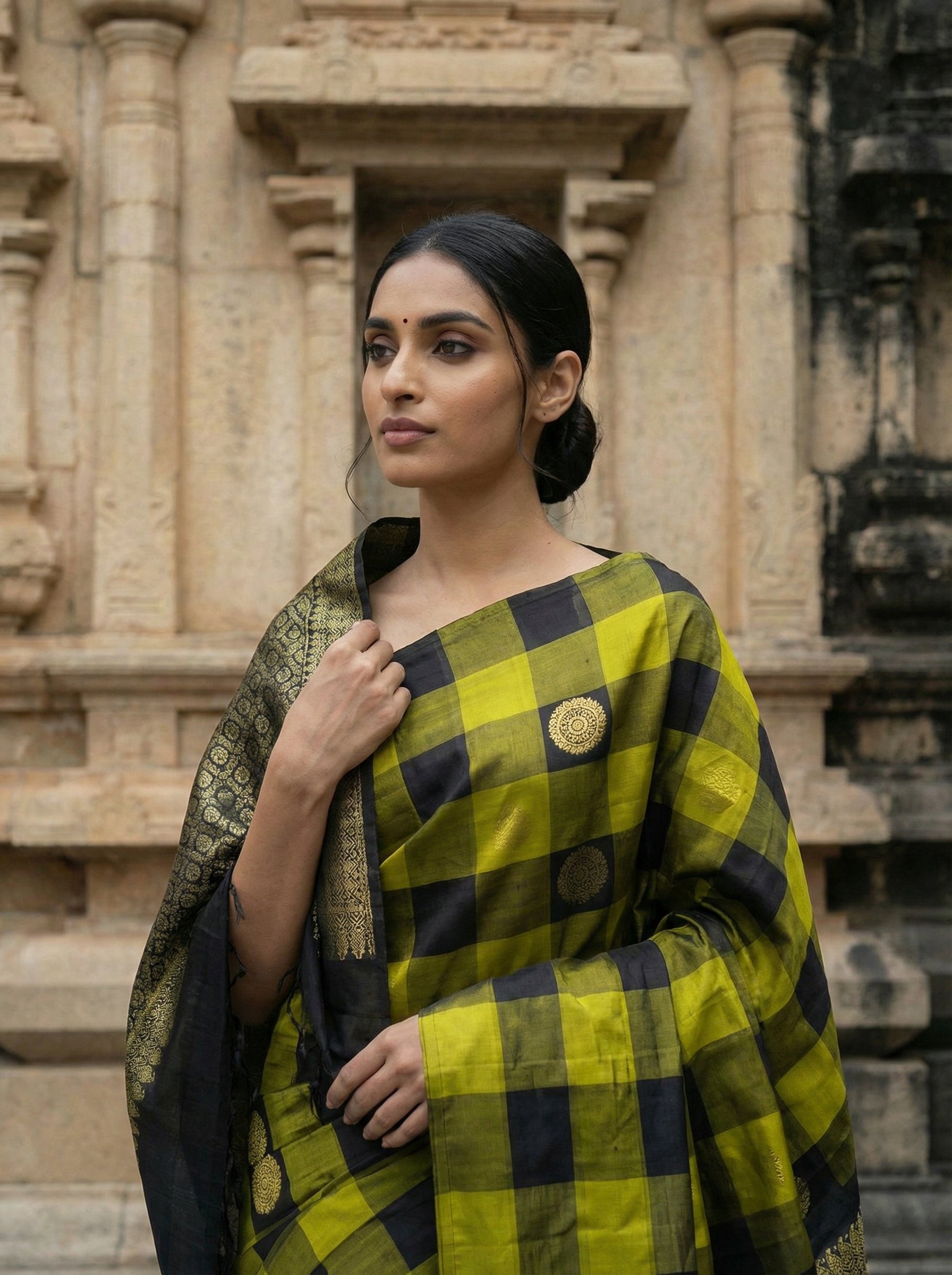 The Pallu mirrors the check pattern with rich Zari detailing, adding consistency, elegance, and depth to the drape. The sophisticated Borderless Finish further enhances its modern minimalistic allure, while maintaining the richness of classic Kanchipuram weaving.