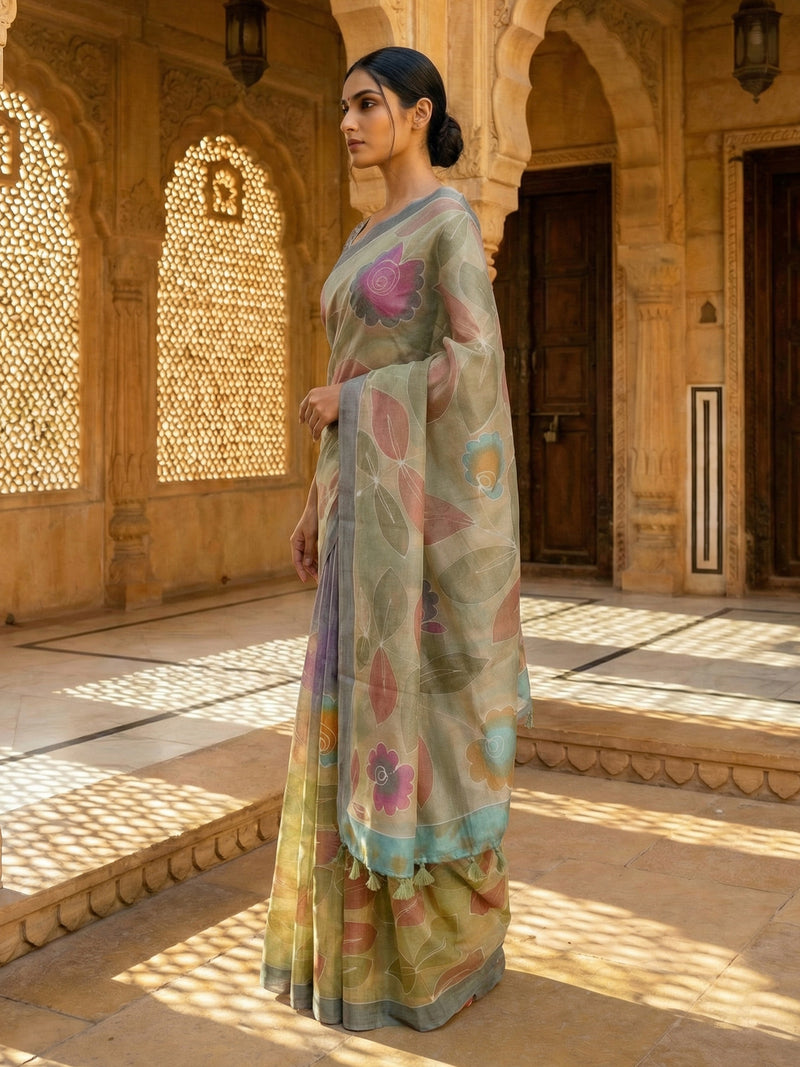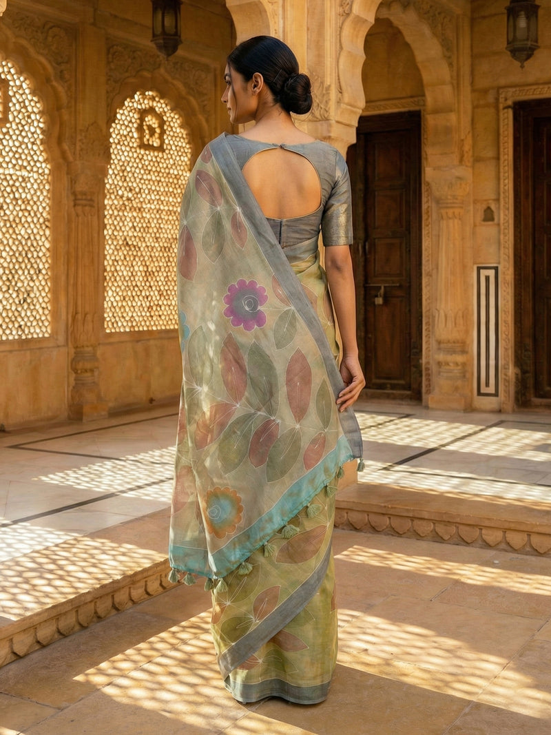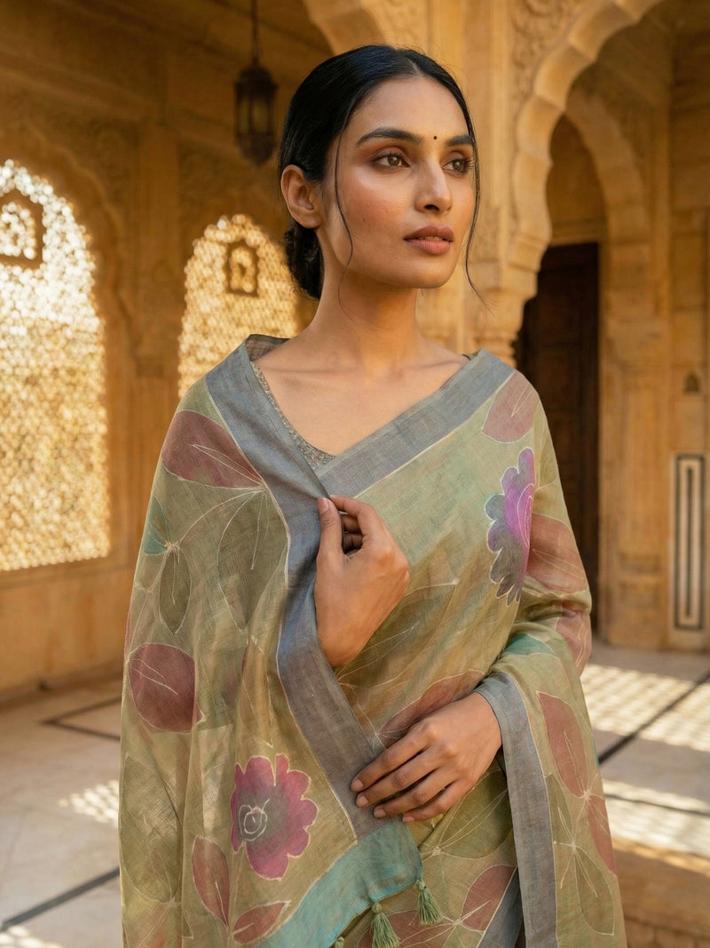 Pure Tusser Silk Saree in Pastel Green with Floral Design & Contrast Border