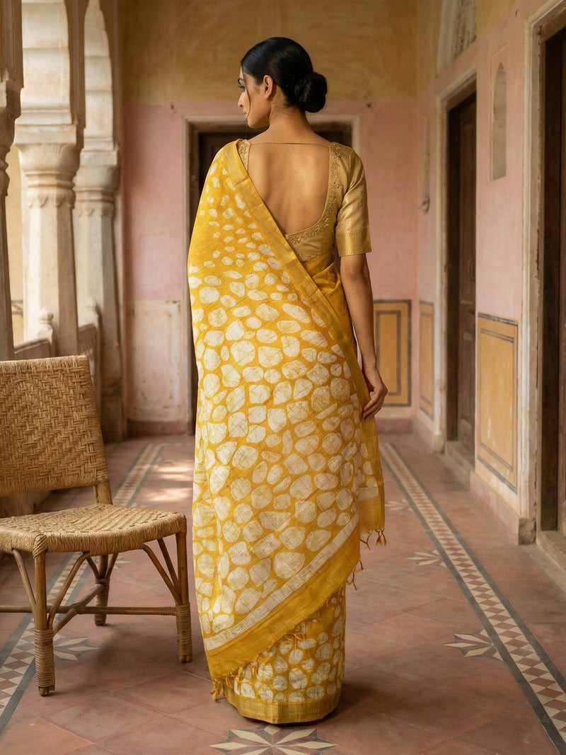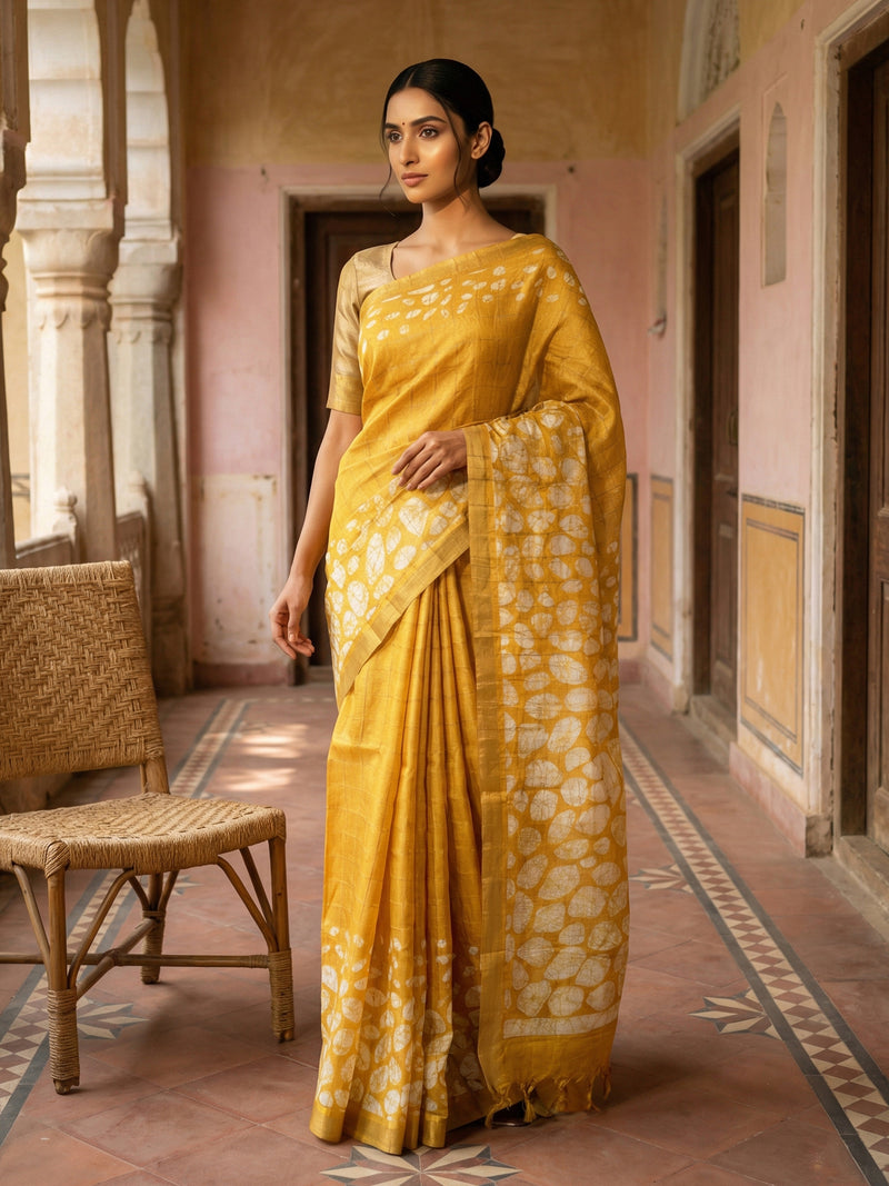 Pure Tussar Silk Saree in Mustard Yellow with Checked Body and Batik-Style Printed Pallu