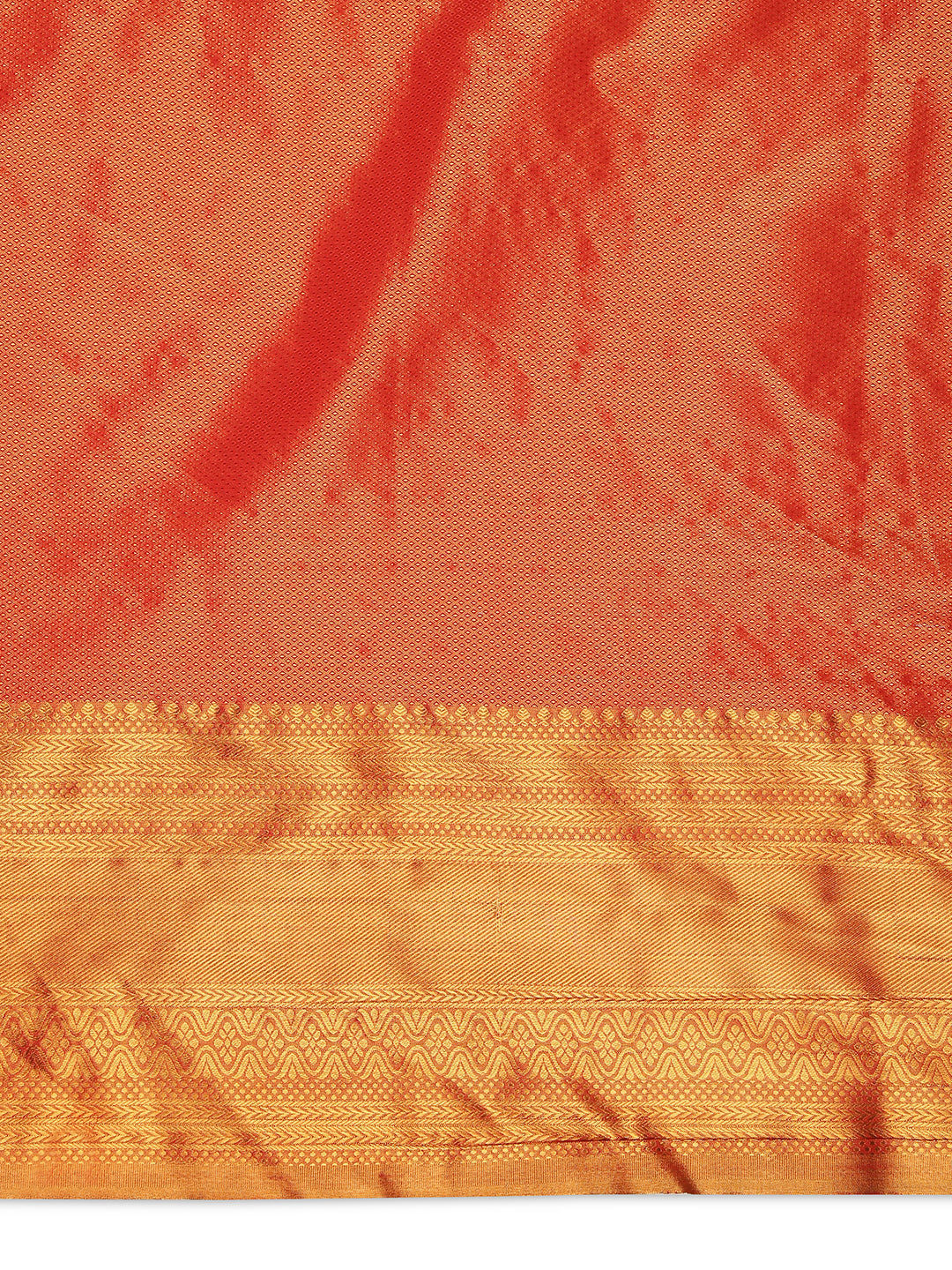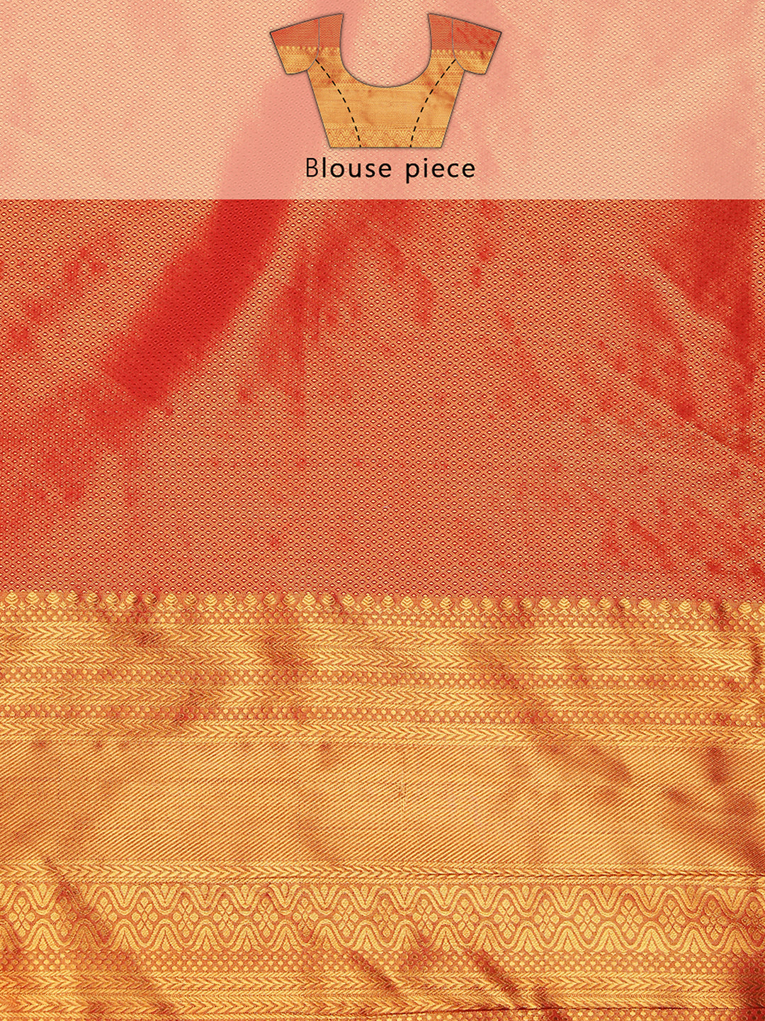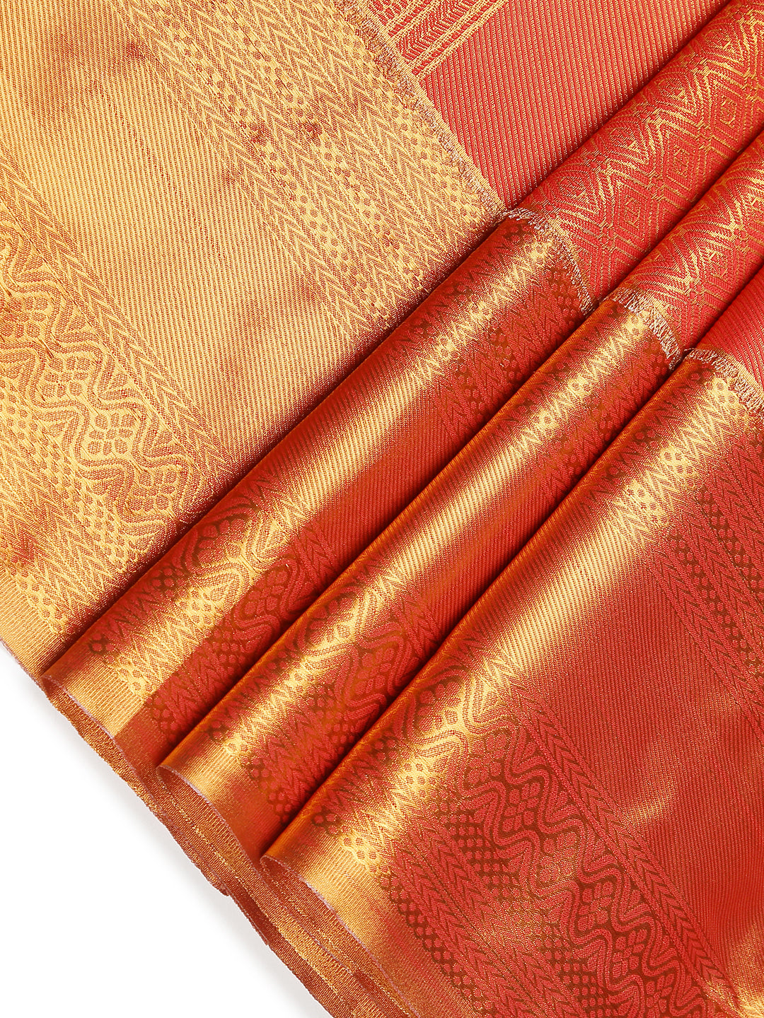 Radiate elegance in this red tissue saree adorned with golden zig-zag self designs all over, finished with a matching zari border. Ideal for weddings and grand celebrations.