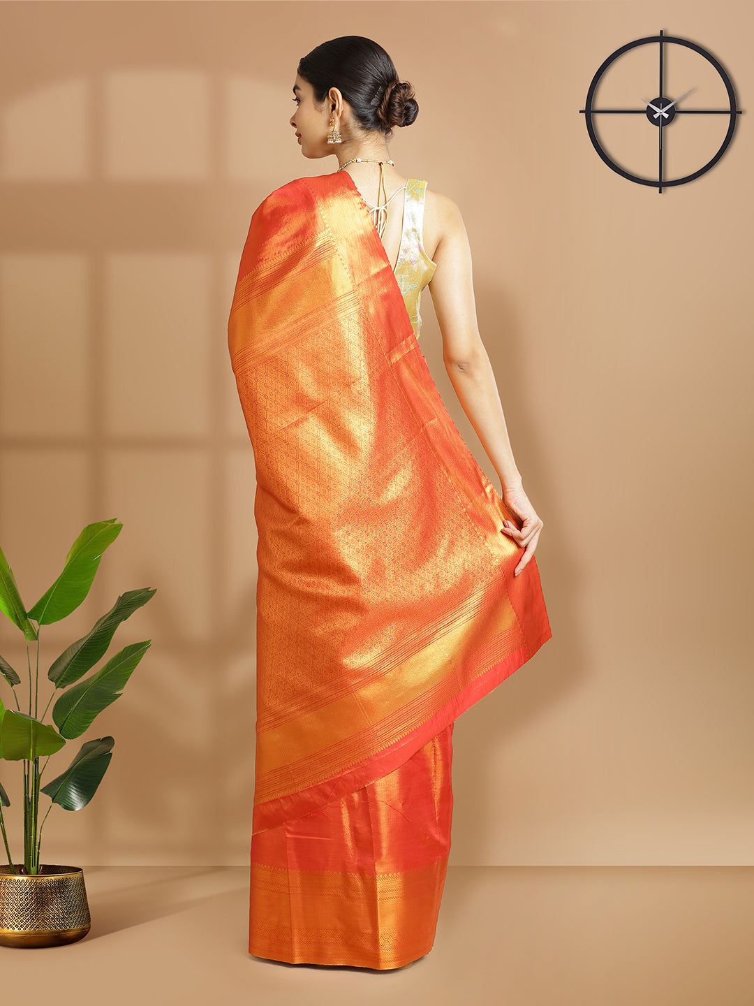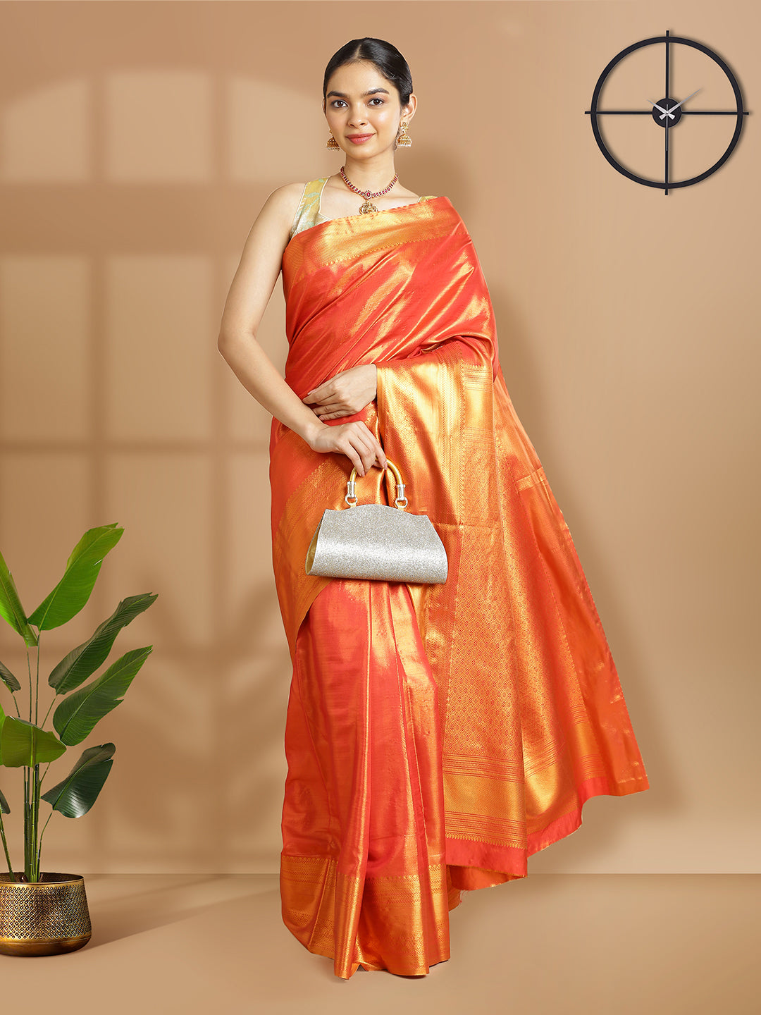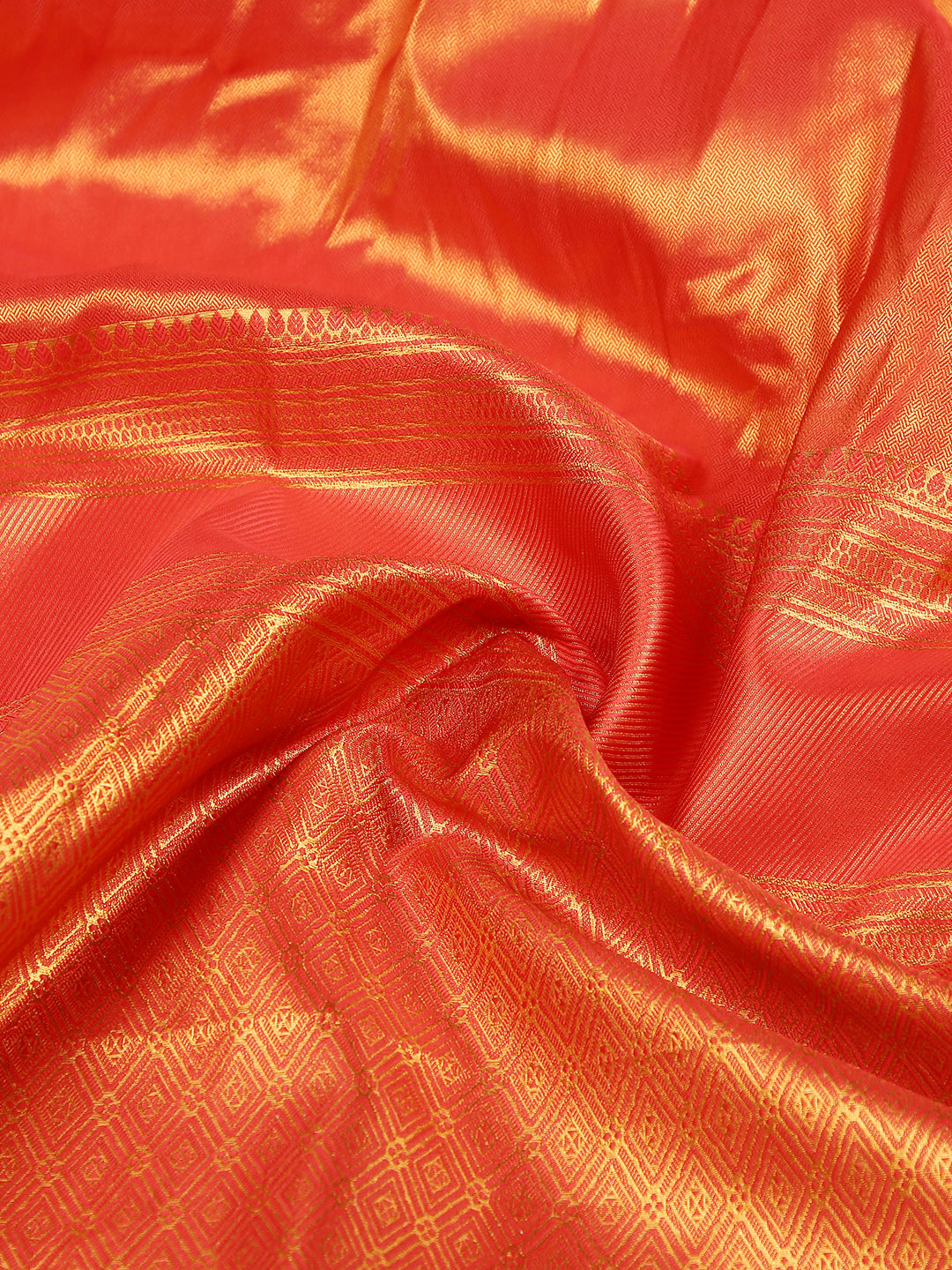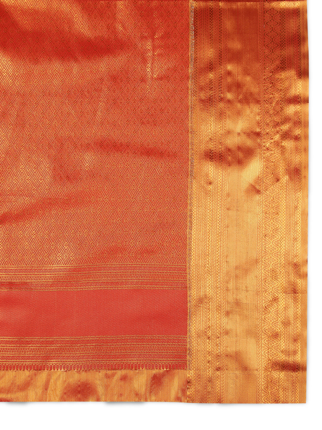Radiate elegance in this red tissue saree adorned with golden zig-zag self designs all over, finished with a matching zari border. Ideal for weddings and grand celebrations.