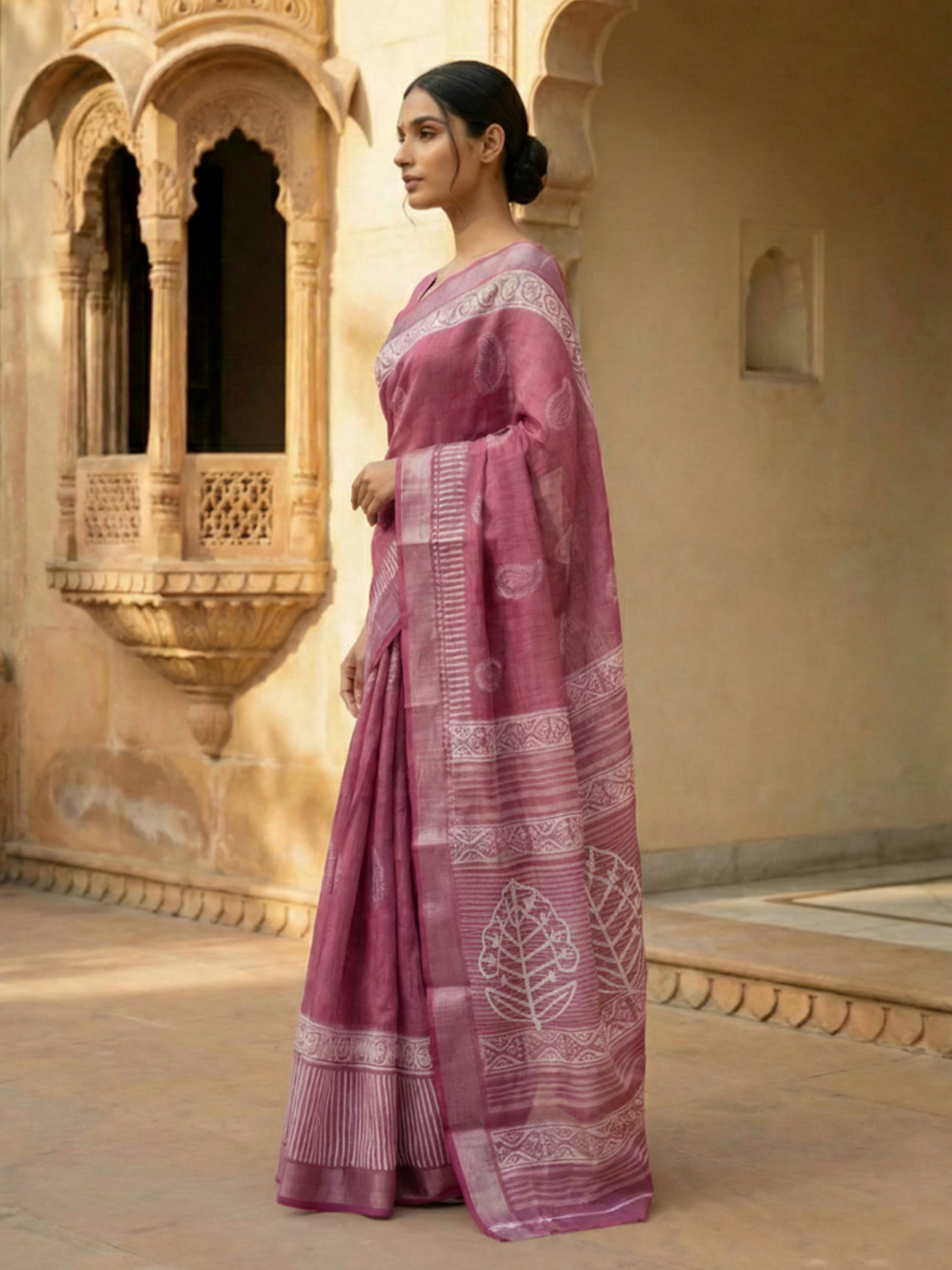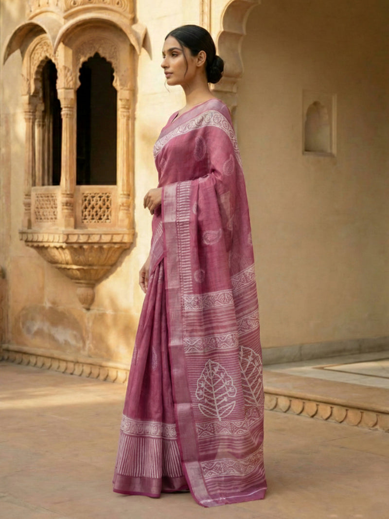 Rose Pink Semi Linen Saree with Paisley Motifs and Striped Border