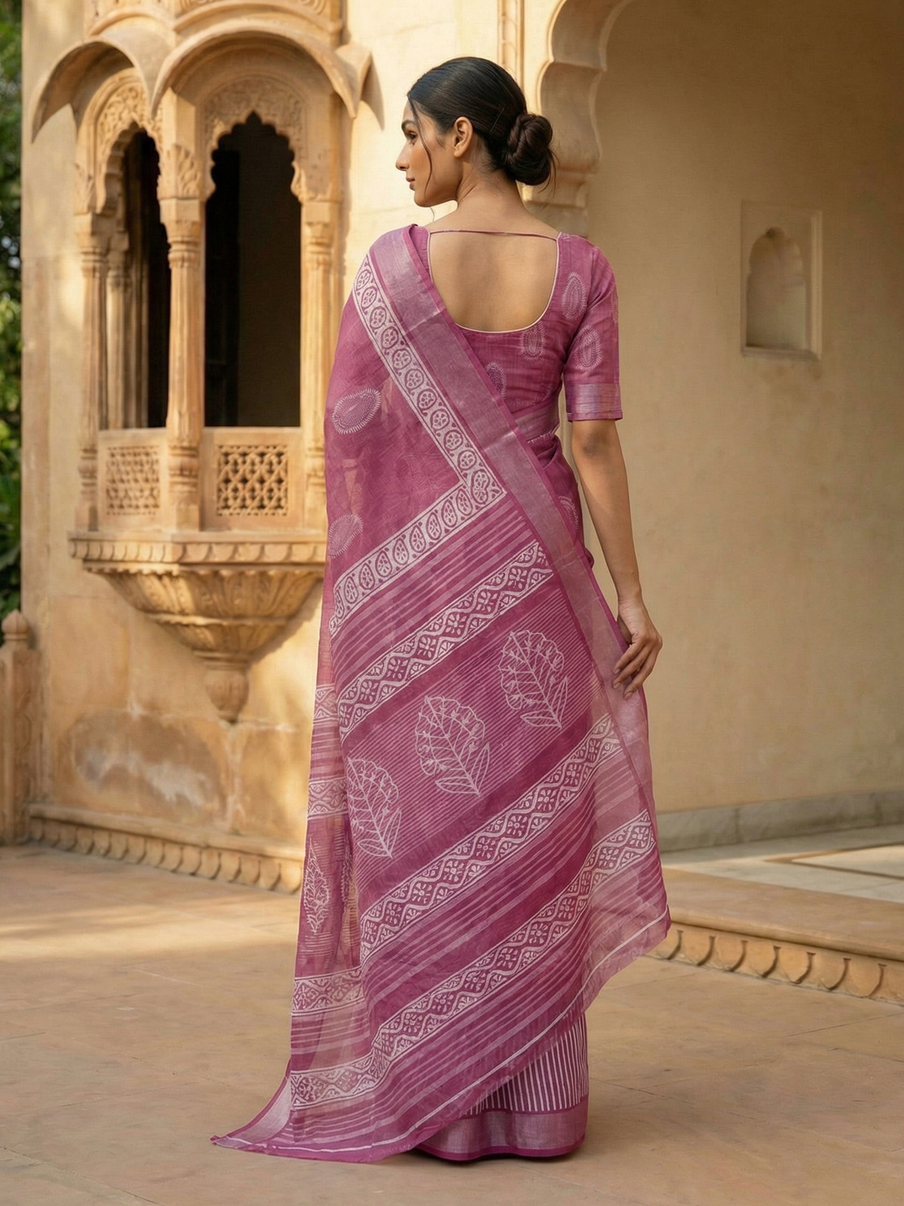 Elevate your everyday ethnic style with this elegant Rose Pink Semi Linen Saree, crafted for comfort and understated sophistication. The saree features delicate paisley motifs woven across the body, beautifully complemented by striped and traditional patterned borders that add a refined finish.