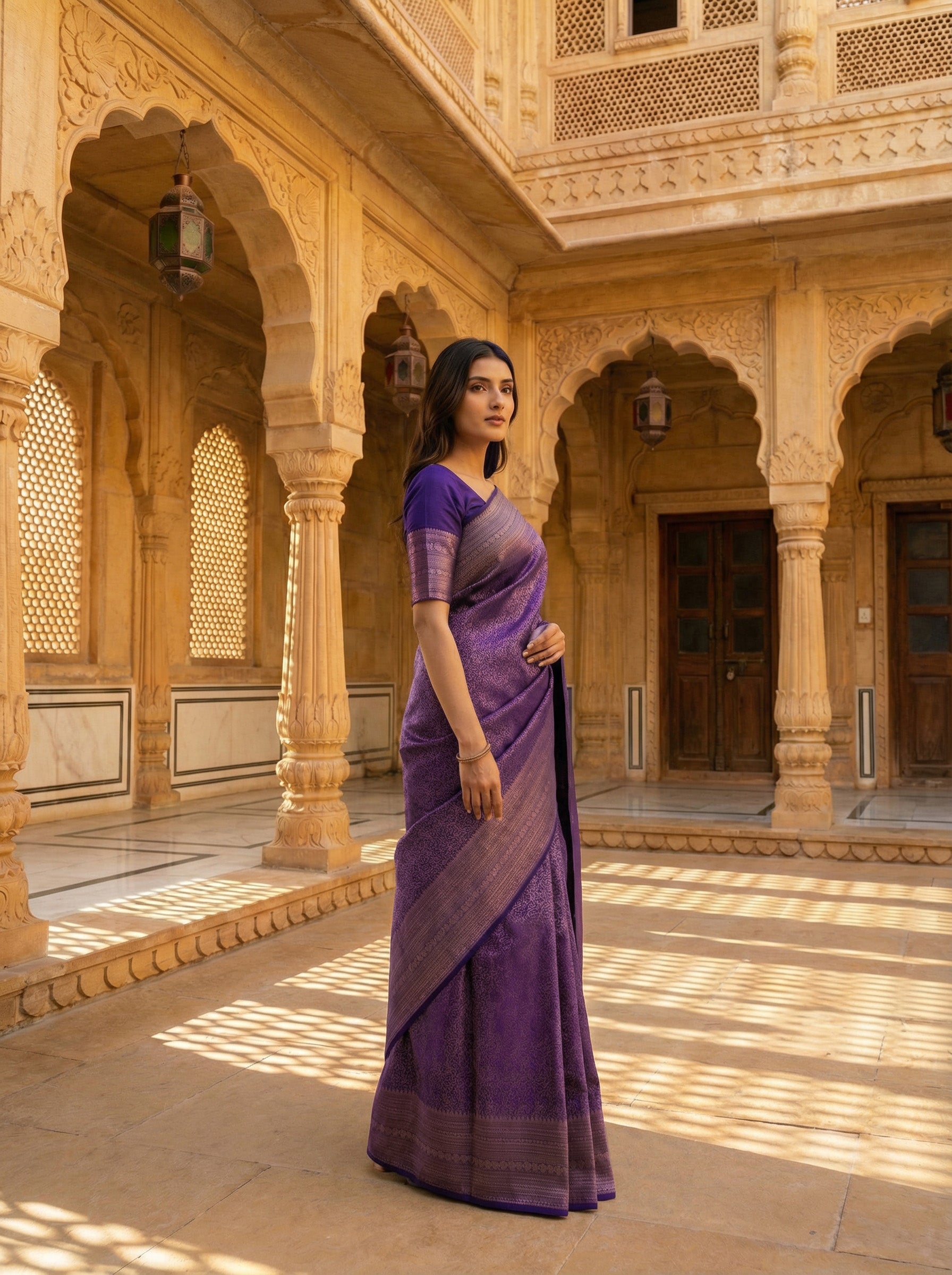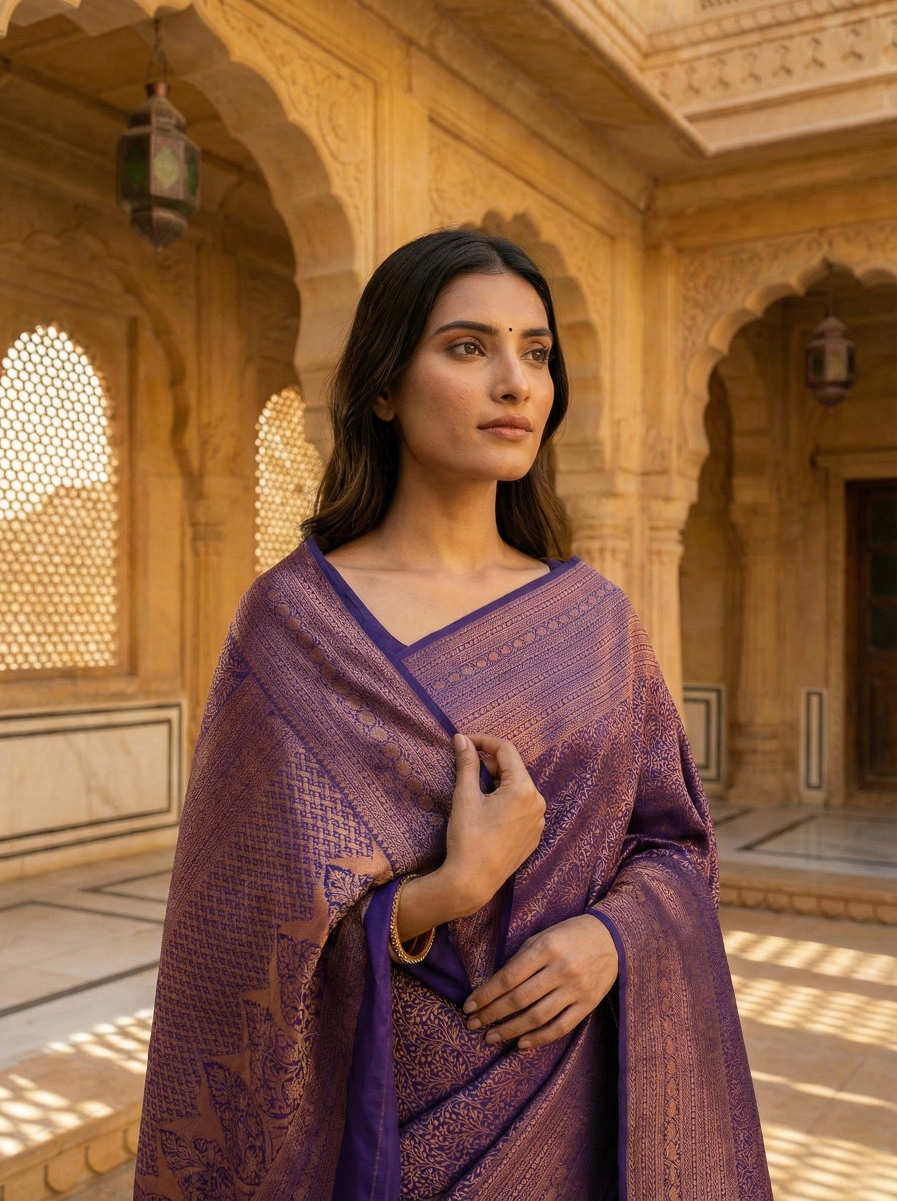 Charming royal blue semi brocade silk saree with copper zari and geometric Banarasi pattern.
