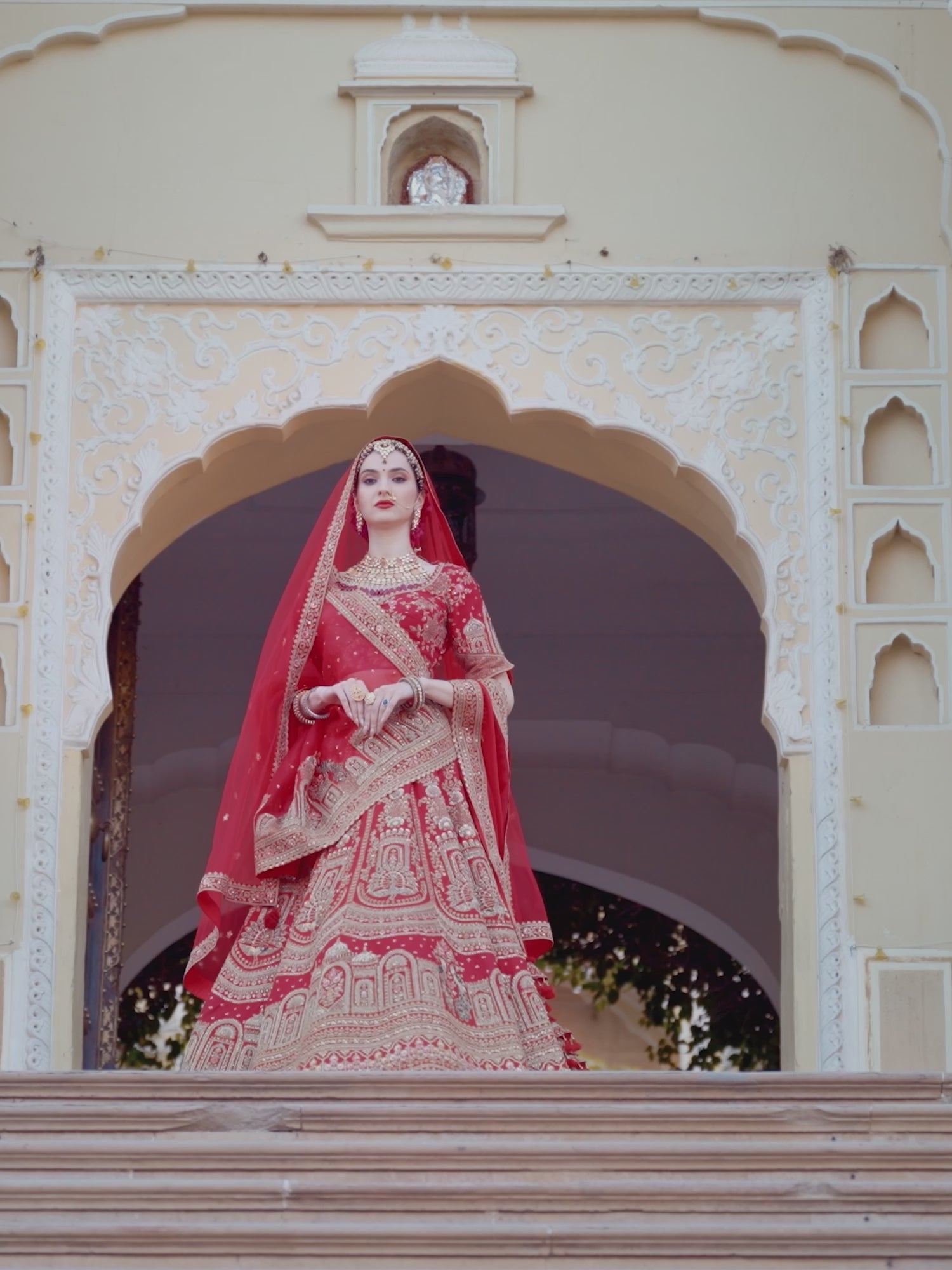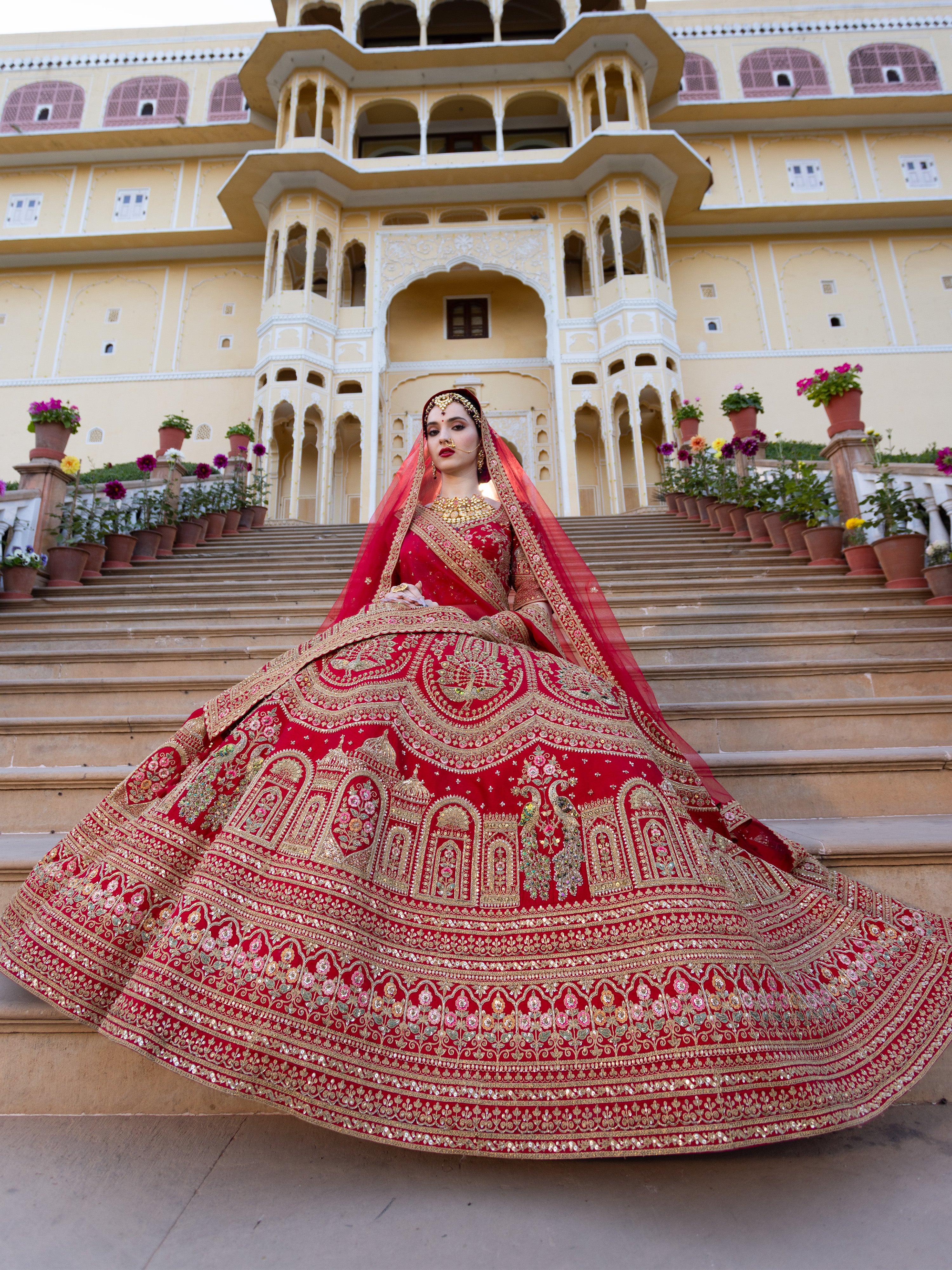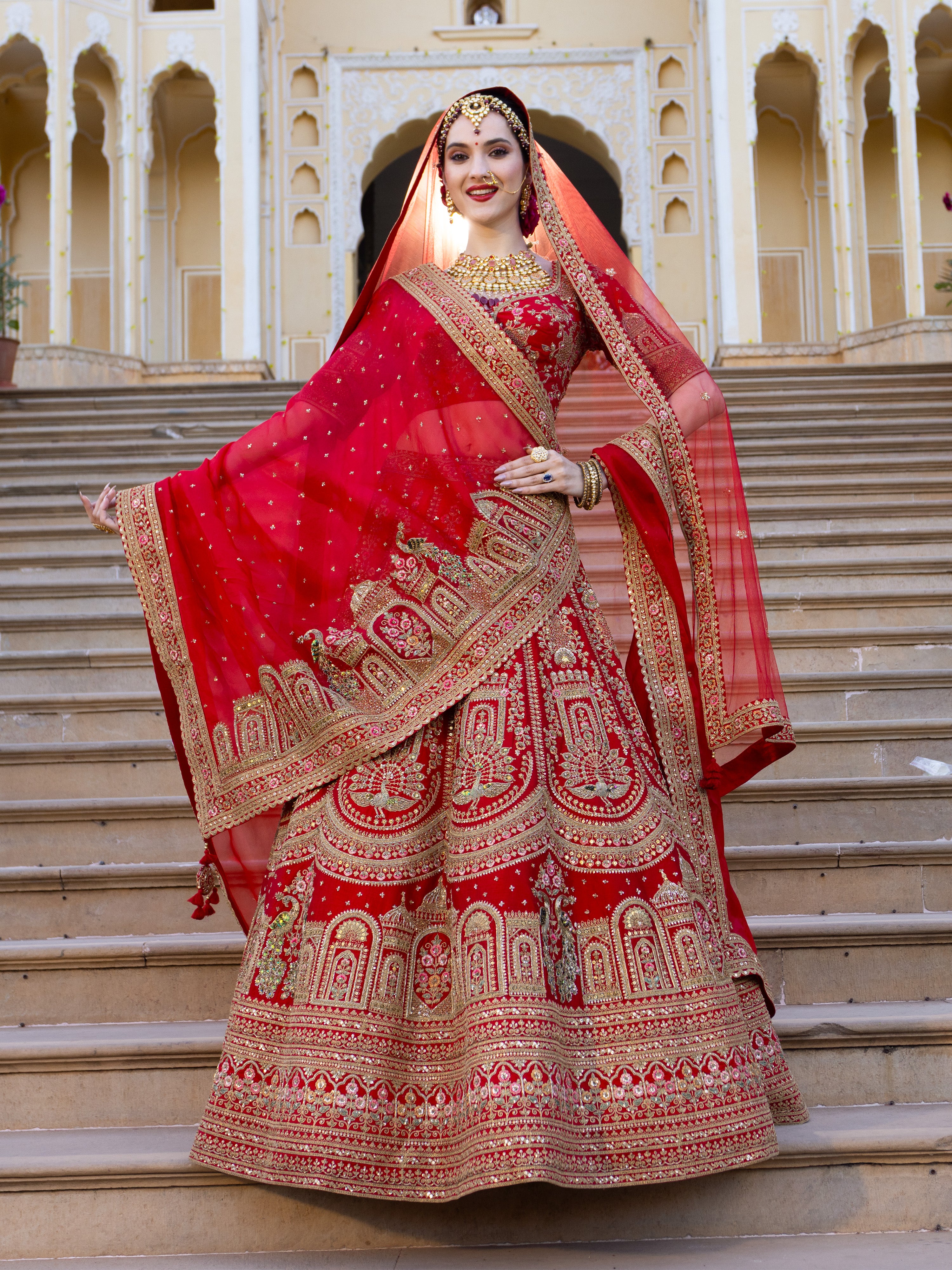 Step into timeless grandeur with this exquisite royal red bridal lehenga, inspired by India’s regal architectural heritage. Crafted to perfection, the lehenga showcases intricate zari embroidery featuring palace arches, domes, and traditional motifs that narrate a story of royal opulence. The rich red base is beautifully accentuated with antique gold detailing, creating a striking balance of tradition and luxury.