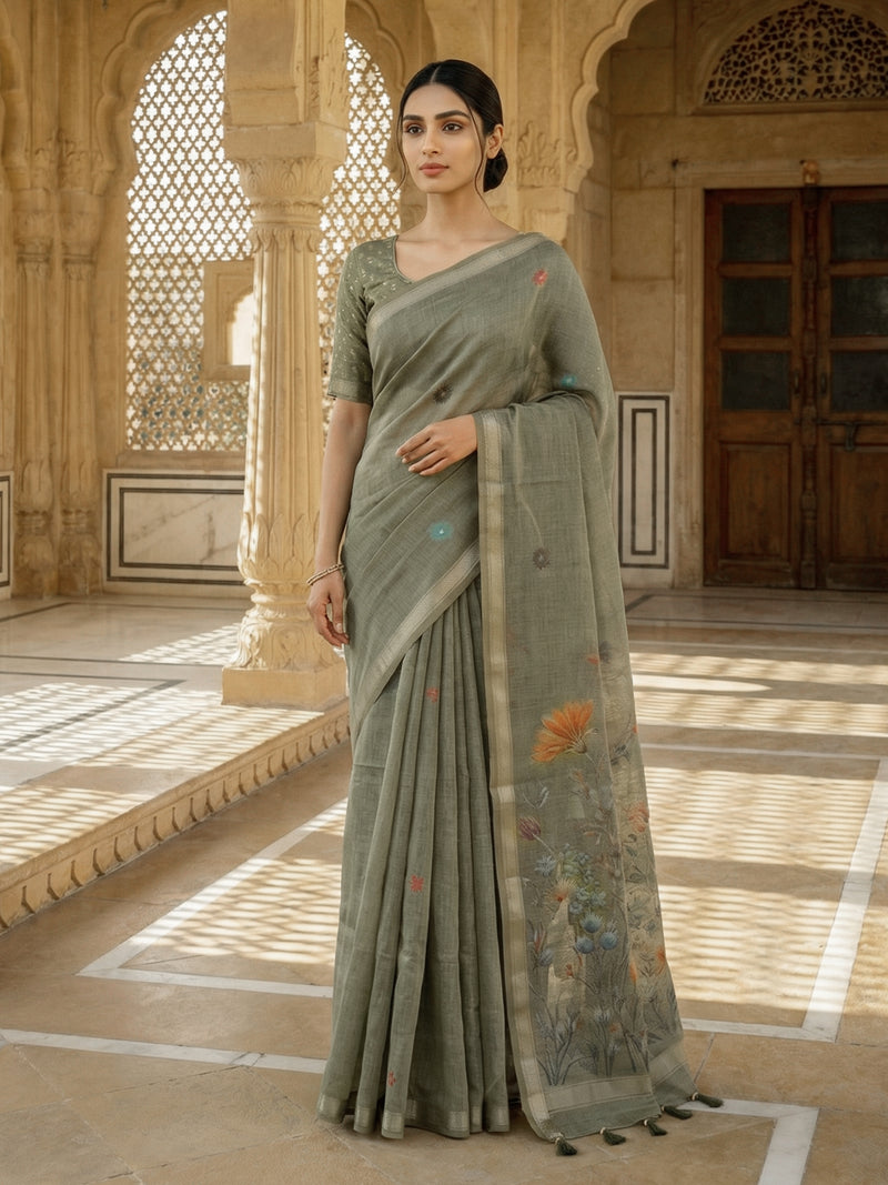 Chanderi Cotton Silk Saree in Sage Green with Butta Body and Floral Printed Pallu
