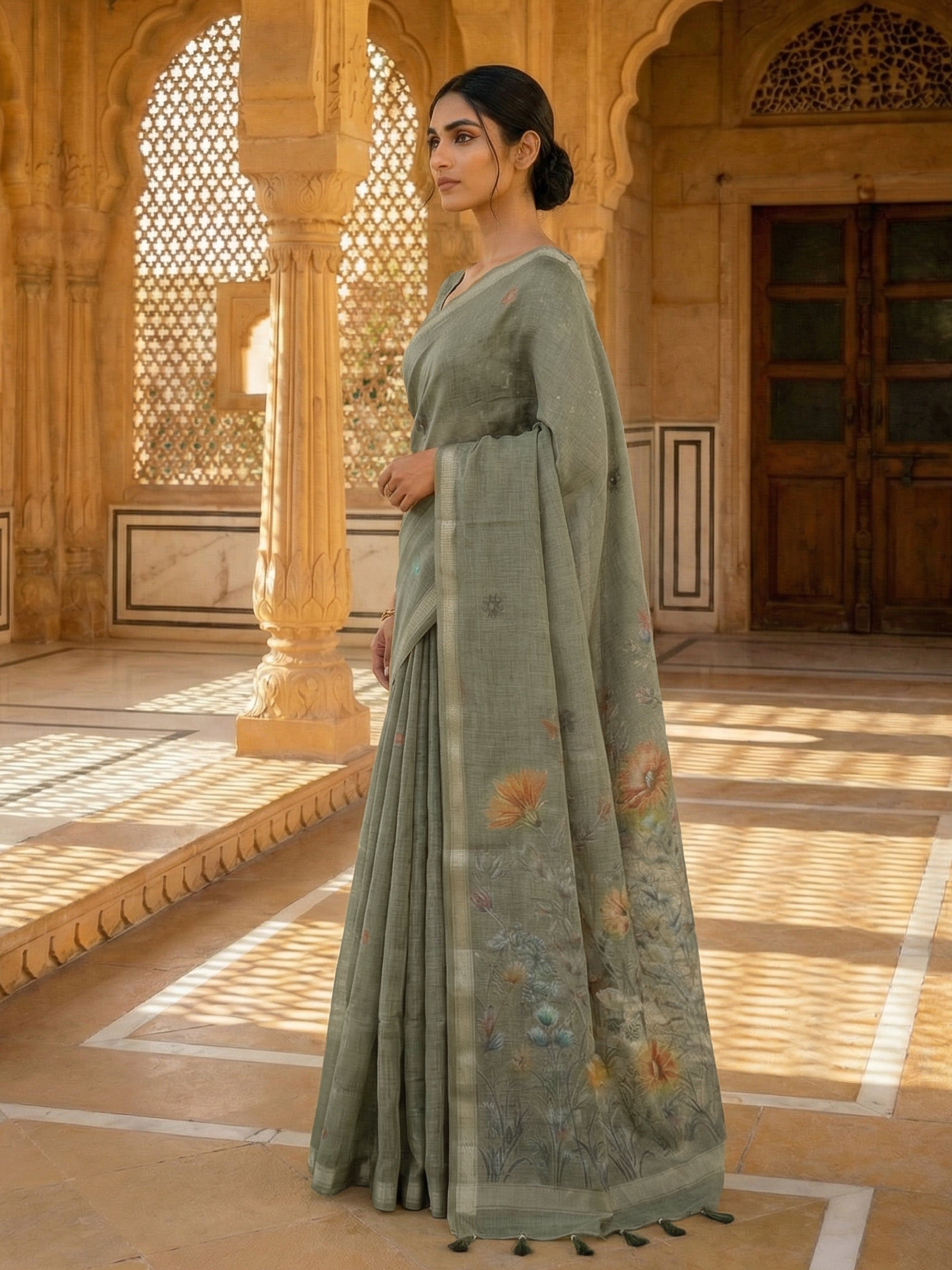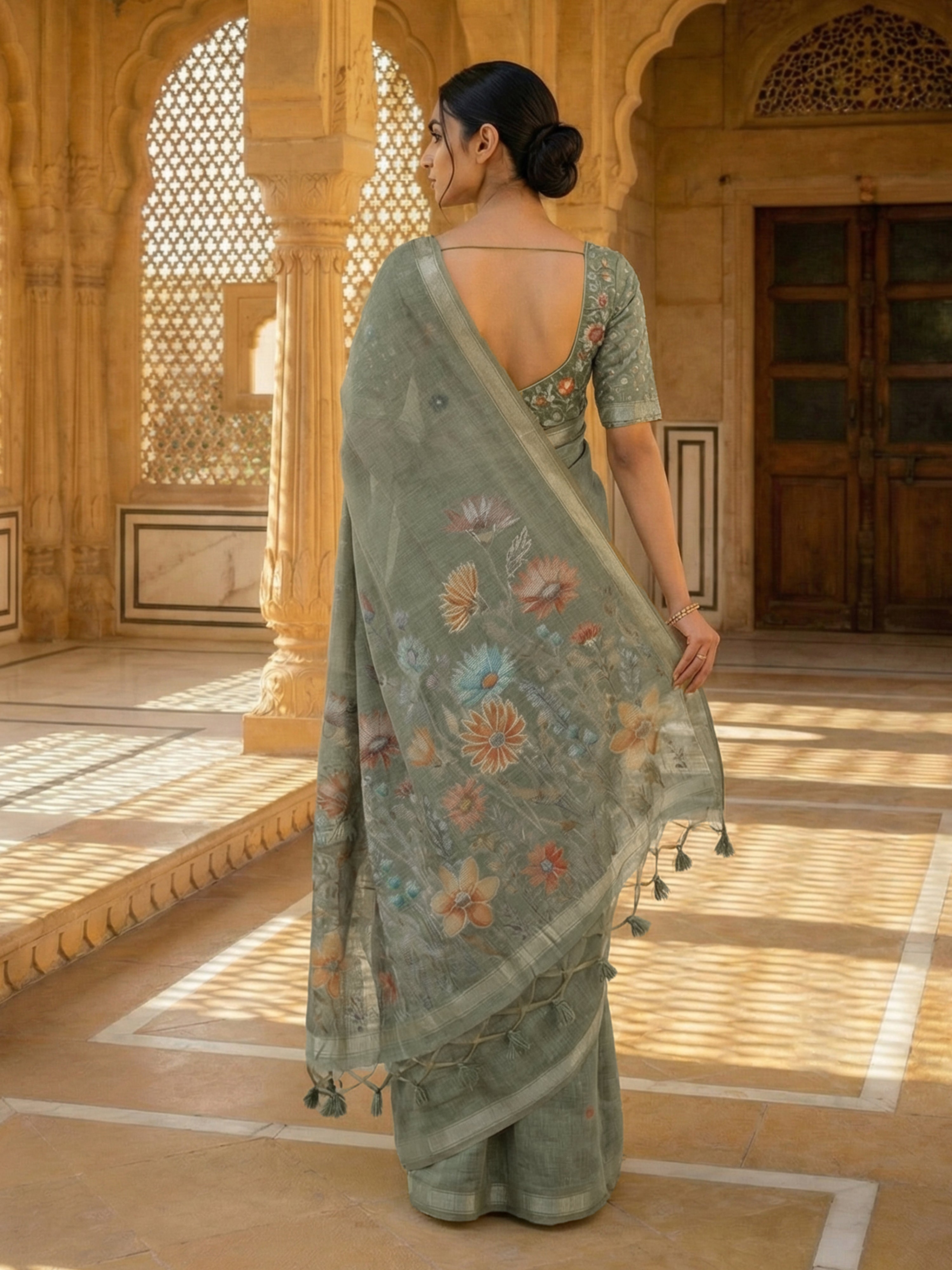 The highlight of the saree is its rich floral printed pallu, showcasing vibrant multicolor blossoms inspired by nature, adding a refreshing contrast to the muted body. Finished with a soft zari border and decorative tassels along the pallu edge, the saree carries a perfect blend of tradition and contemporary appeal.