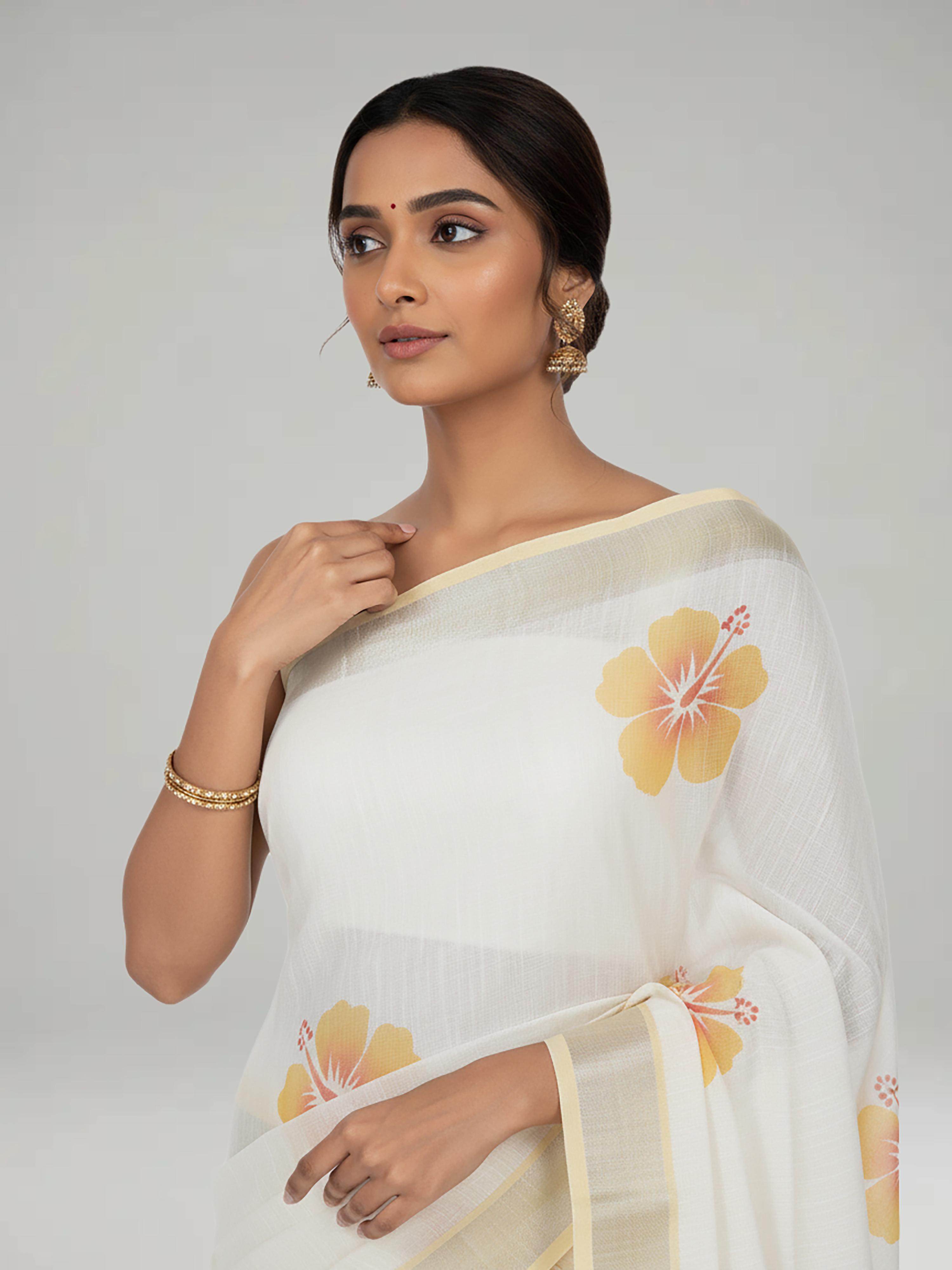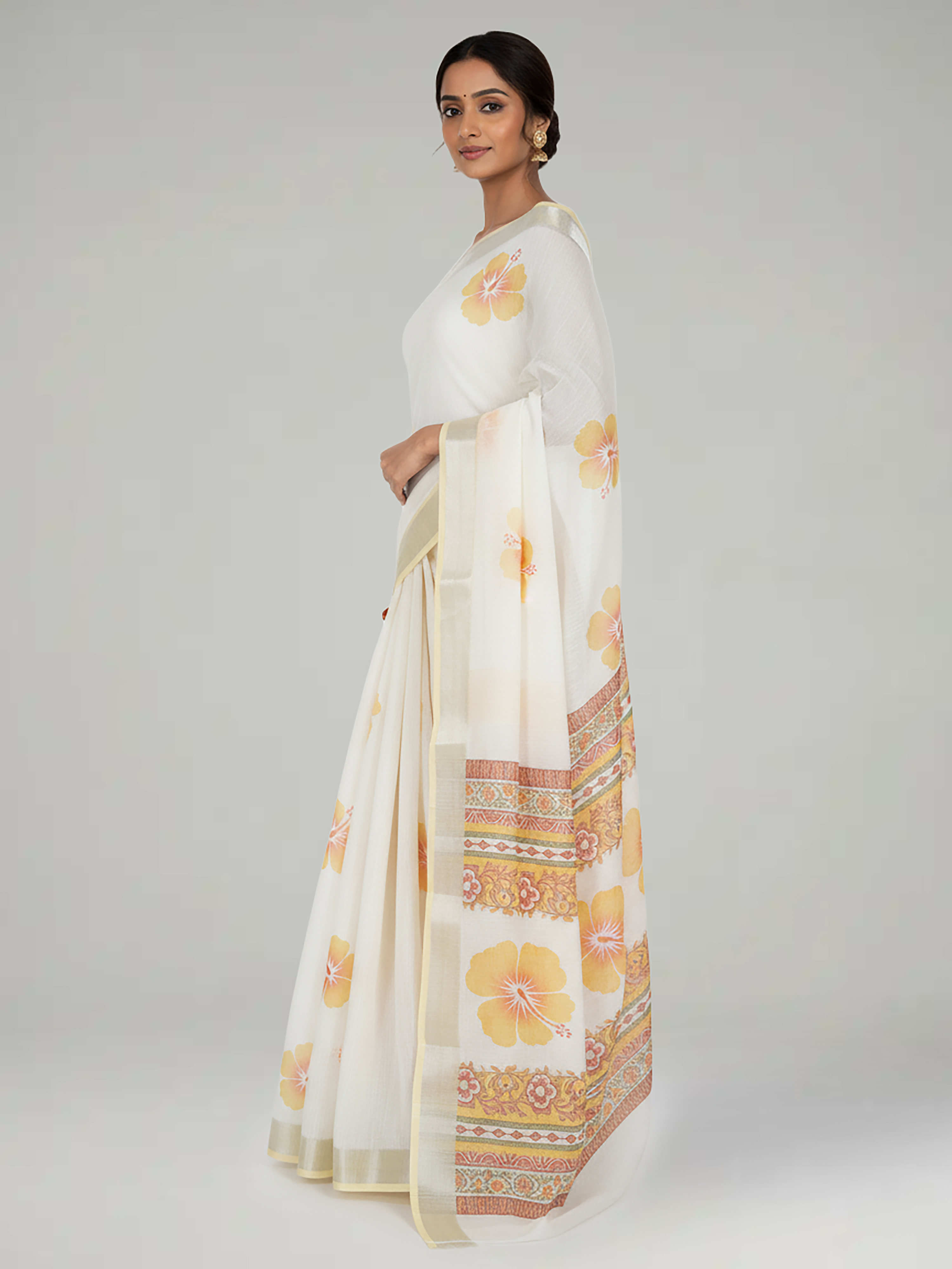 Soft semi linen saree in sand cream and yellow with hibiscus prints and silver contrast border.