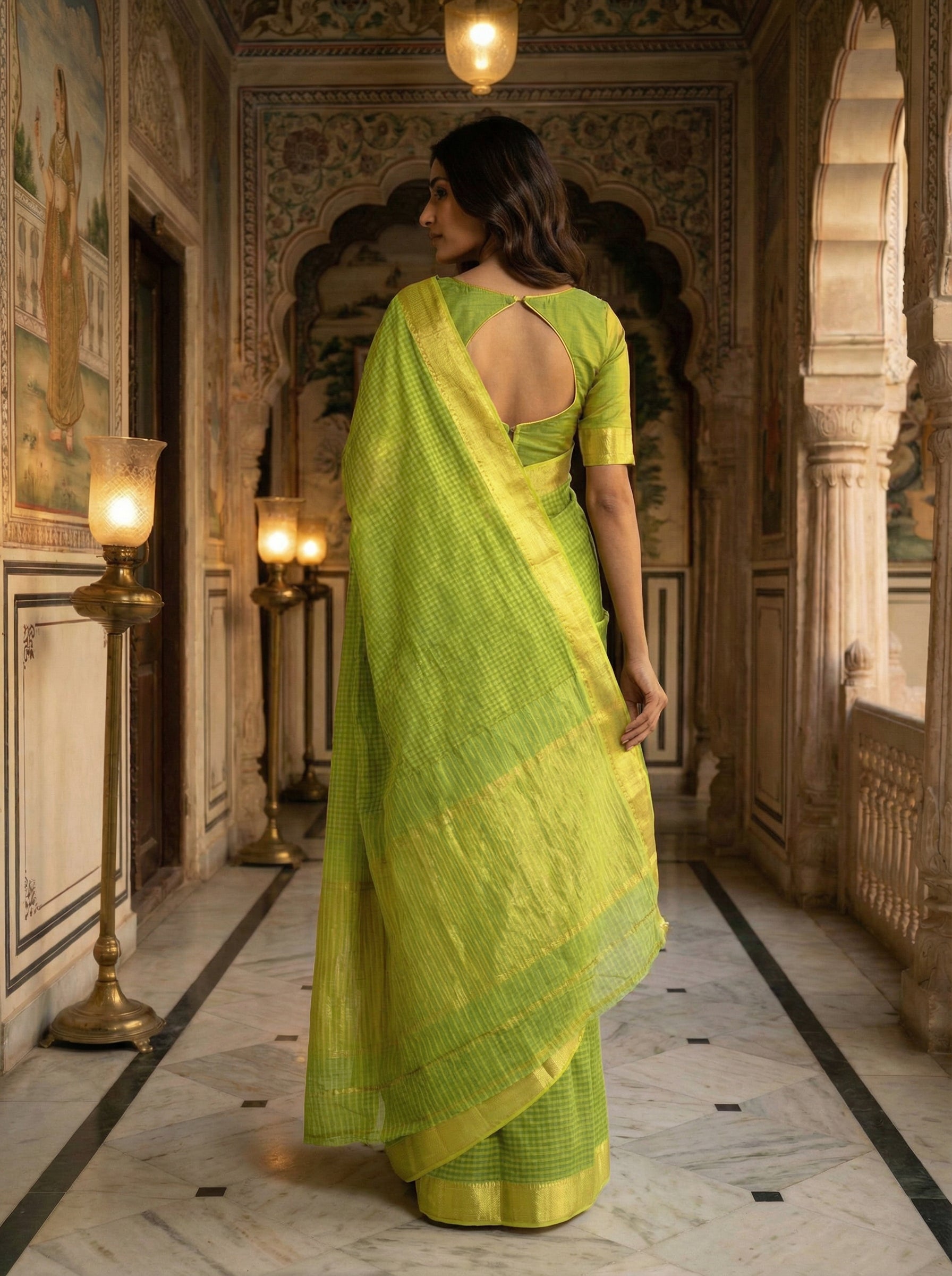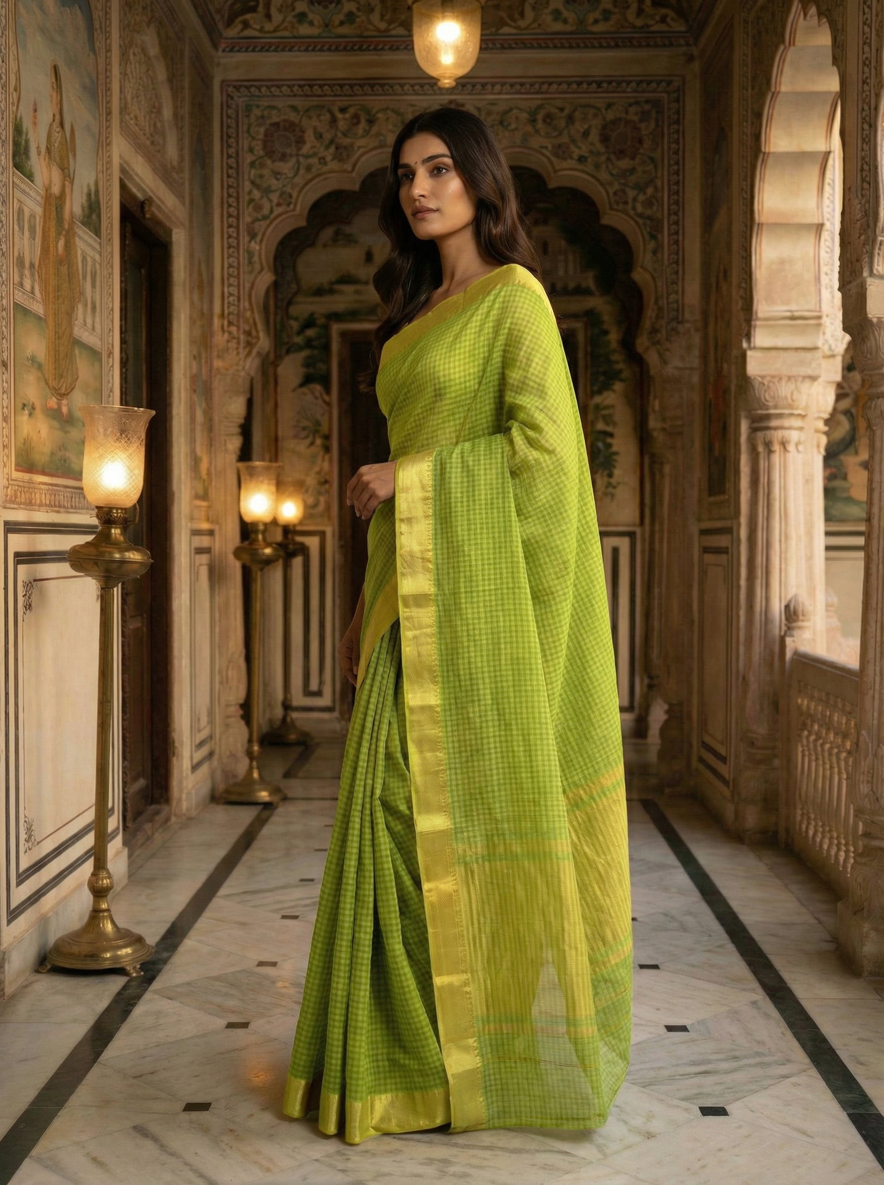 Elevate your everyday elegance with this stunning parrot green cotton saree, a masterpiece of traditional craftsmanship. The saree features an intricate yellow check design that adds visual depth and contemporary flair to the classic silhouette. The golden yellow kasavu body creates a harmonious contrast, enhancing the richness of the parrot green hue. Crafted from premium cotton, this saree offers exceptional breathability and comfort, making it ideal for warm weather and festive occasions alike. The natural drape of the fabric ensures a graceful, flattering fit that celebrates your personal