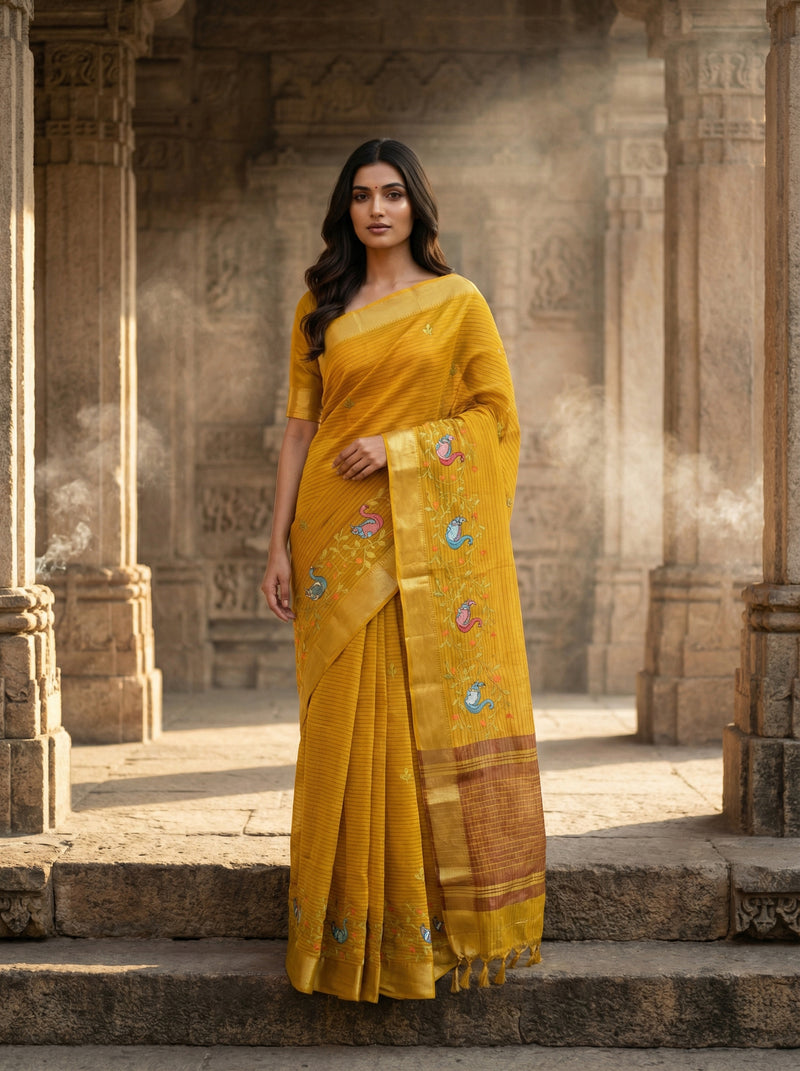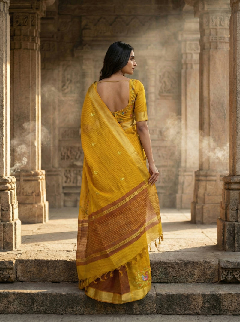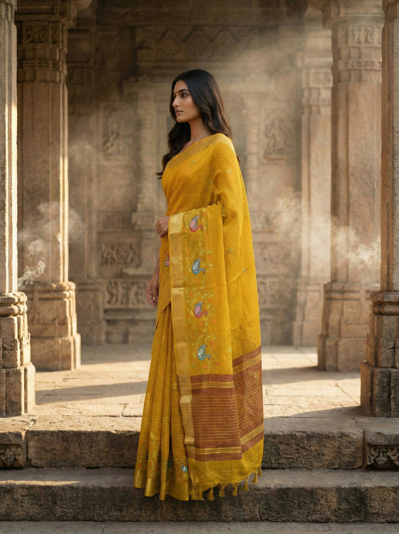 Elevate your everyday elegance with this striking yellow striped cotton saree, thoughtfully designed for the modern Indian woman. The crisp cotton fabric ensures breathability and comfort throughout the day, while intricate embroidery detailing adds a touch of refined sophistication. The luxurious zari border frames the saree beautifully, creating a polished finish that transitions seamlessly from casual gatherings to festive occasions. Perfect for those who appreciate traditional craftsmanship without compromising on comfort and practicality.