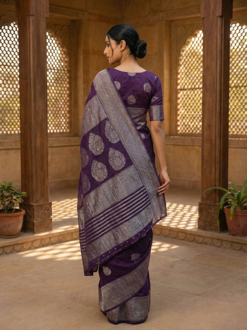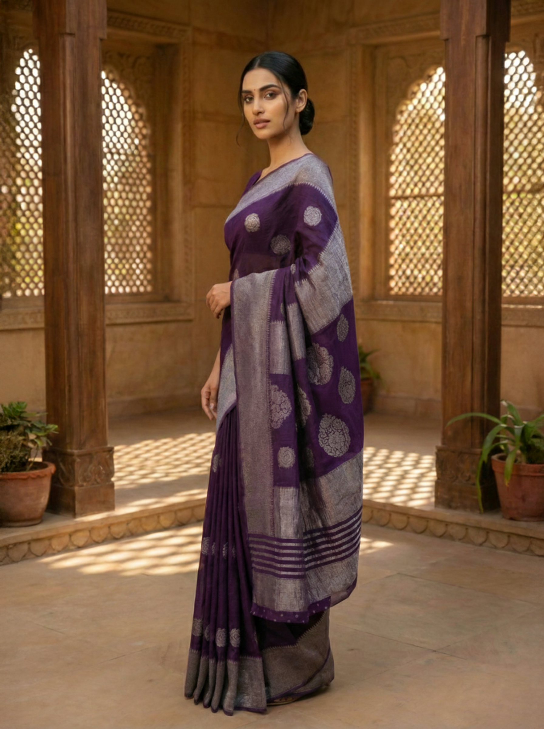 Elevate your ethnic wardrobe with this stunning purple saree, meticulously crafted with silver buttas adorning the entire body. The intricate silver embellishments create a luminous, sophisticated aesthetic that transitions seamlessly from festive occasions to formal celebrations. The rich purple hue provides an elegant canvas that allows the delicate silver detailing to command attention, while the all-over pattern ensures consistent visual appeal from every angle. Perfect for those who appreciate traditional craftsmanship combined with timeless elegance, this saree offers versatility and refined beauty for discerning wearers.