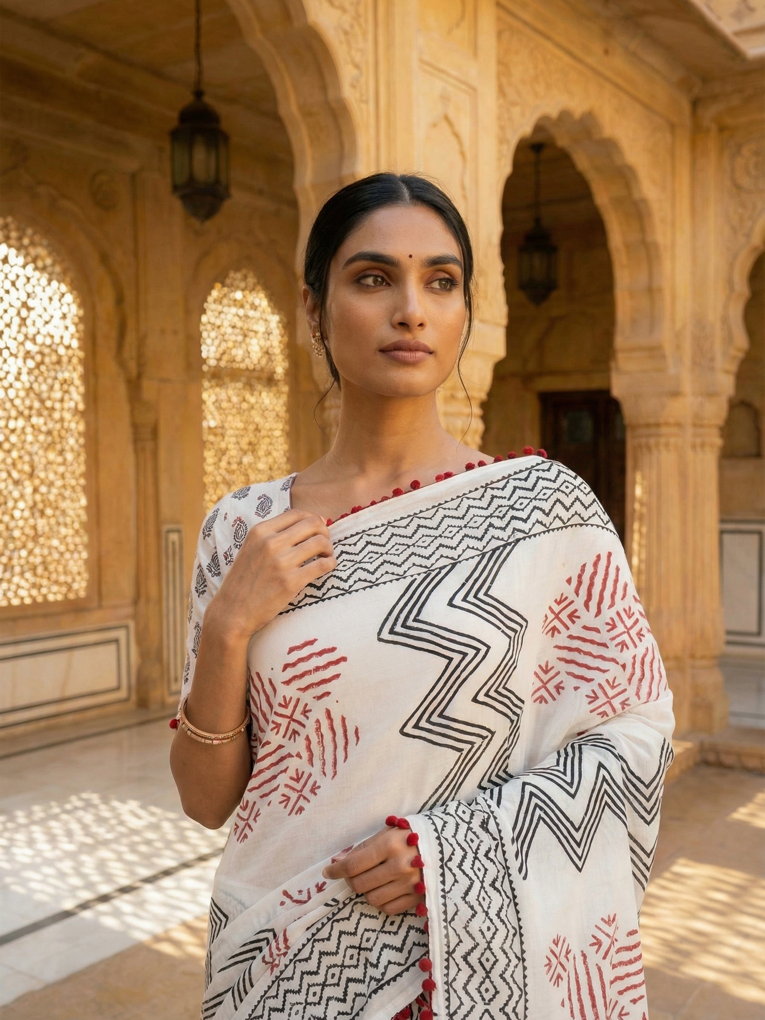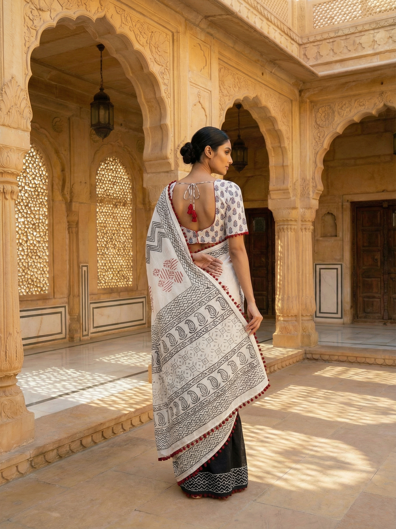 This elegant black and white printed cotton saree features a striking contrast design perfect for contemporary styling. The crisp white cotton fabric drapes beautifully while maintaining its shape throughout the day. The pallu showcases vibrant red tassels that add a traditional touch and movement to your ensemble. Ideal for casual gatherings, office wear, or festive occasions, this versatile piece combines comfort with timeless appeal. The printed pattern offers visual interest without overwhelming the silhouette, making it a practical addition to any saree collection.