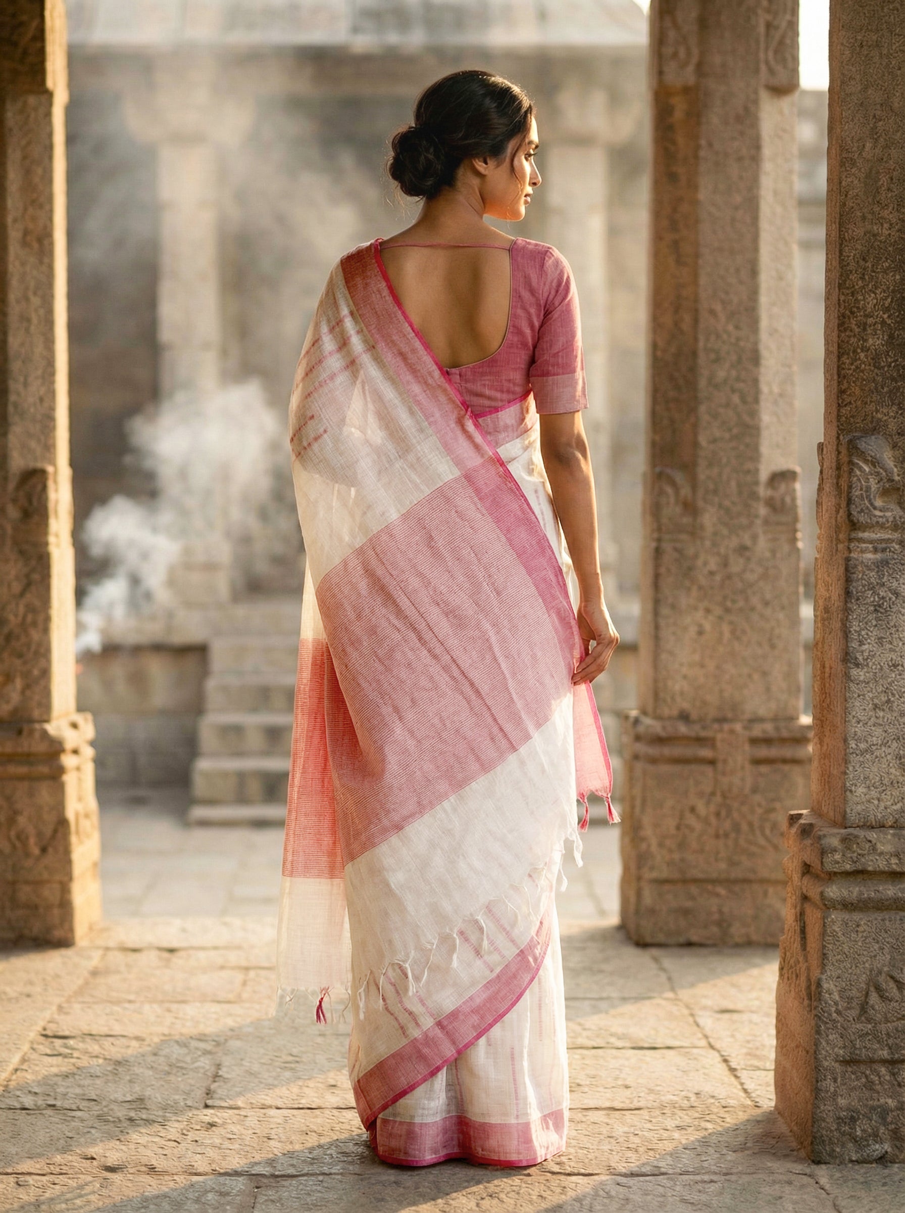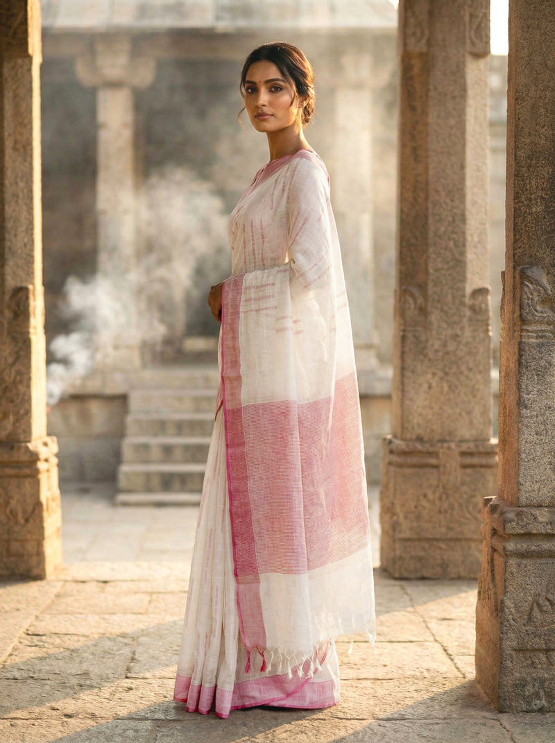 Off-White Cotton Saree with Pink Striped Weave and Contrast Border