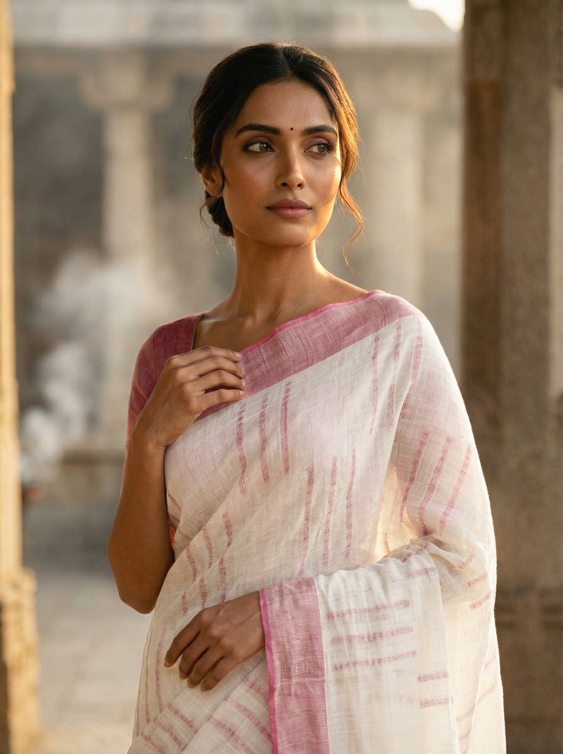 This elegant off-white cotton saree features a refined pink striped weave that adds subtle sophistication to your wardrobe. The contrasting border provides a striking frame, enhancing the saree's traditional appeal while maintaining contemporary versatility. Crafted from breathable cotton, this piece offers comfort for everyday wear and special occasions alike. The balanced color palette makes it easy to style with various blouse options, while the quality weave ensures durability through repeated wear. Perfect for those who appreciate classic Indian textiles with understated elegance.