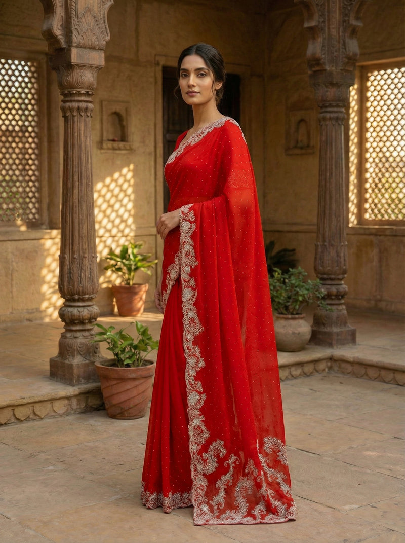 This exquisite red designer saree showcases intricate embellishments that elevate traditional craftsmanship to contemporary elegance. Crafted with meticulous attention to detail, the rich crimson fabric drapes beautifully while the ornate embroidery work adds sophisticated dimension and visual interest. Perfect for weddings, celebrations, and formal occasions, this piece combines timeless saree silhouette with modern design sensibilities. The luxurious embellishments catch light gracefully, ensuring you stand out with refined style and cultural grace.
