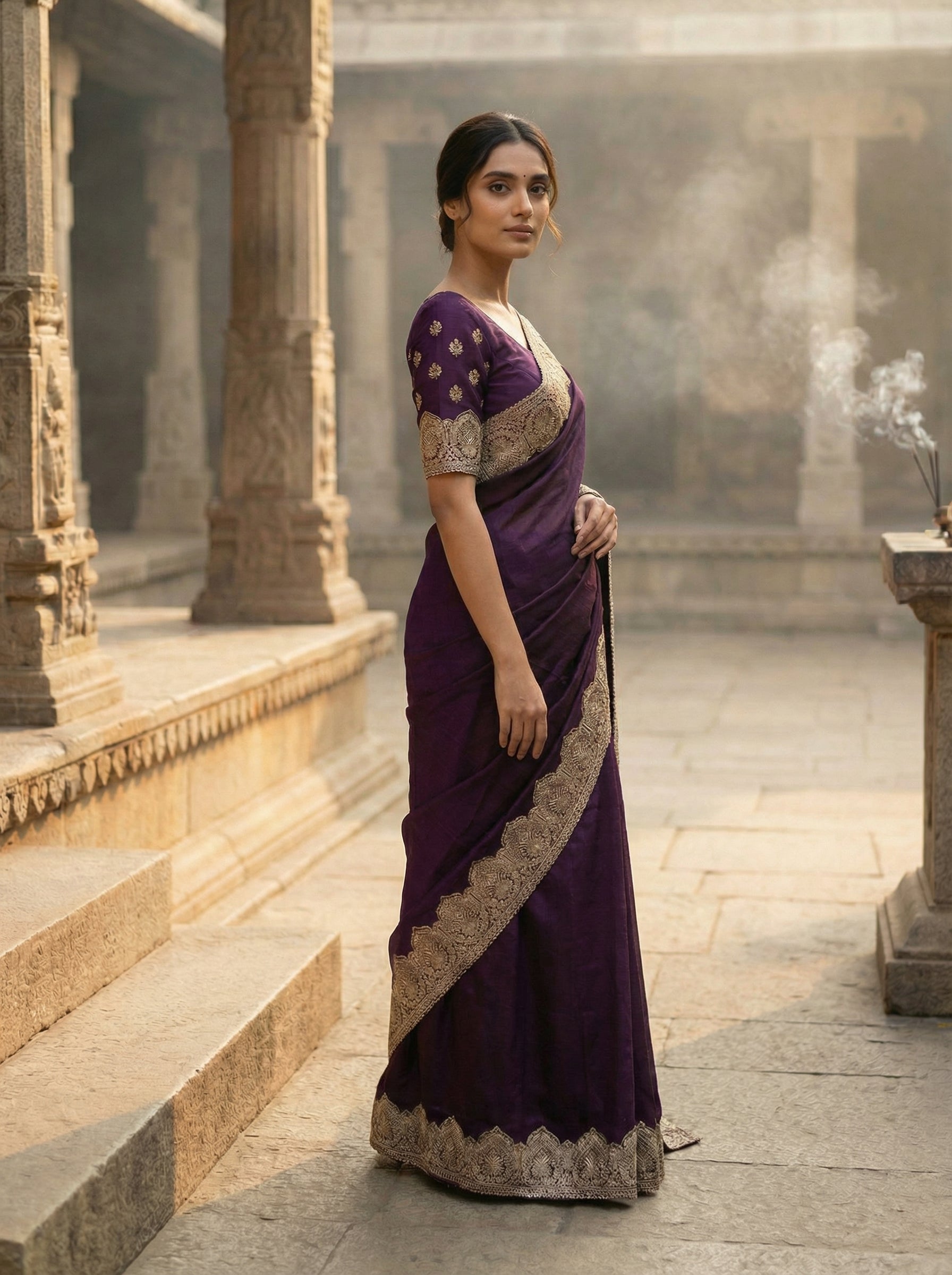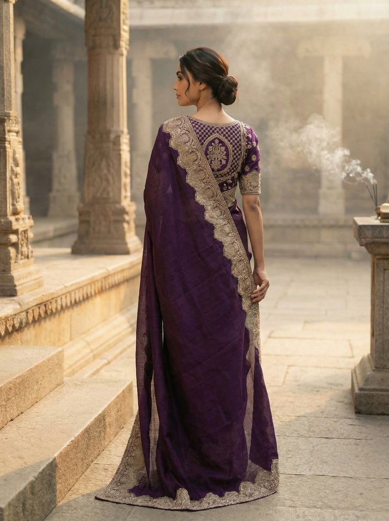 Elevate your ethnic wardrobe with this stunning purple designer saree, meticulously crafted with intricate embellishments that showcase traditional artistry. The rich purple hue exudes sophistication and elegance, making it an ideal choice for weddings, festivals, and special occasions. Premium fabric drapes beautifully, while the detailed embroidery and embellishments add a luxurious dimension to your ensemble. Perfect for those who appreciate fine craftsmanship and timeless style, this saree combines classic appeal with contemporary design sensibilities.