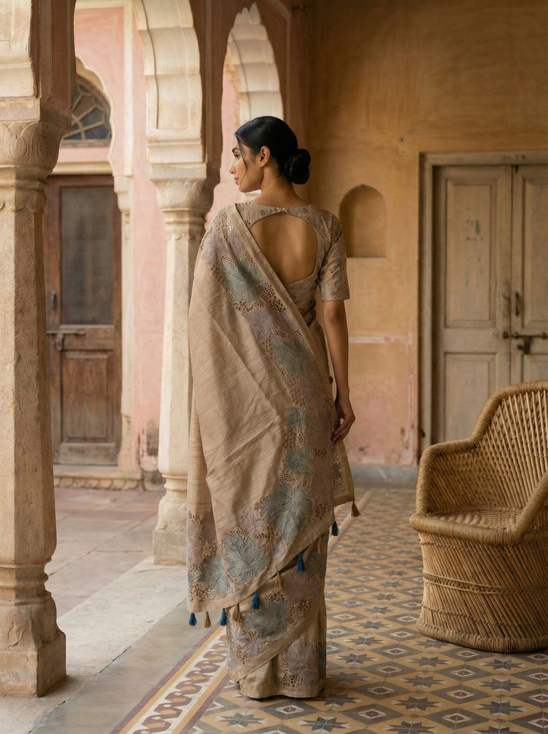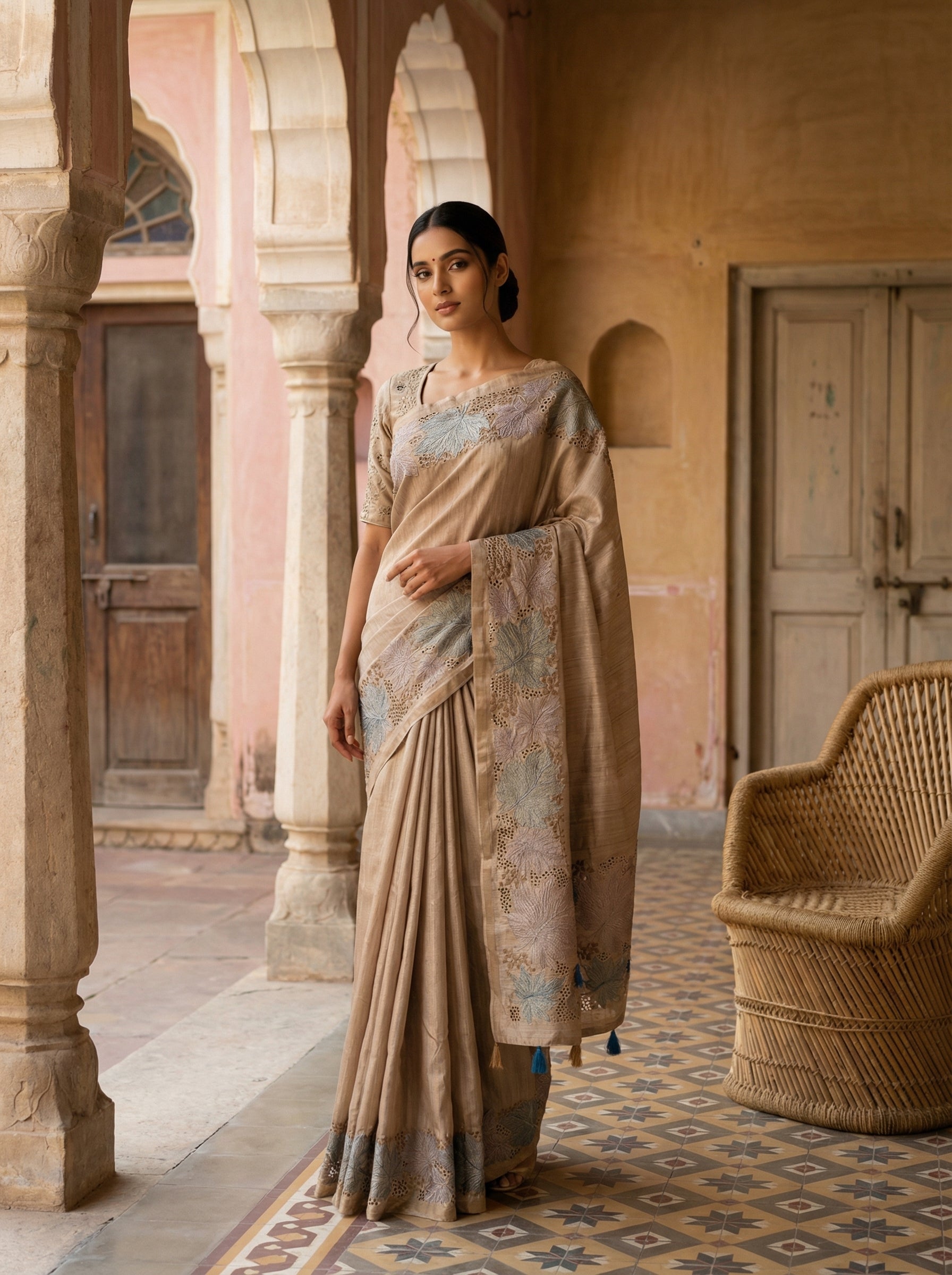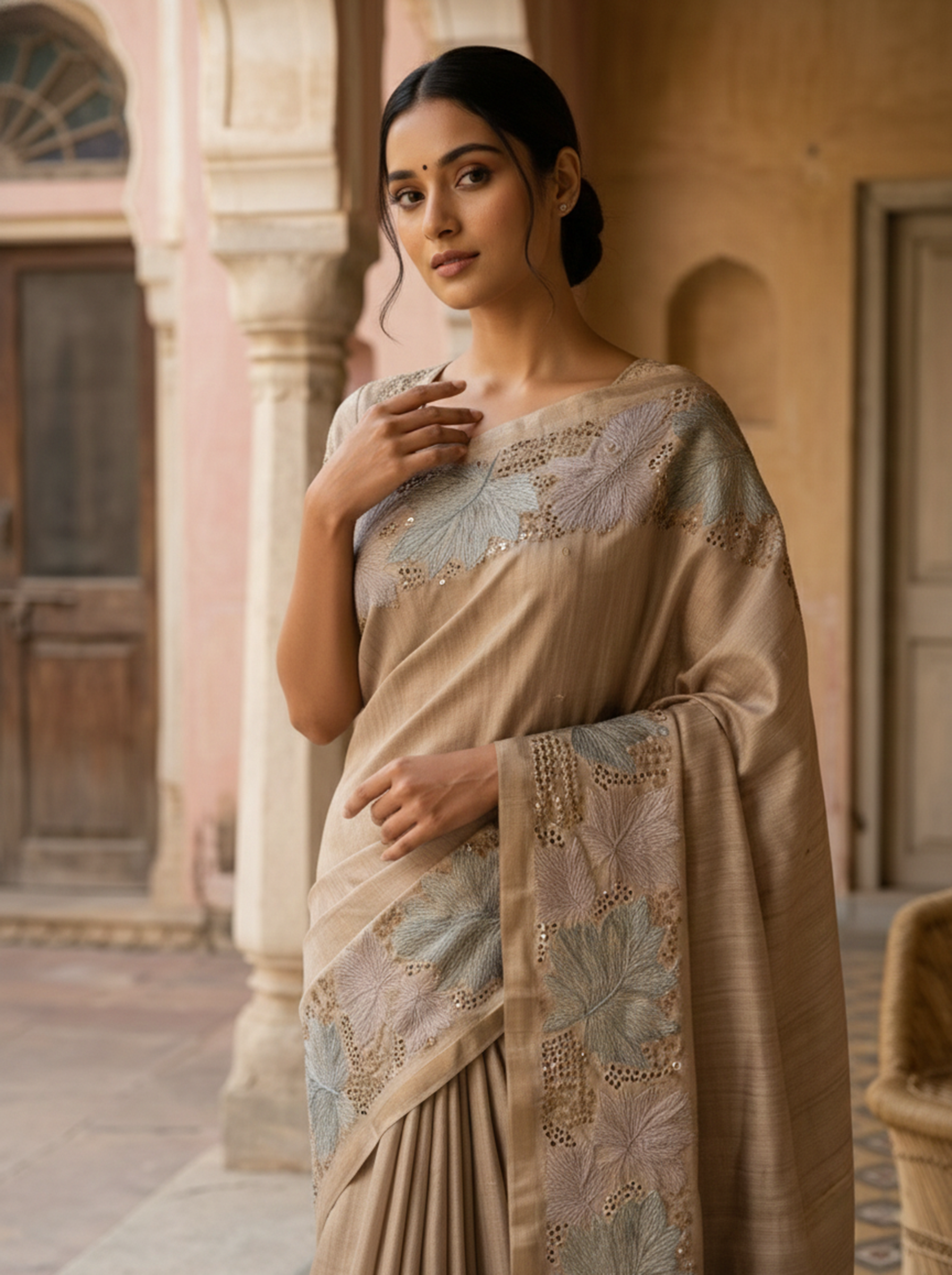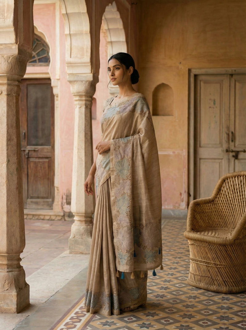 Elevate your ethnic wardrobe with this sophisticated beige silk saree, crafted from premium mulberry silk that drapes with natural elegance. The saree features an intricately embroidered floral border in contrasting threads, adding refined detail without overwhelming the understated palette. Perfect for festive occasions, weddings, or formal gatherings, this timeless piece combines traditional craftsmanship with versatile styling. The luxurious fabric ensures comfort throughout wear, while the delicate embroidery showcases expert artisanal work. Pair with traditional jewelry and a complementary blouse to complete your look.