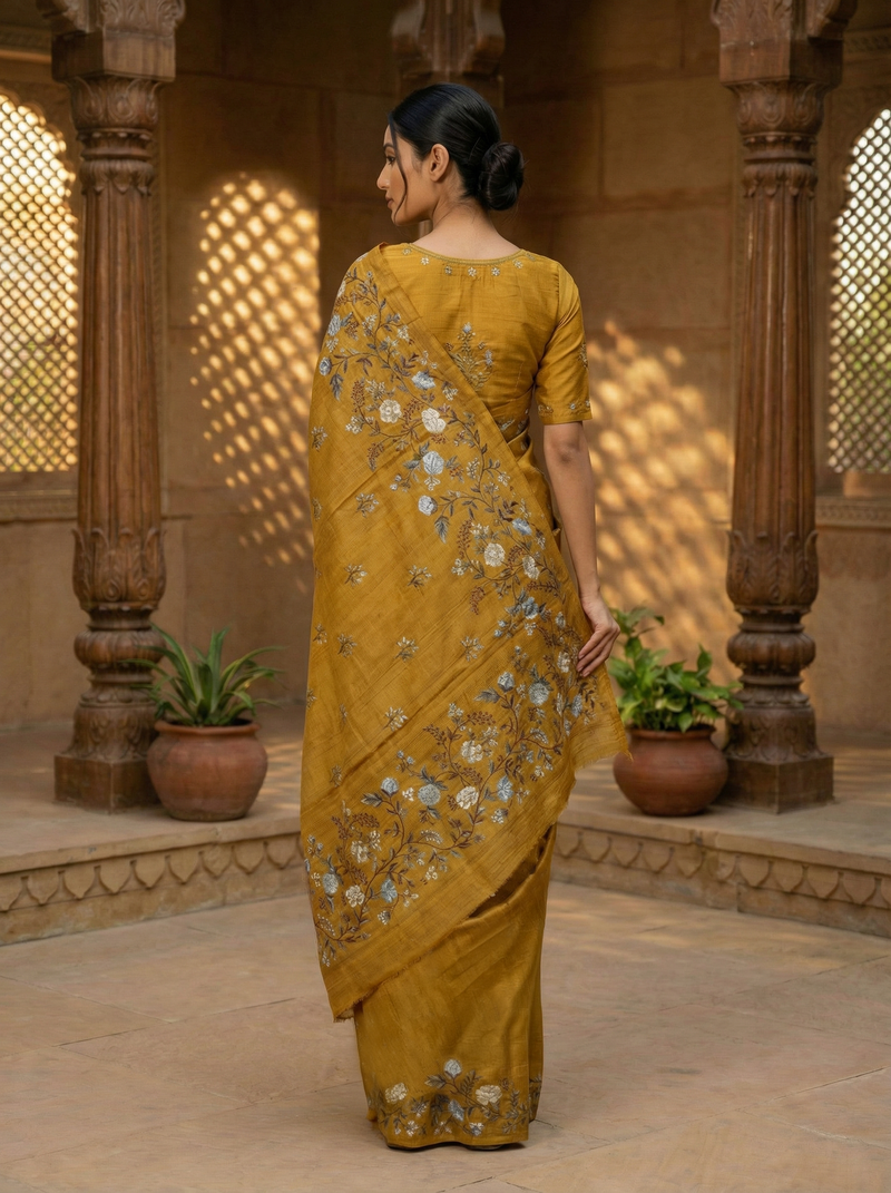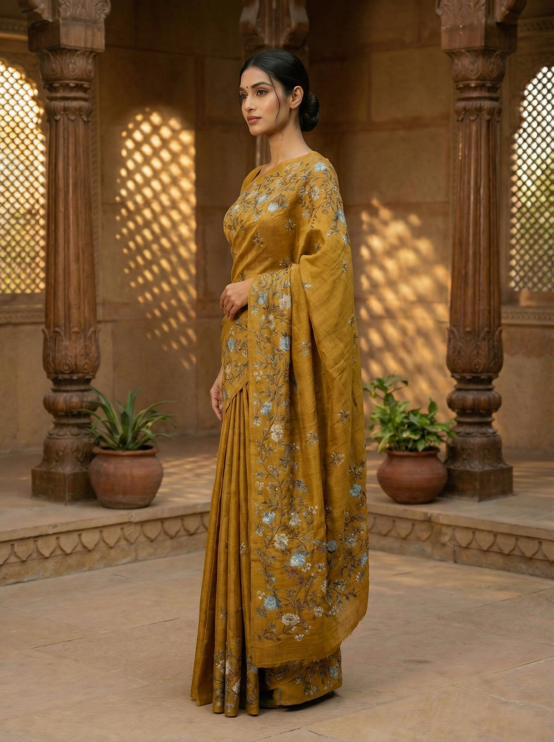 Elevate your ethnic wardrobe with this striking mustard tussar saree, featuring an intricate floral print that captures traditional artistry with contemporary appeal. Crafted from premium tussar silk, this fabric offers a luxurious drape and subtle sheen that enhances your natural grace. The warm mustard hue complements a wide range of skin tones, while the delicate floral motifs add visual interest without overwhelming the design. Perfect for festive occasions, family gatherings, or cultural celebrations, this saree combines comfort with timeless elegance. The natural texture of tussar silk ensures breathability, making it ideal for year-round wear. A versatile choice for those who appreciate refined craftsmanship and understated sophistication.