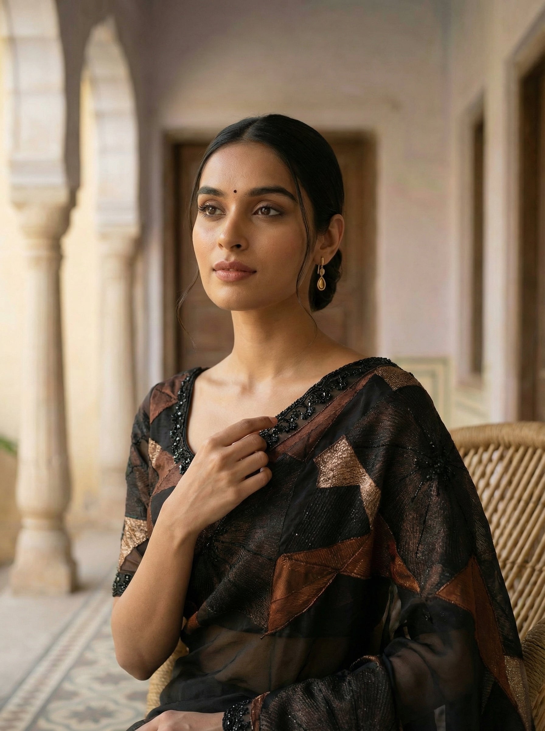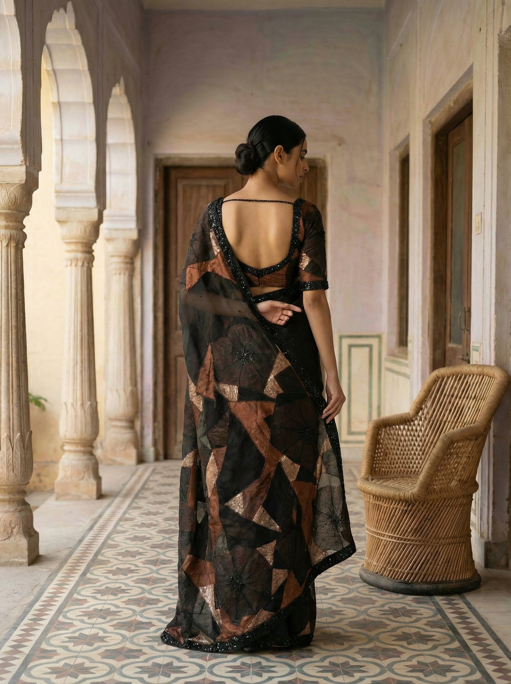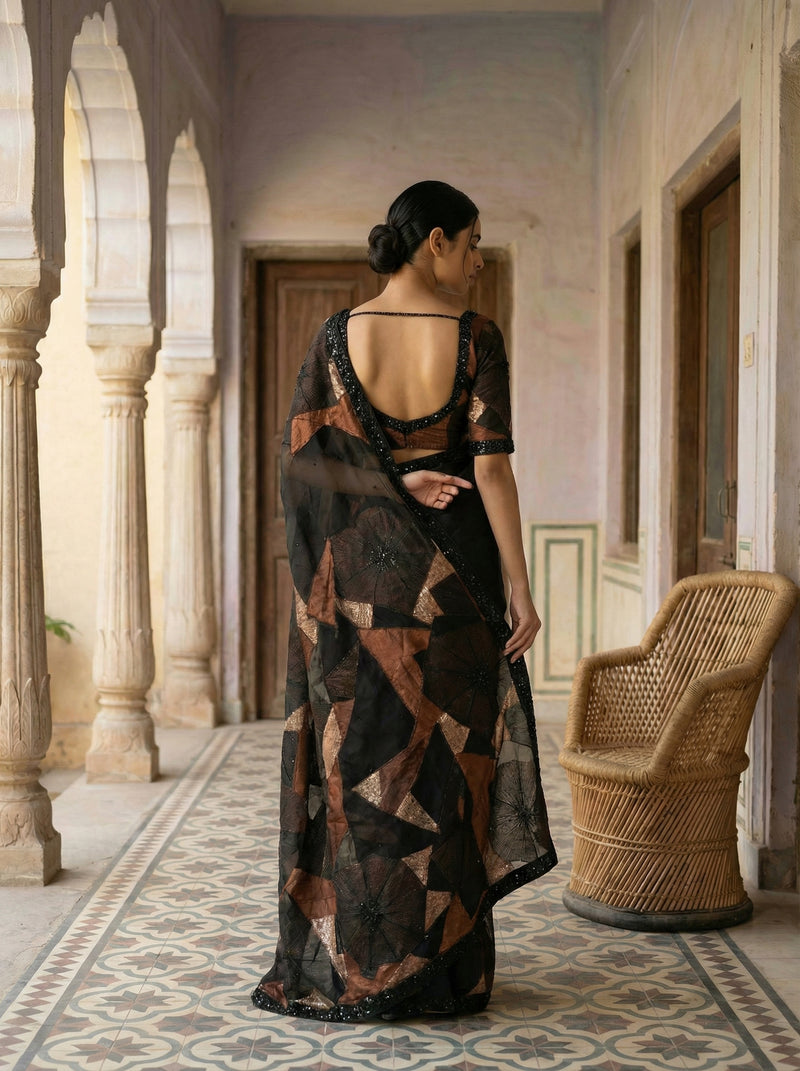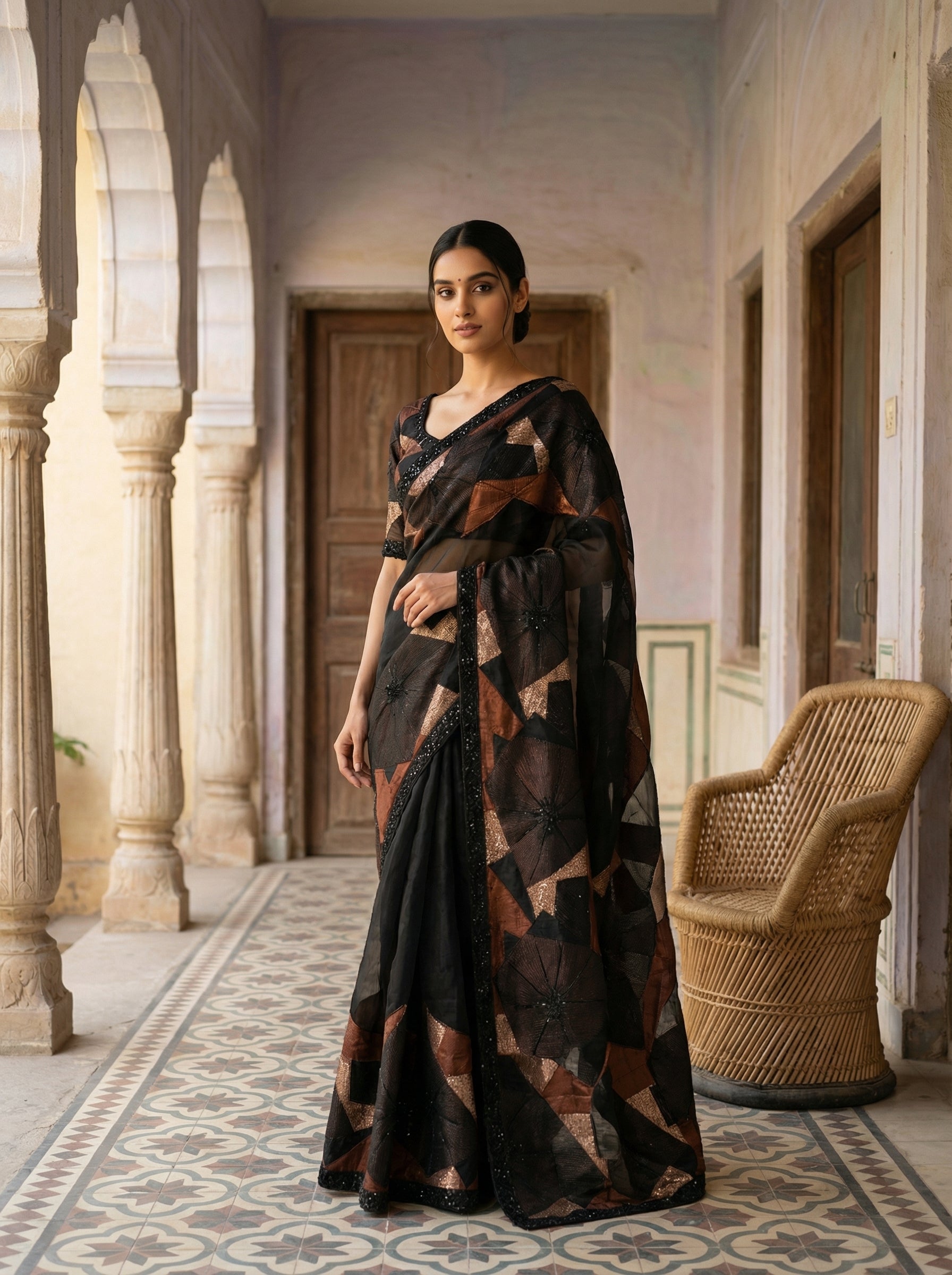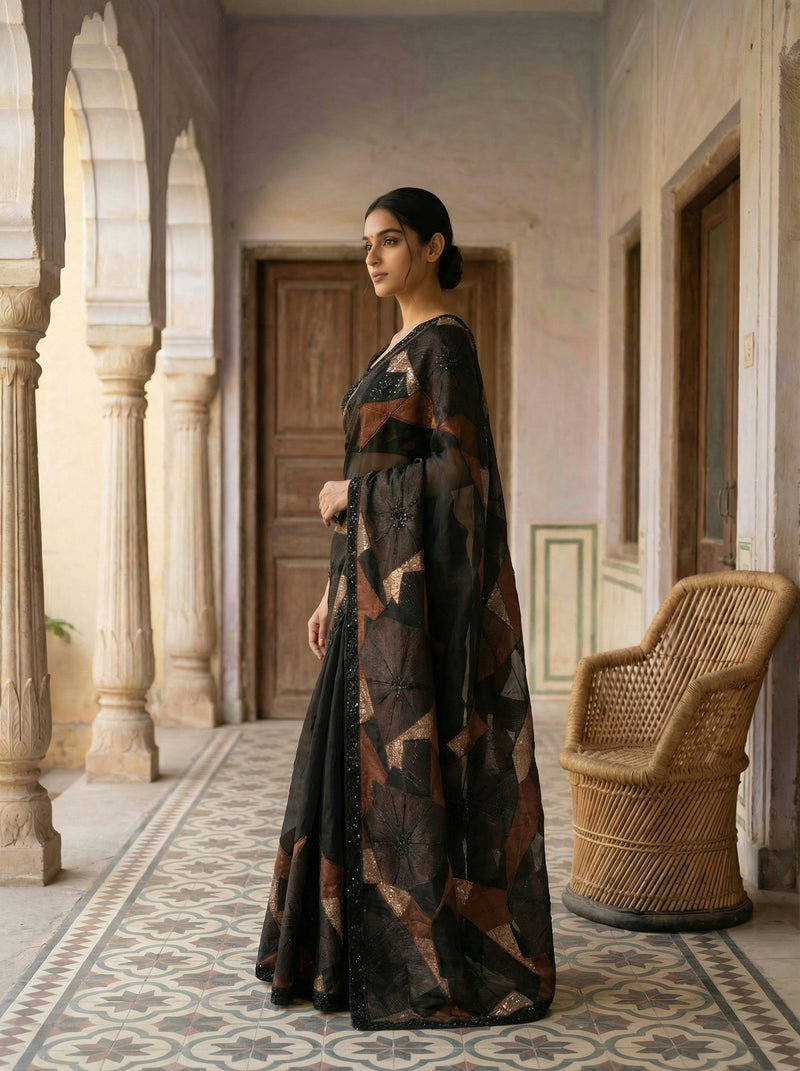 Elevate your ethnic wardrobe with this striking black designer saree, meticulously crafted with intricate geometric sequin embellishments. The precise placement of sequins creates a contemporary pattern that catches light beautifully, making it ideal for festive occasions, weddings, and formal celebrations. The classic black base ensures versatility in styling while the geometric detailing adds modern sophistication to traditional silhouette. Crafted with attention to detail, this saree combines timeless elegance with contemporary design sensibilities, perfect for the discerning wearer who appreciates refined craftsmanship and distinctive aesthetics.