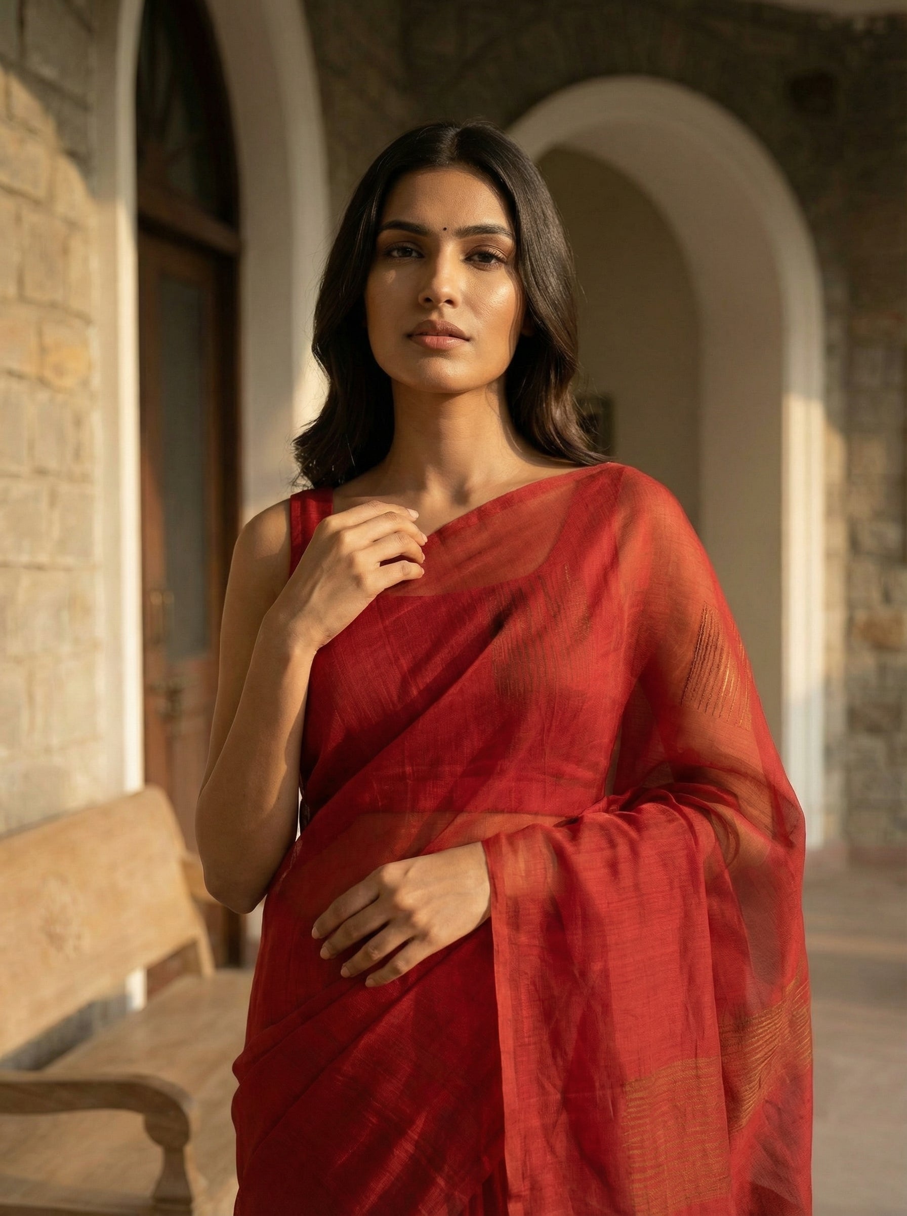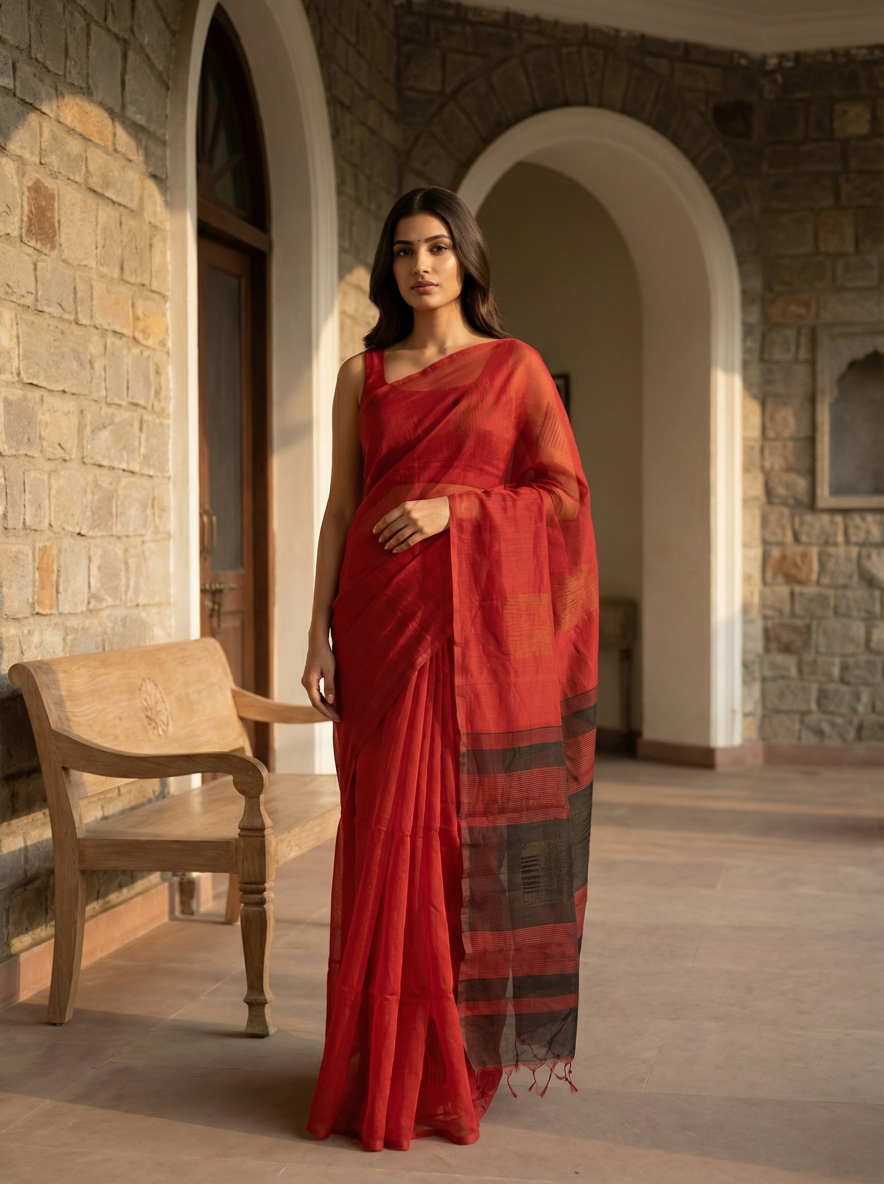 Classic Red Sayanora Saree with Sheer Texture and Subtle Contrast Pallu