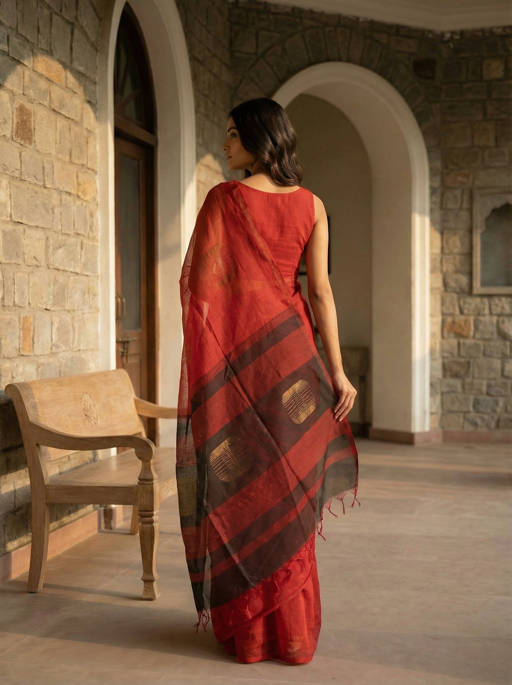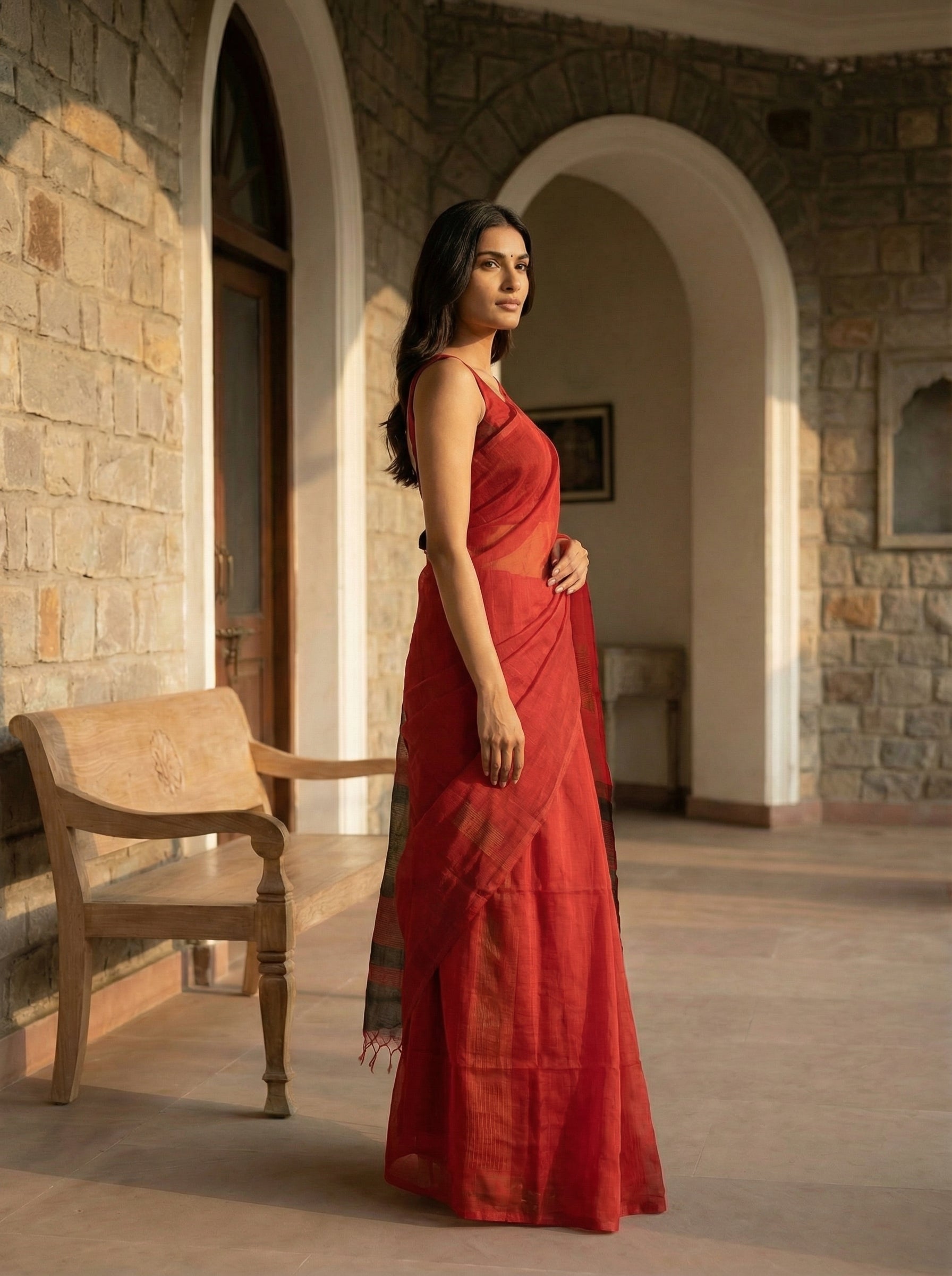 Elevate your traditional wardrobe with this exquisite Classic Red Sayanora Saree, a timeless piece that seamlessly blends heritage craftsmanship with contemporary elegance. The rich, lustrous red fabric serves as the perfect canvas for the saree's defining feature—its delicate sheer texture that adds an ethereal quality to your silhouette. The subtle contrast pallu introduces refined sophistication, creating visual interest without overwhelming the design. Ideal for festive occasions, celebrations, and formal gatherings, this saree drapes beautifully and offers the comfort of premium fabric. Whether you're attending a wedding, festival, or special event, this versatile piece ensures you make a graceful impression while honoring traditional Indian textile artistry.