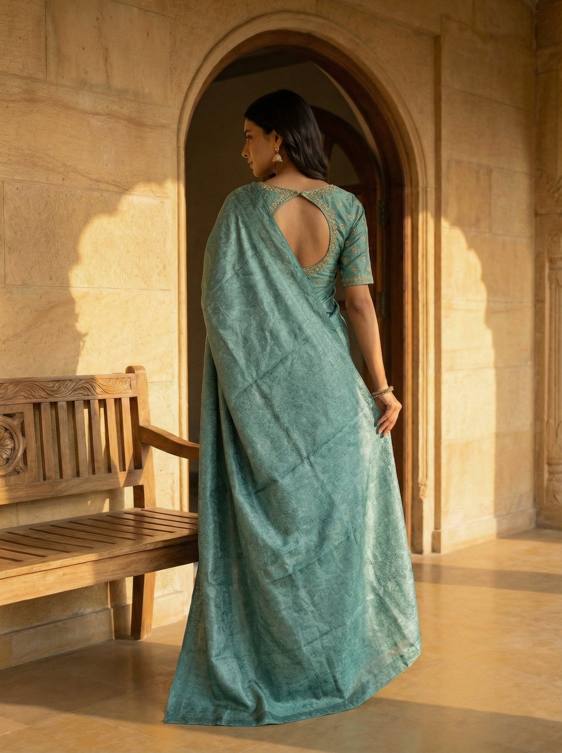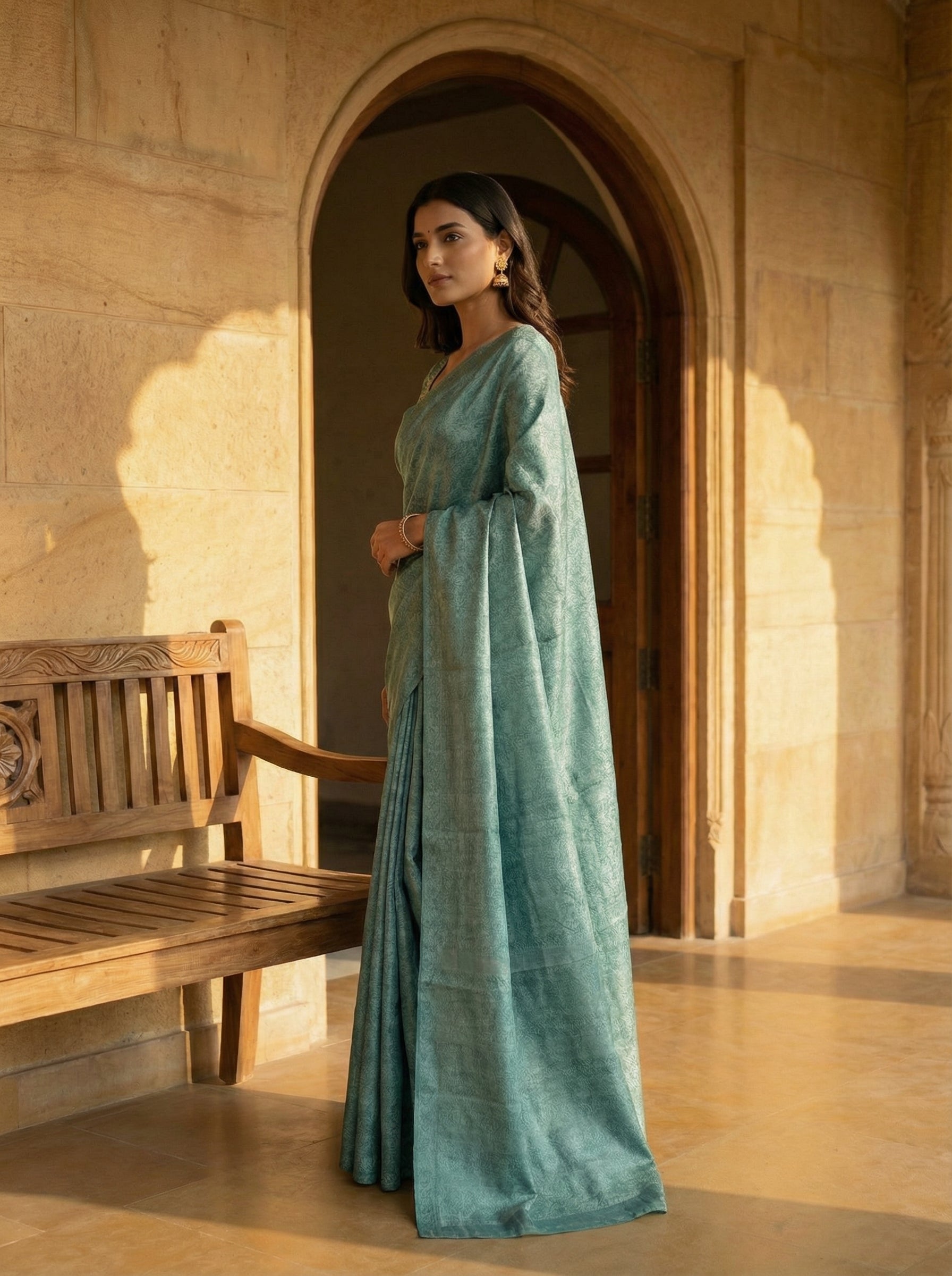 Experience the understated elegance of this sea green Tussar silk saree, where traditional craftsmanship meets contemporary design. The fabric showcases a subtle all-over print that adds visual interest without overwhelming the weave, while the natural textured finish of Tussar silk creates an authentic, organic appeal. Known for its distinctive slub texture and graceful drape, Tussar silk offers both comfort and sophistication for special occasions and celebrations. The sea green hue provides a versatile, flattering tone that complements various skin tones and styling preferences. Perfect for those who appreciate refined, understated luxury in their ethnic wardrobe.