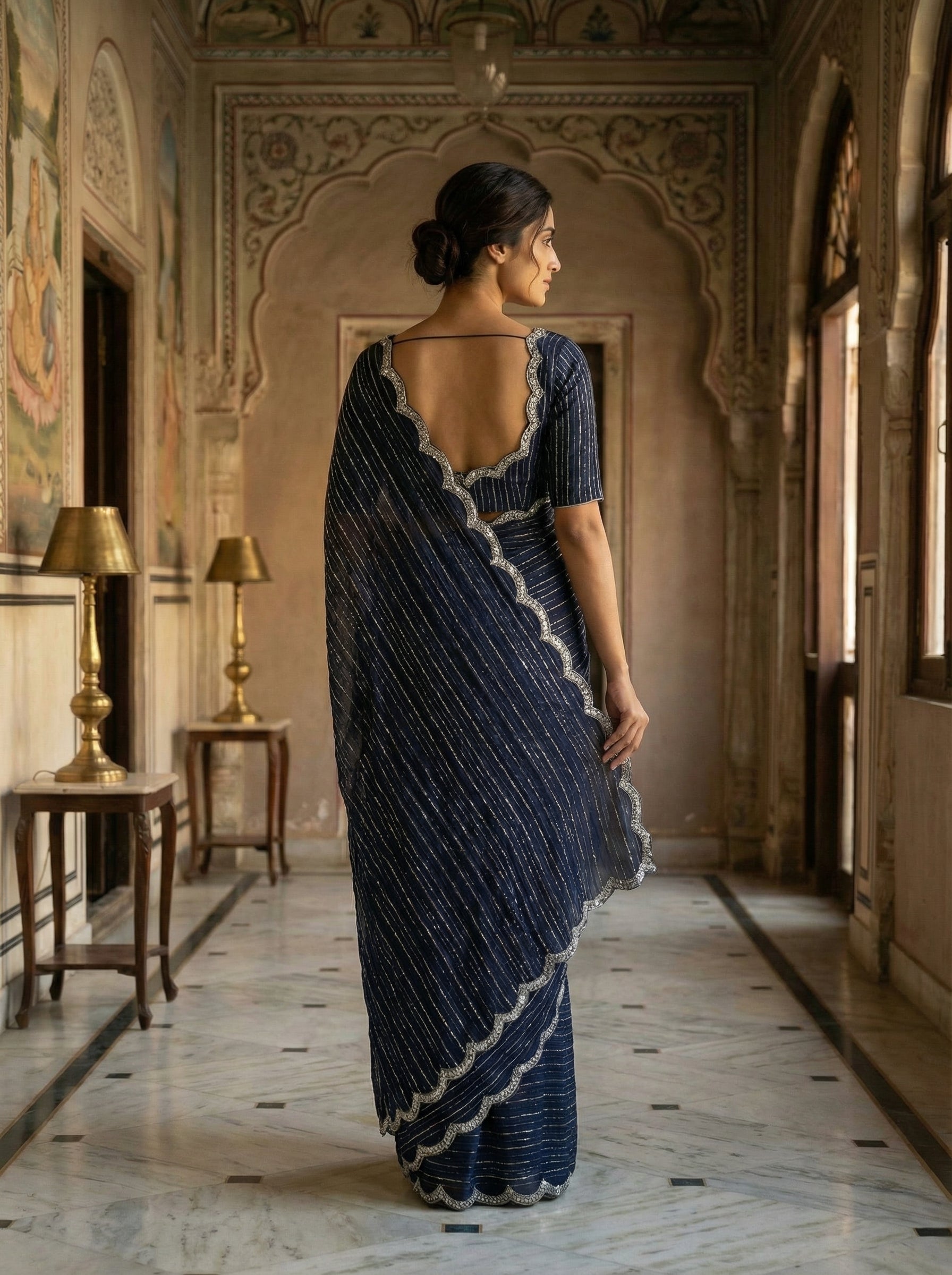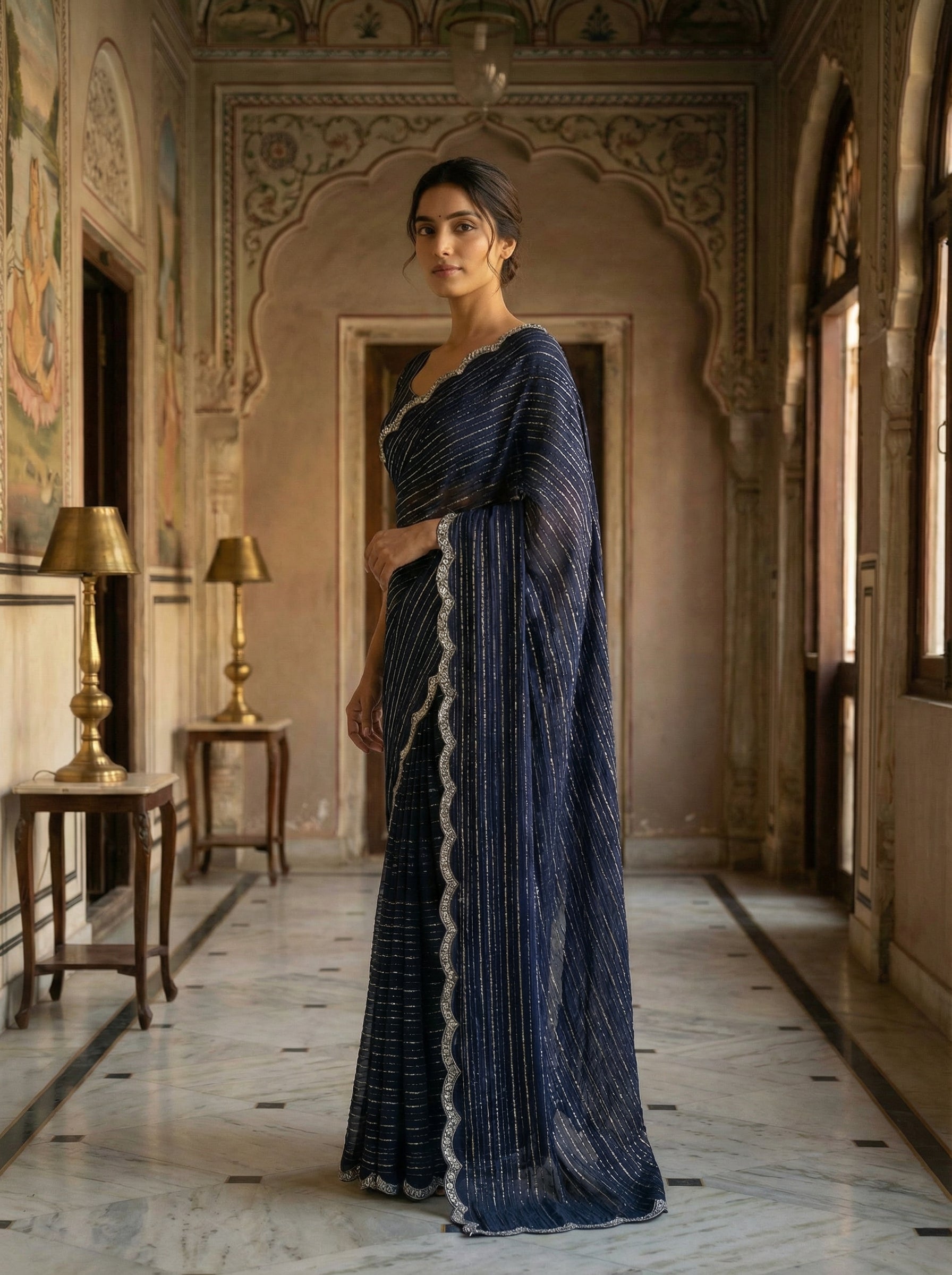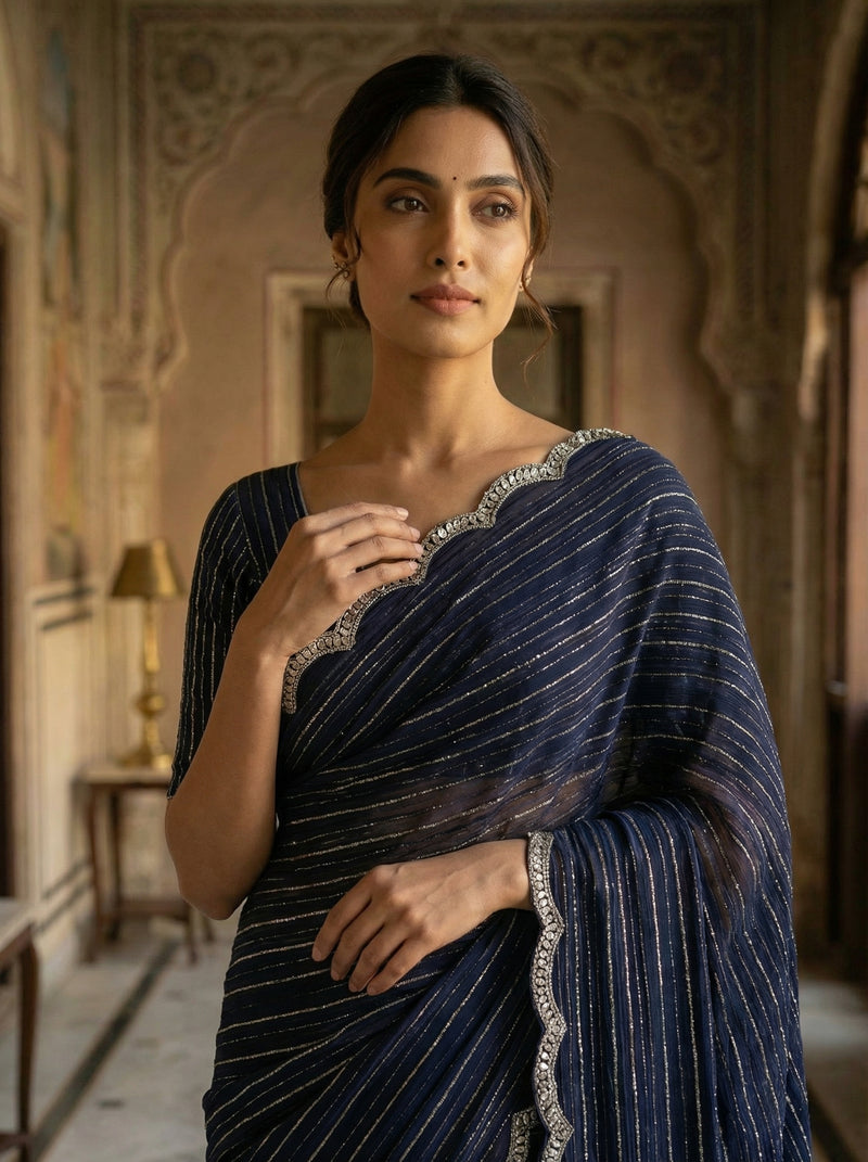 Dive into elegance with this stunning midnight blue designer saree that's ready to turn heads at any celebration. The shimmering stripe detailing catches light beautifully, adding just the right amount of sparkle without overwhelming the sophisticated base color. A scalloped silver border frames the entire piece, creating a refined finish that elevates your traditional look. Perfect for weddings, festivals, or those moments when you want to feel absolutely radiant. This saree effortlessly blends timeless charm with contemporary flair, making it a versatile addition to your ethnic wardrobe.
