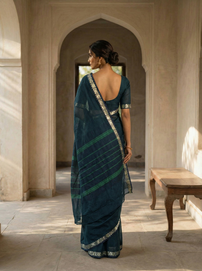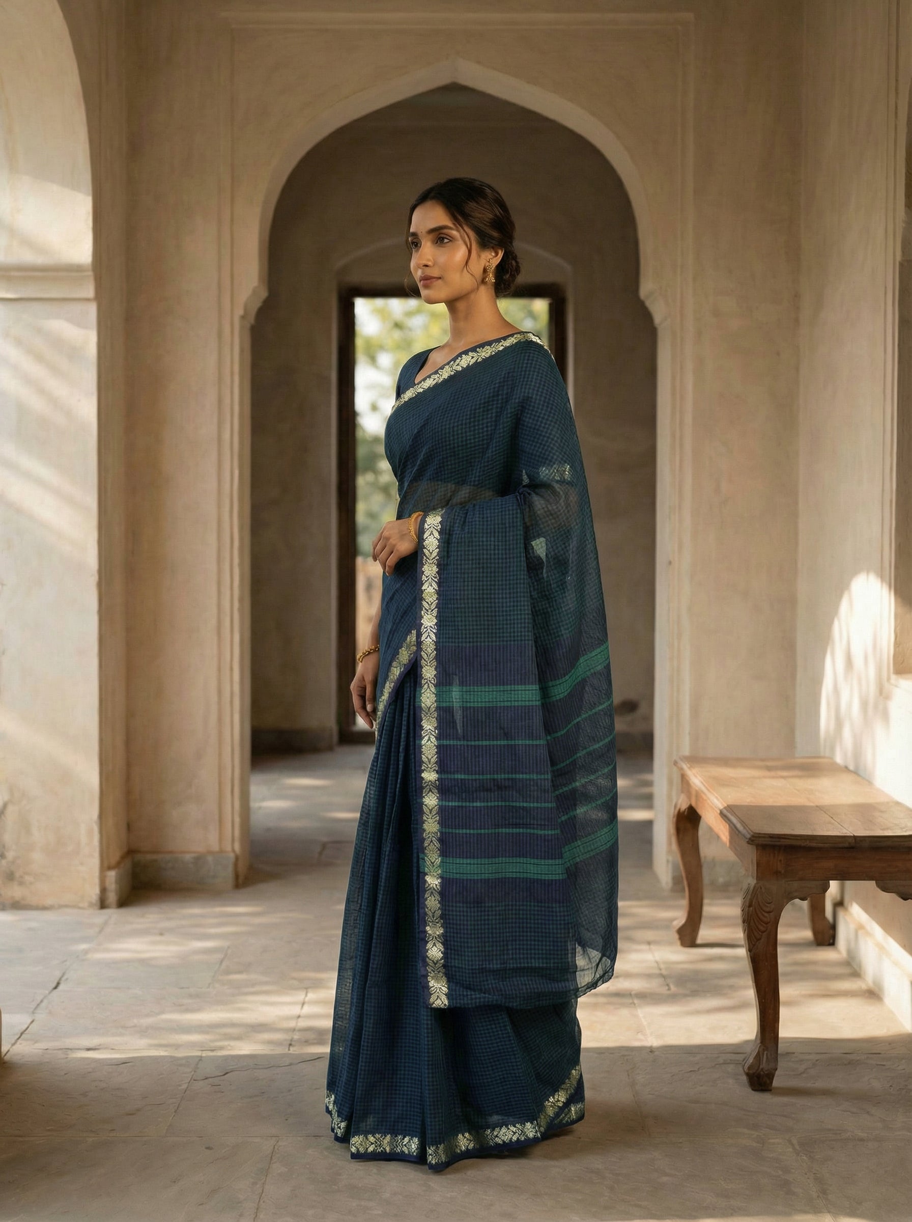 Dive into timeless elegance with this stunning teal green cotton saree that's perfect for any occasion. The fabric features delicate fine checks throughout, creating a subtle texture that catches the light beautifully. A charming floral border adds a touch of traditional grace, while the striped pallu brings a modern twist to this classic piece. Breathable and comfortable for all-day wear, this saree celebrates the perfect blend of heritage craftsmanship and contemporary style. Effortlessly versatile, it's your go-to choice for celebrations, gatherings, or simply making a graceful statement.