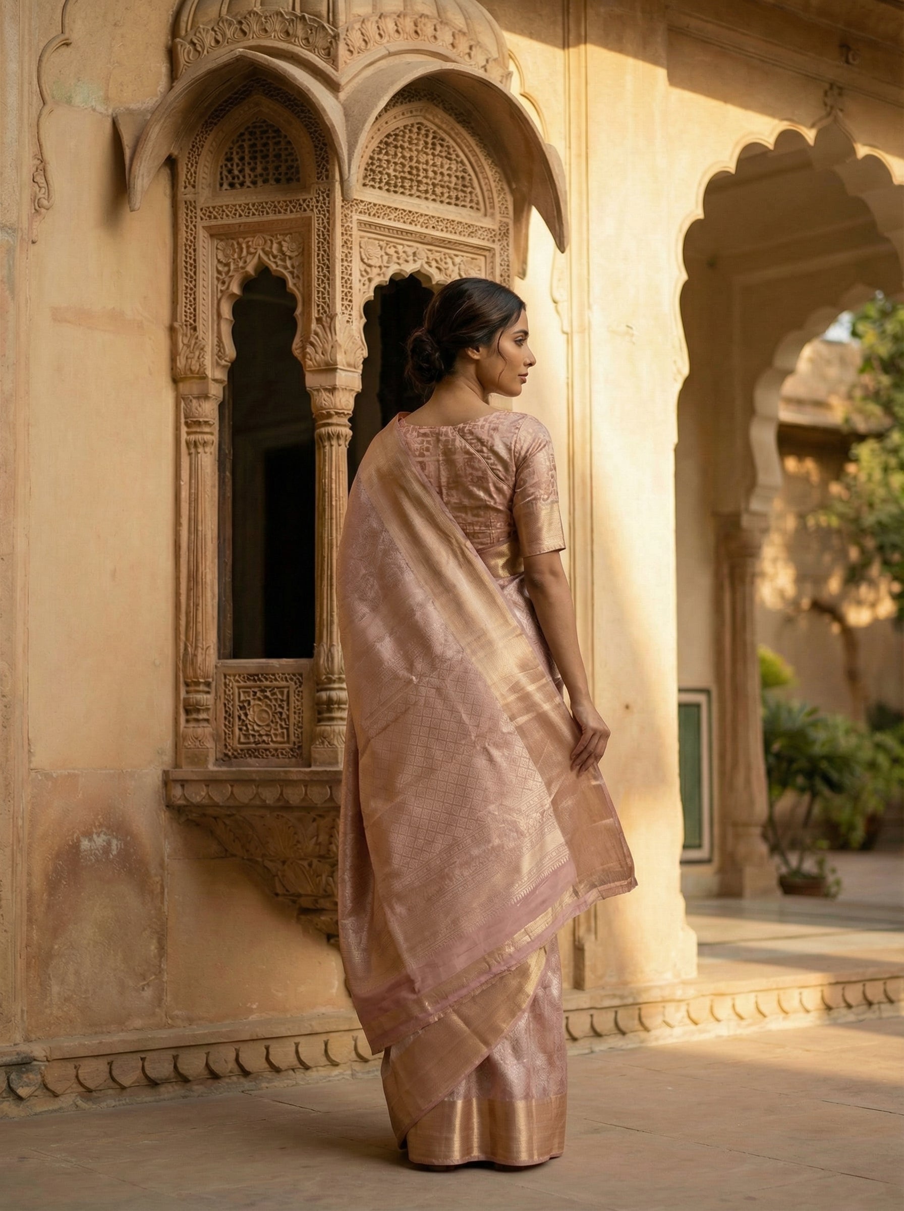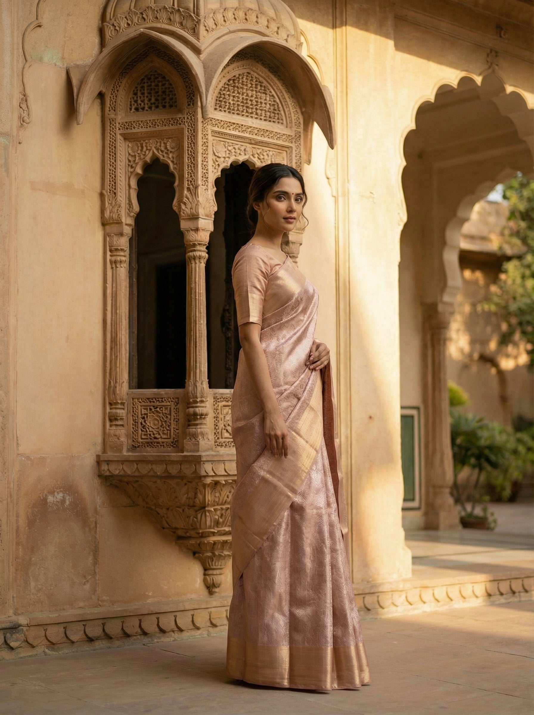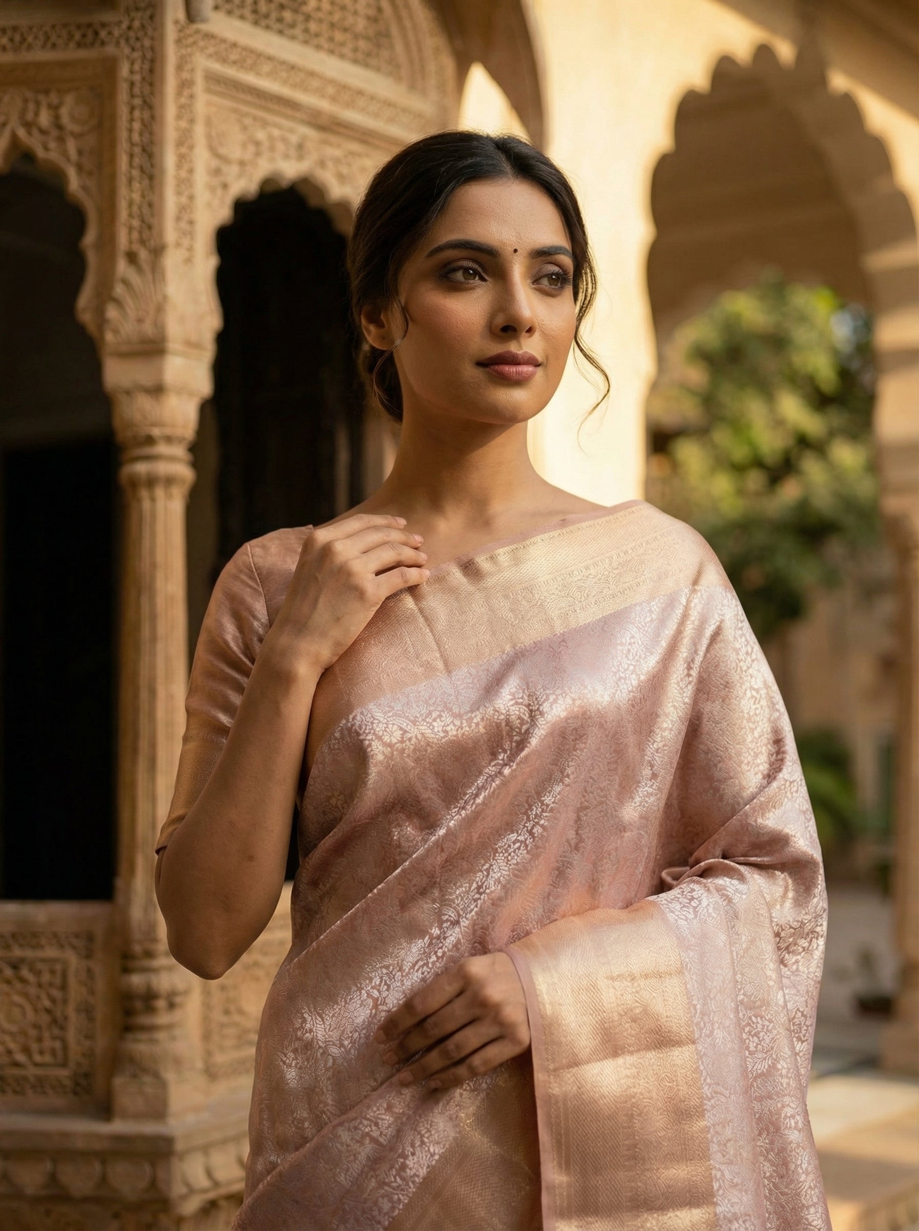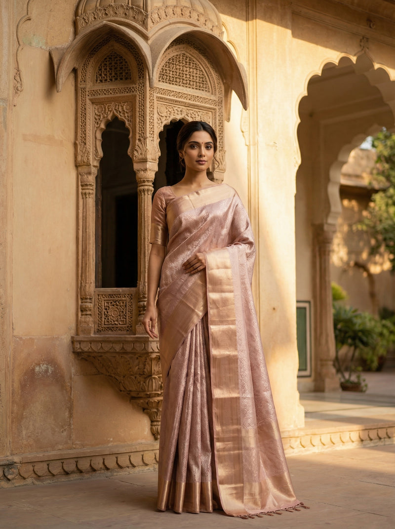Blush Peach Pure Silk Saree with Soft Metallic Sheen and Elegant Self-Weave Finish