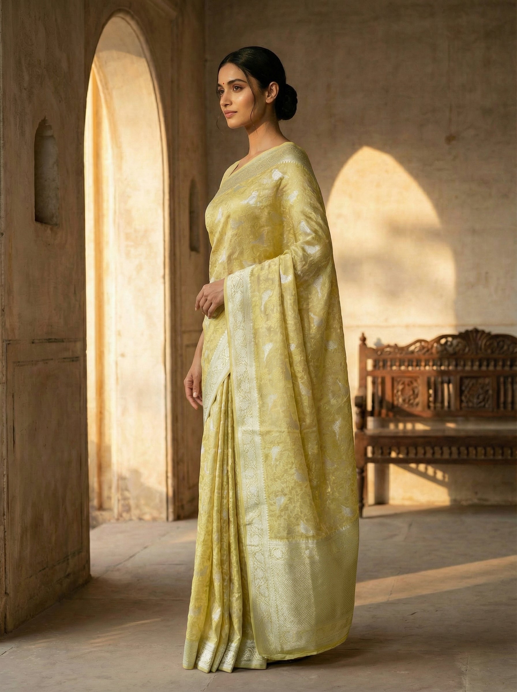 Soft Lemon Yellow Semi Silk Saree with Delicate Silver Motifs and Elegant Woven Border