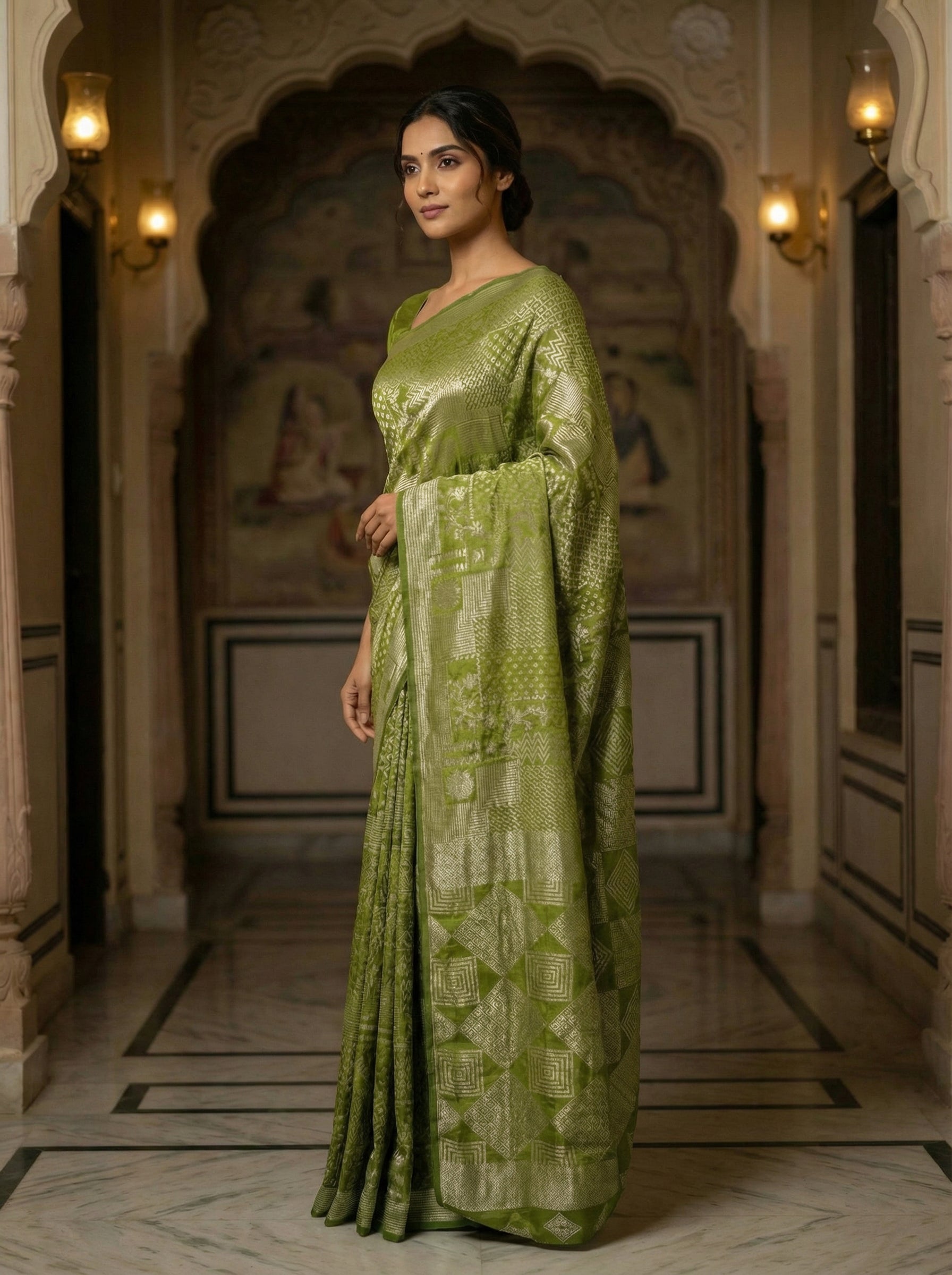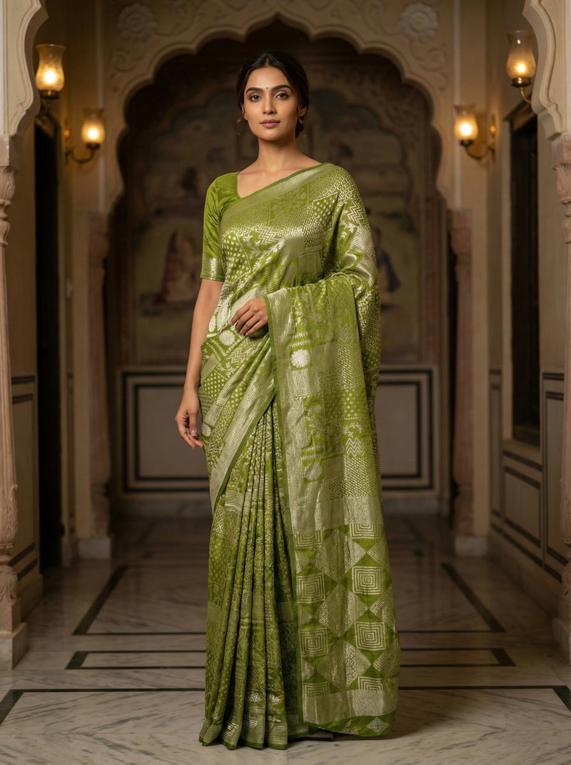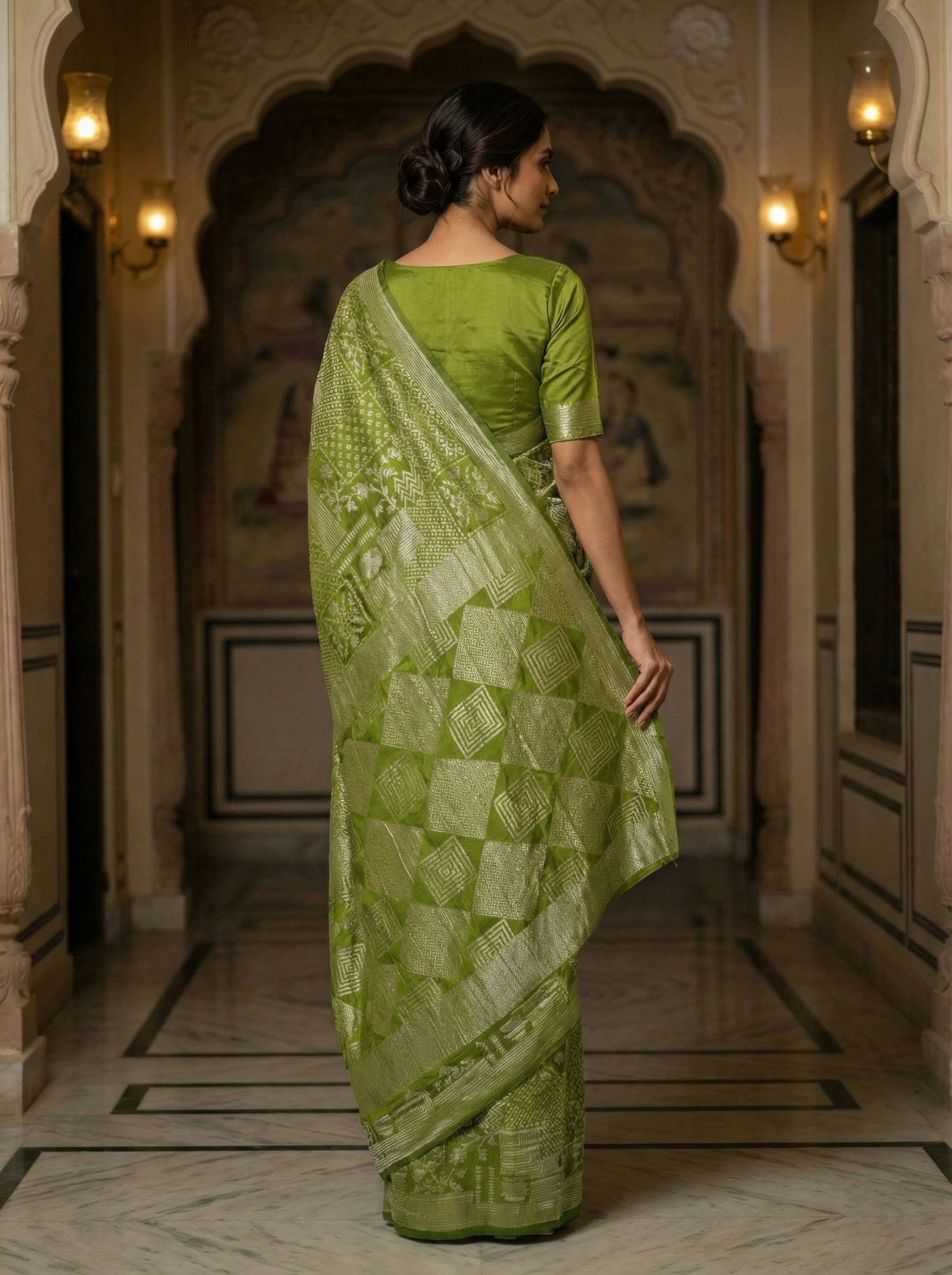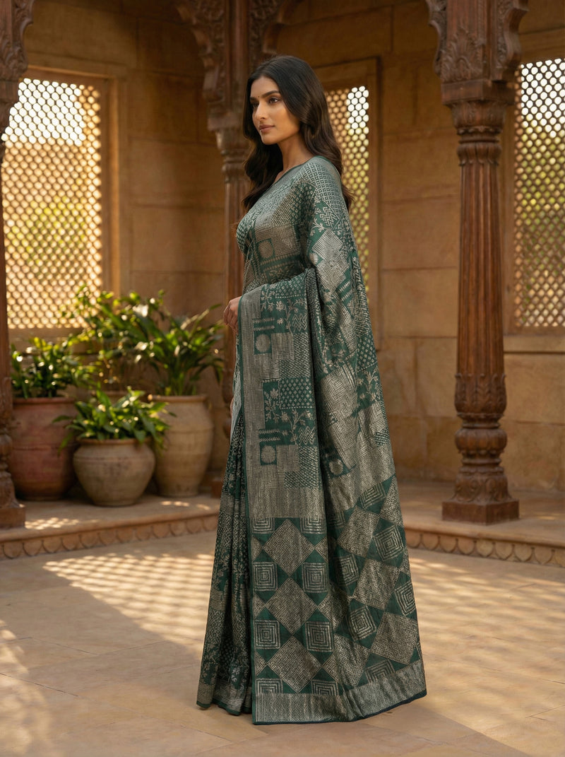 Dive into the enchanting world of this semi-silk saree, where nature's richest hues meet artistic brilliance. The fabric drapes with effortless grace, while intricate patchwork-inspired silver motifs dance across the weave, creating a mesmerizing interplay of light and shadow. Perfect for celebrations that call for understated elegance with a creative twist, this saree brings together traditional craftsmanship and contemporary design. Whether you're attending a festive gathering or making a sophisticated statement, this piece transforms you into a walking canvas of timeless beauty and playful sophistication.